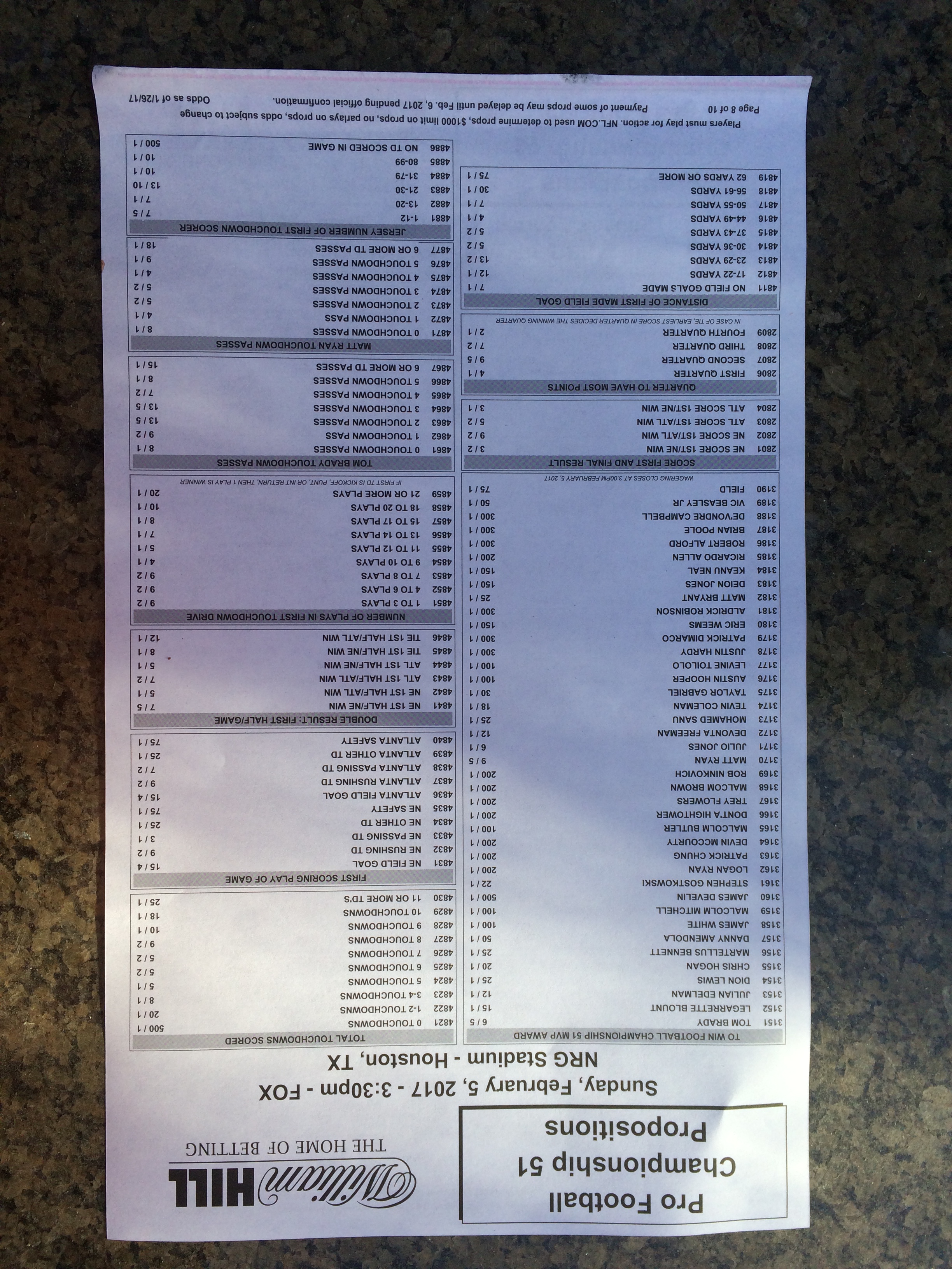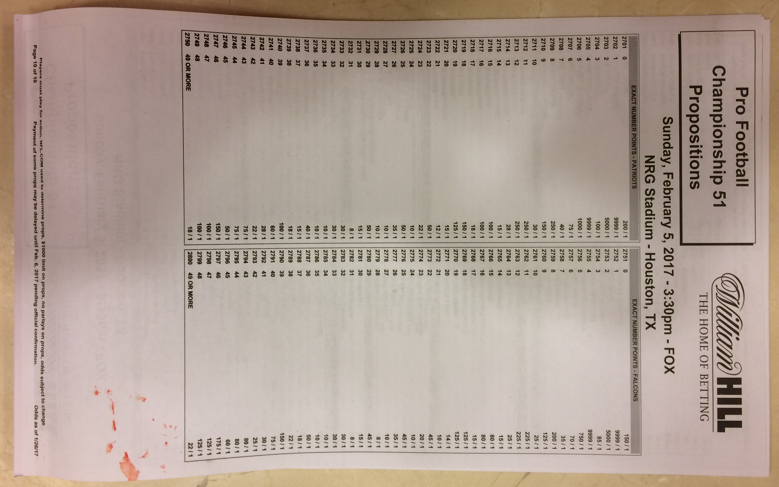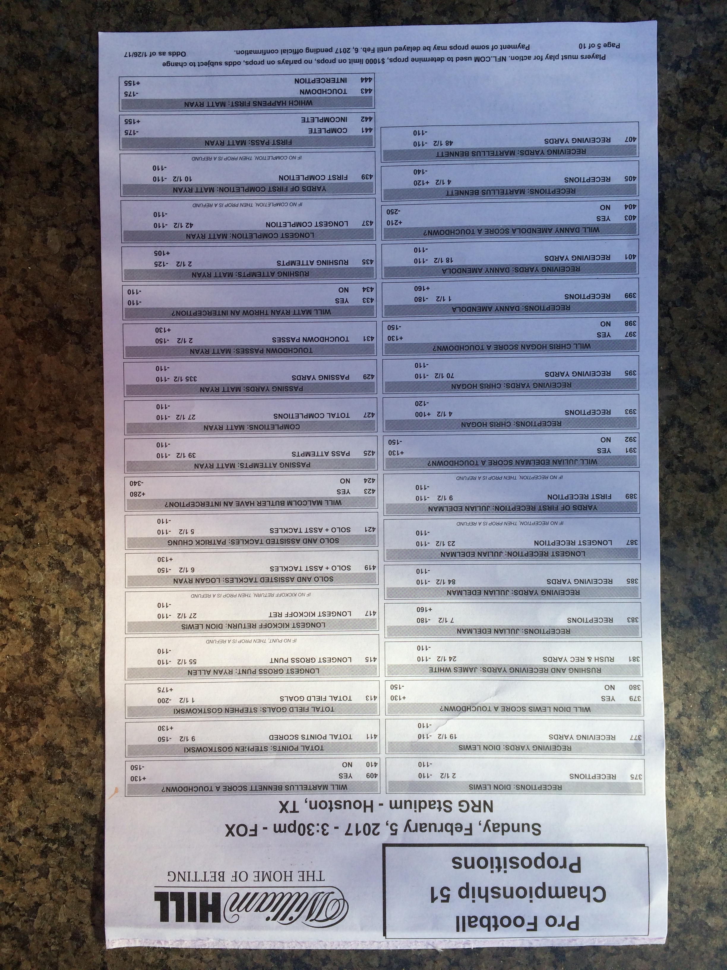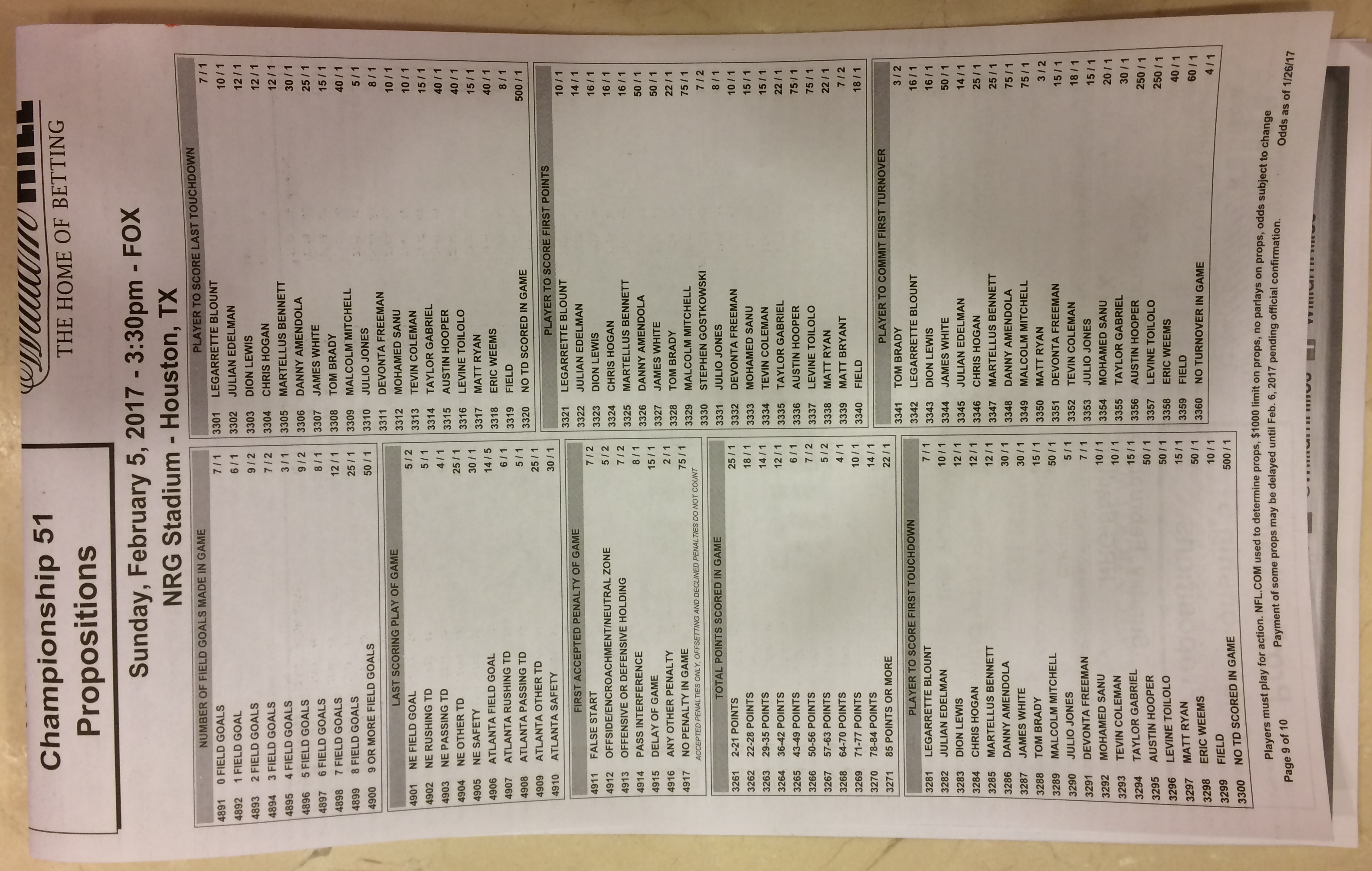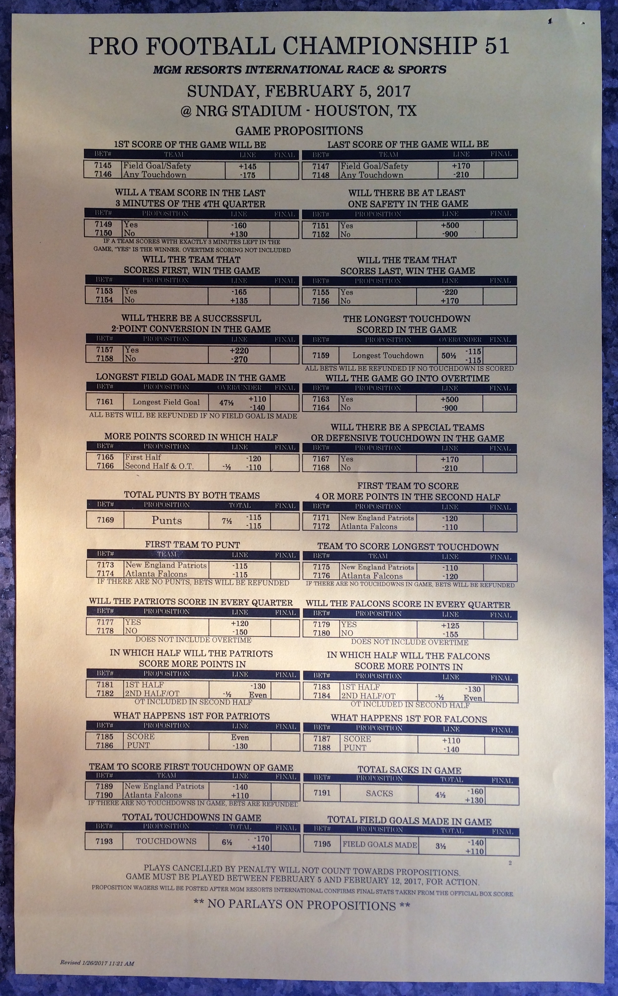 今年の予想はお伝えできませんが、少なくともどんなものがあるかは分かります。こちらは第51回スーパーボウルのプロップシートの写真です。試合開始まで数日中に、さらに追加される予定です。