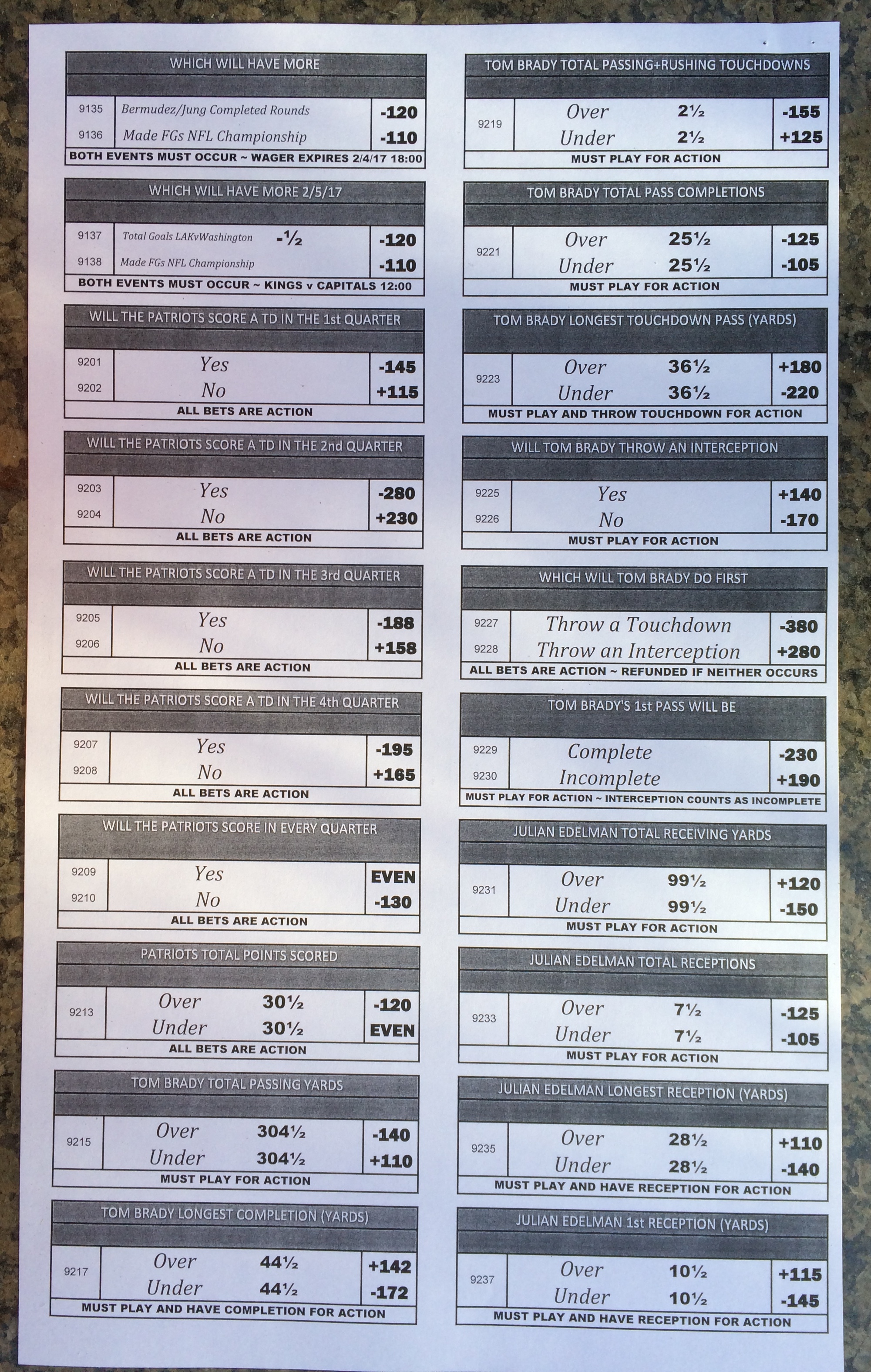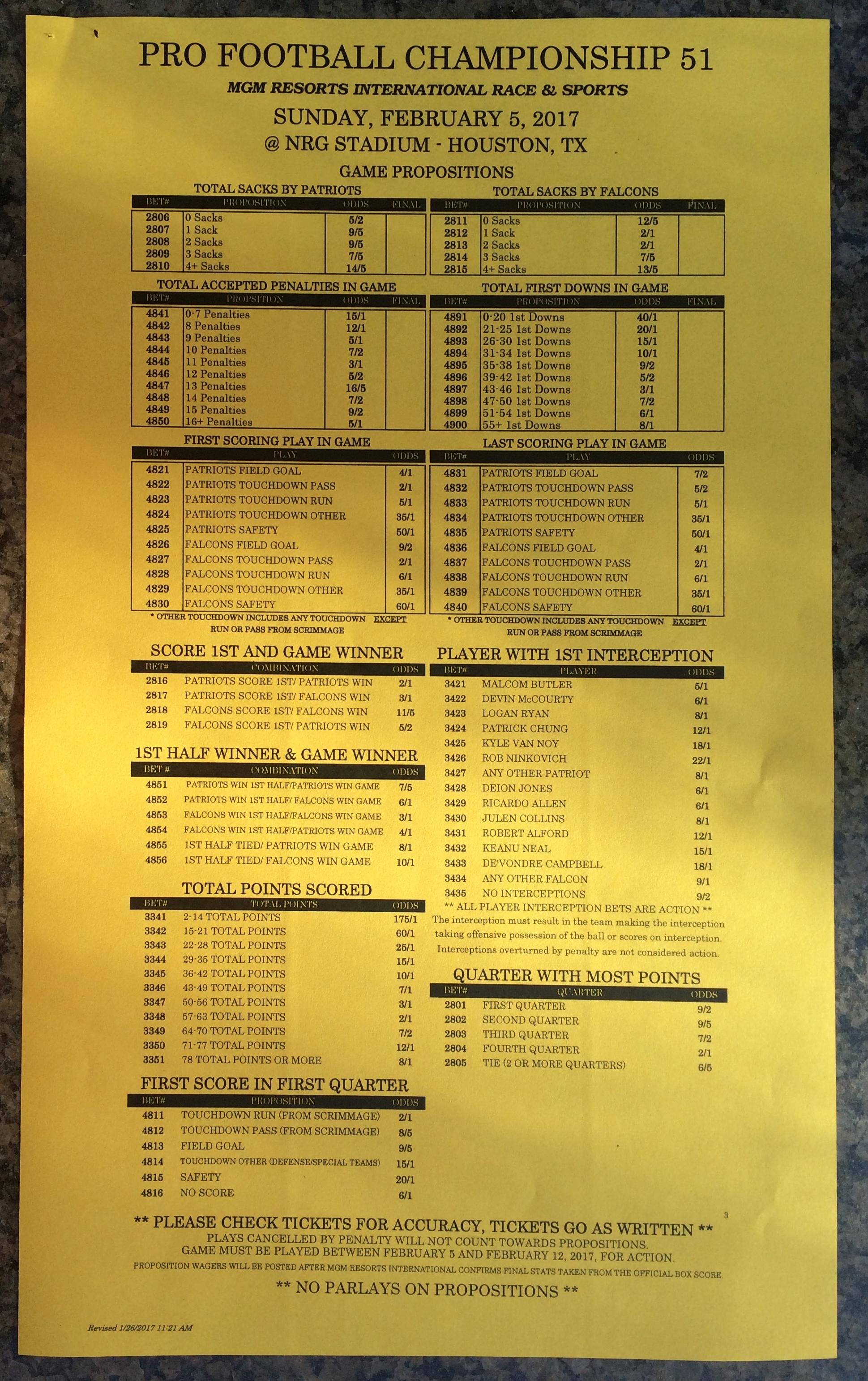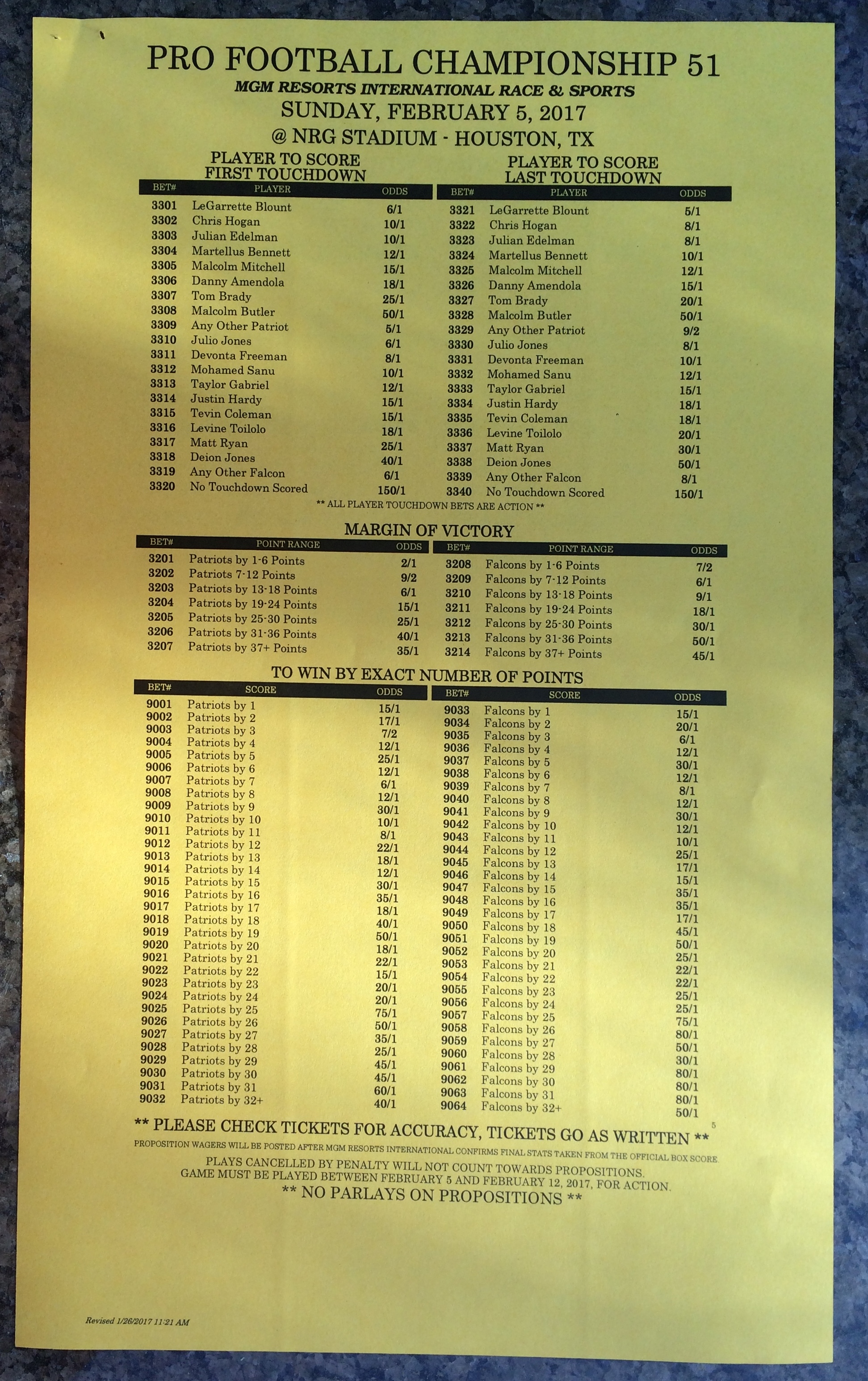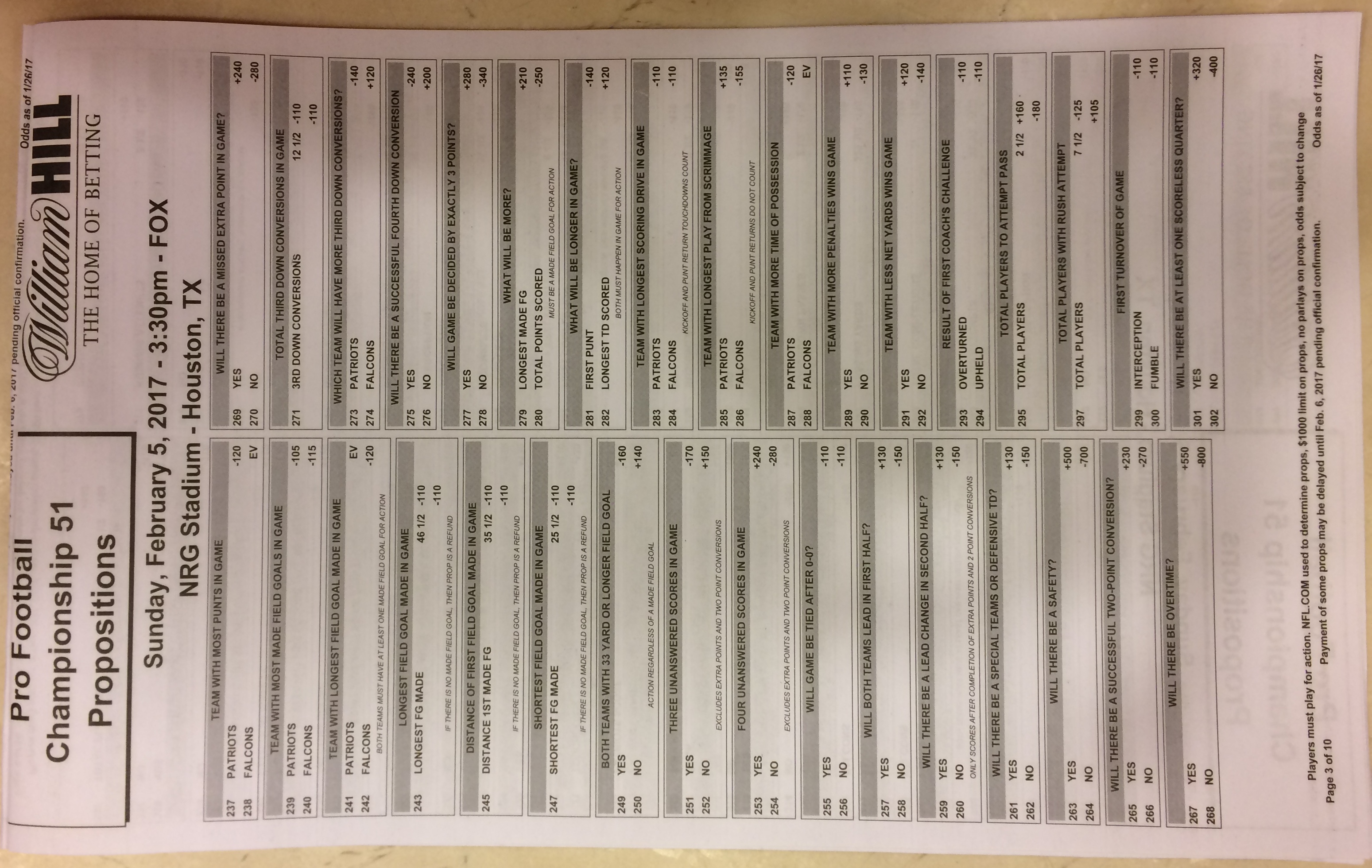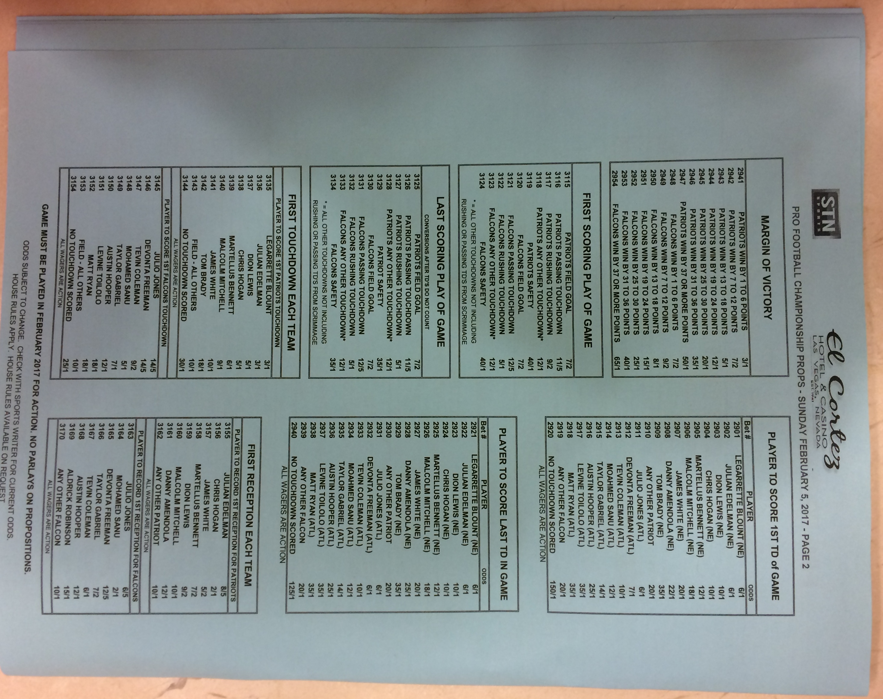 今年の予想はお伝えできませんが、少なくともどんなものがあるかは分かります。こちらは第51回スーパーボウルのプロップシートの写真です。試合開始まで数日中に、さらに追加される予定です。