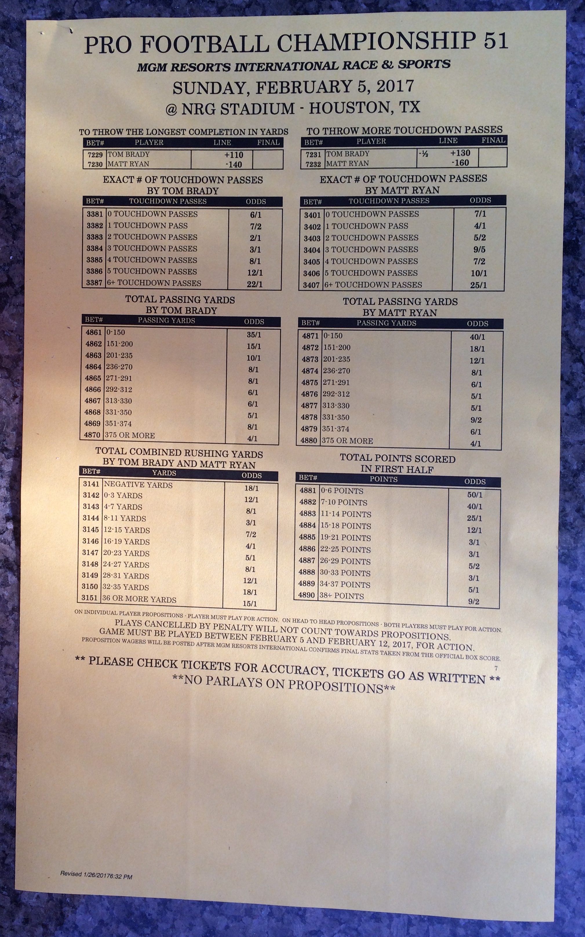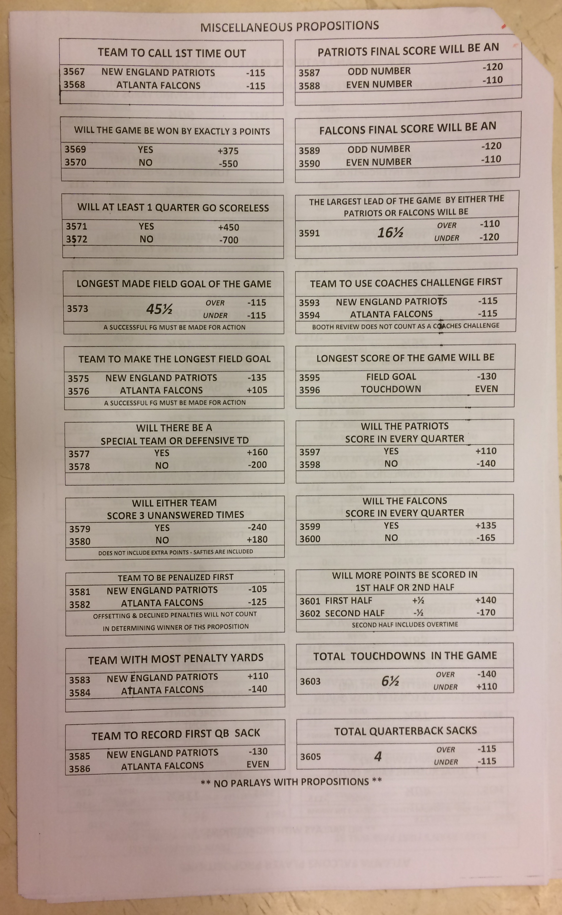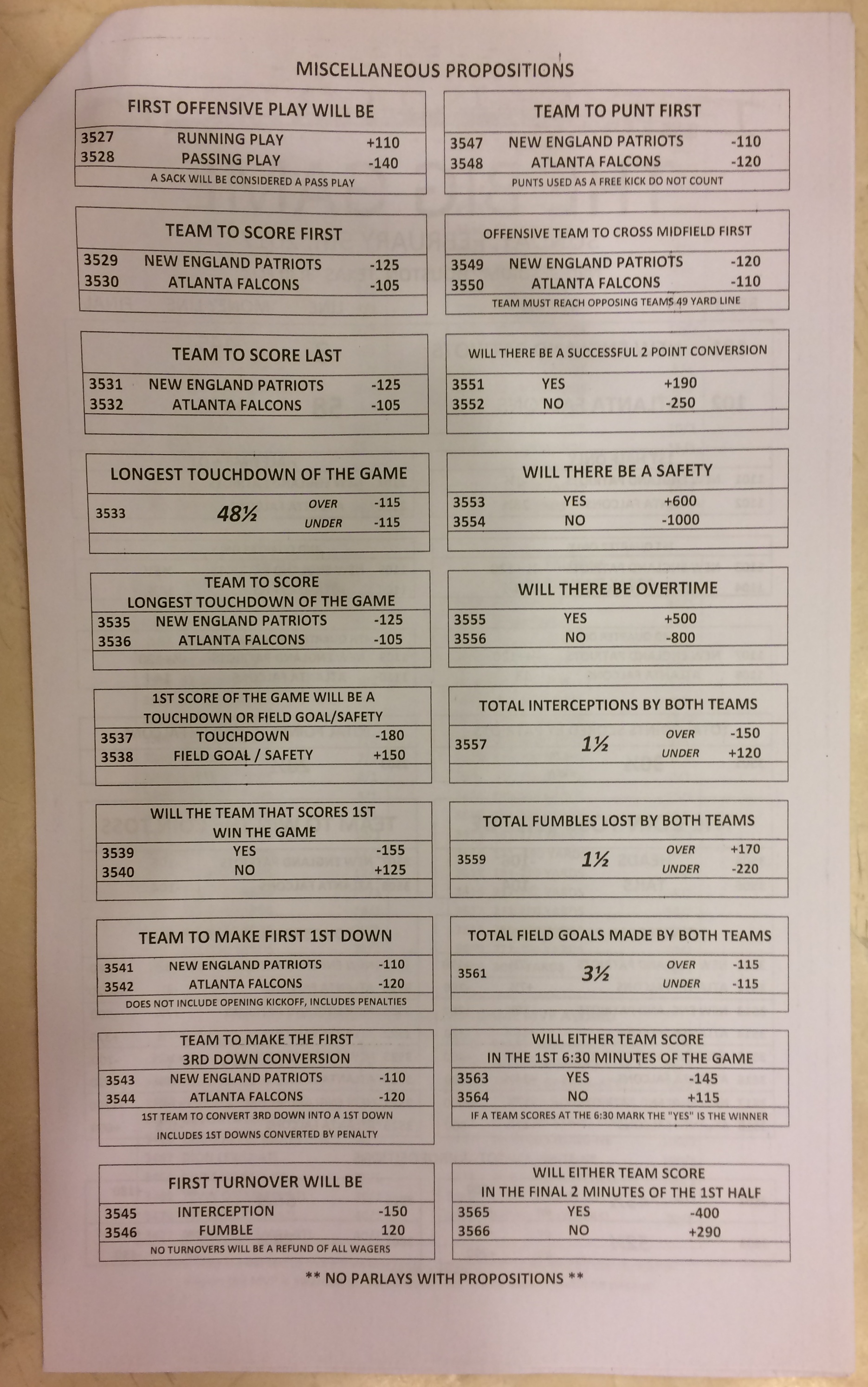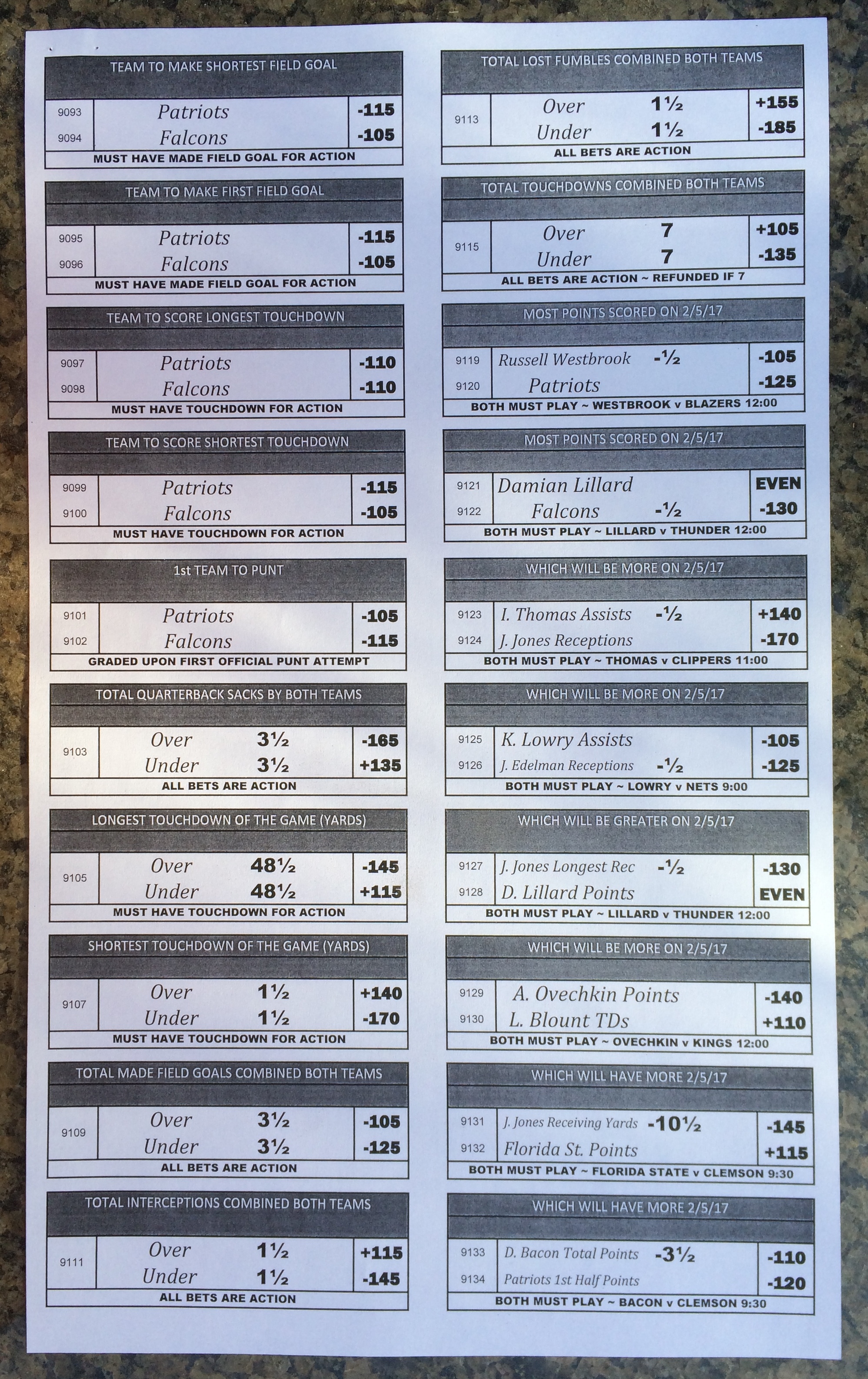 今年の予想はお伝えできませんが、少なくともどんなものがあるかは分かります。こちらは第51回スーパーボウルのプロップシートの写真です。試合開始まで数日中に、さらに追加される予定です。