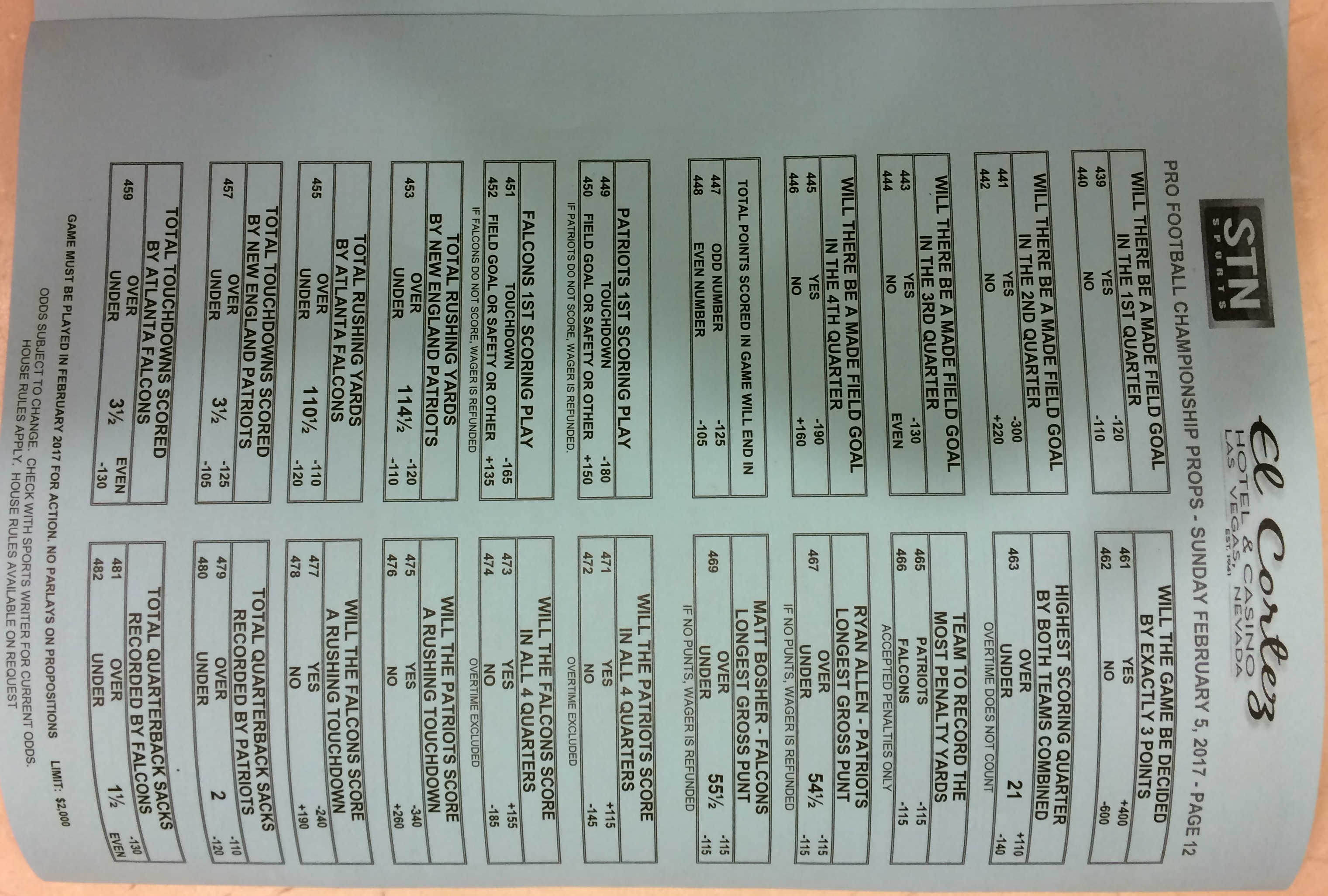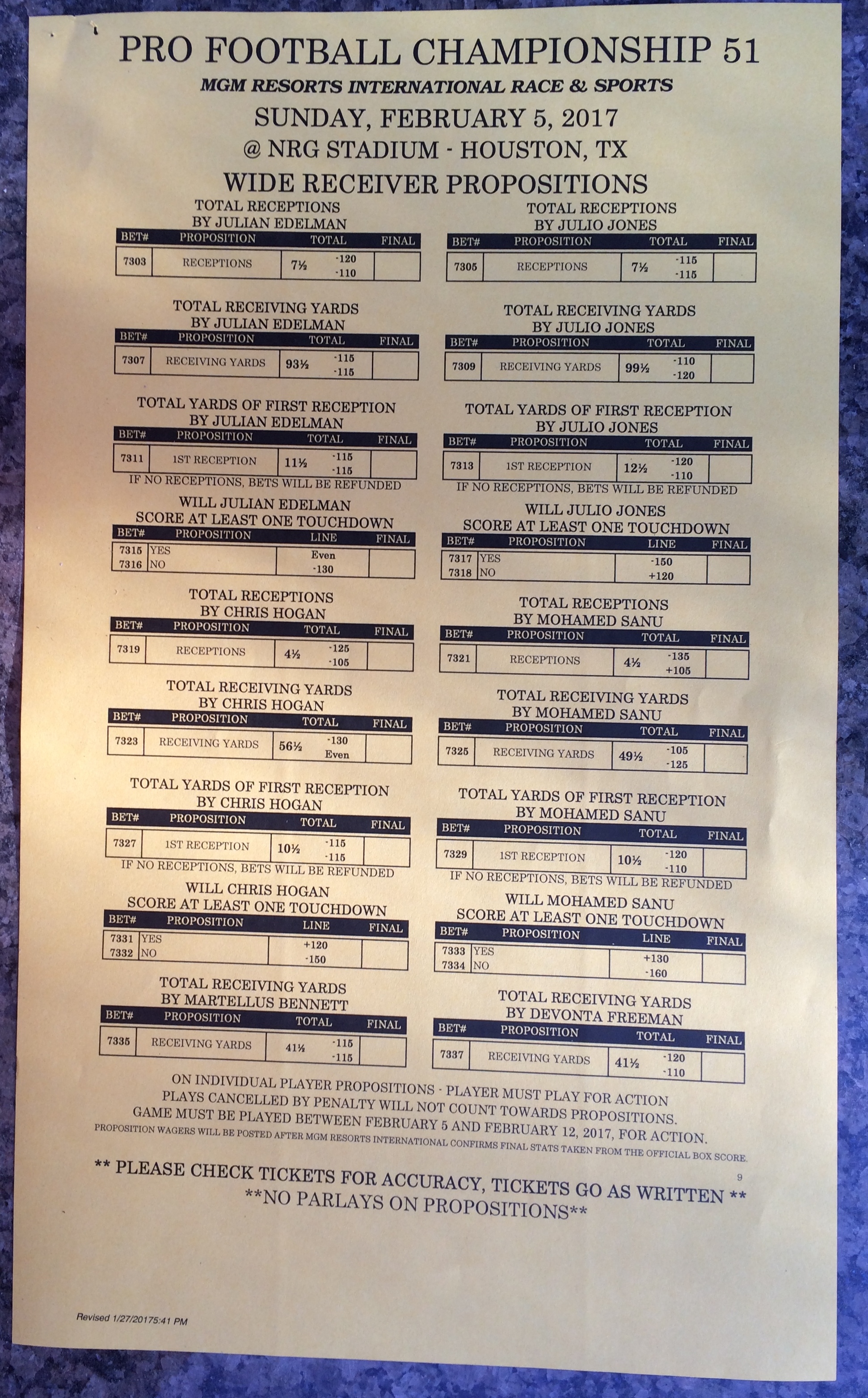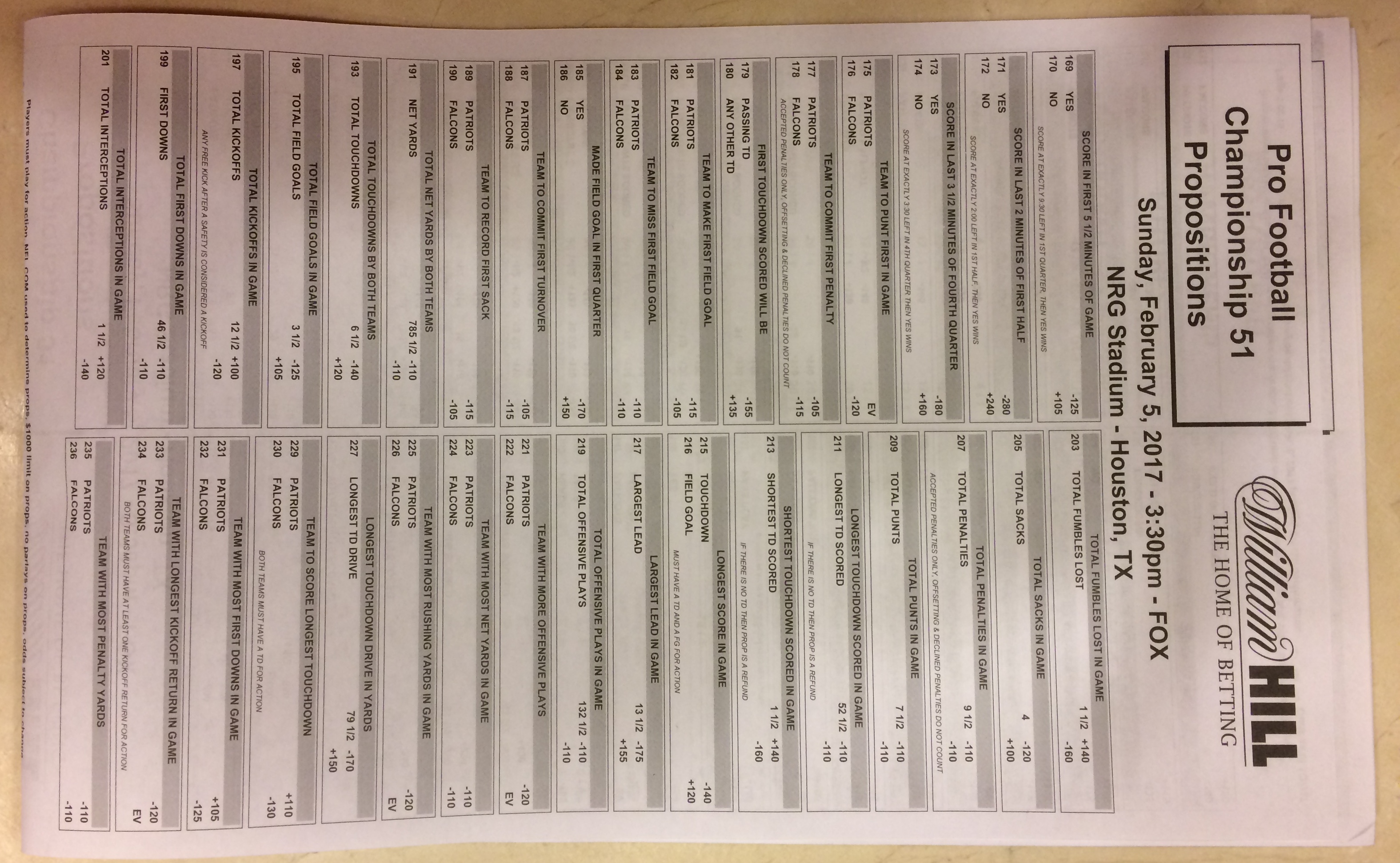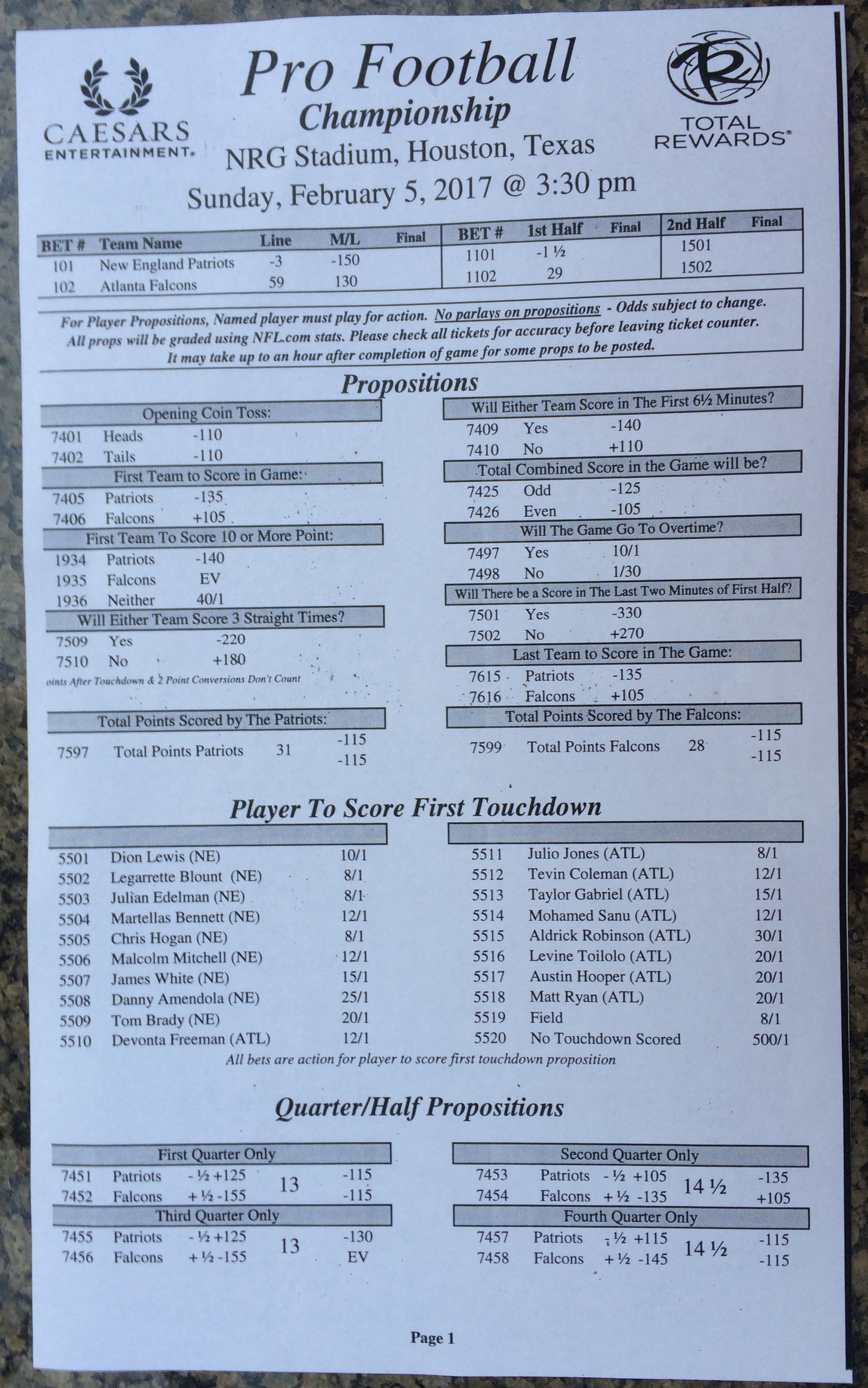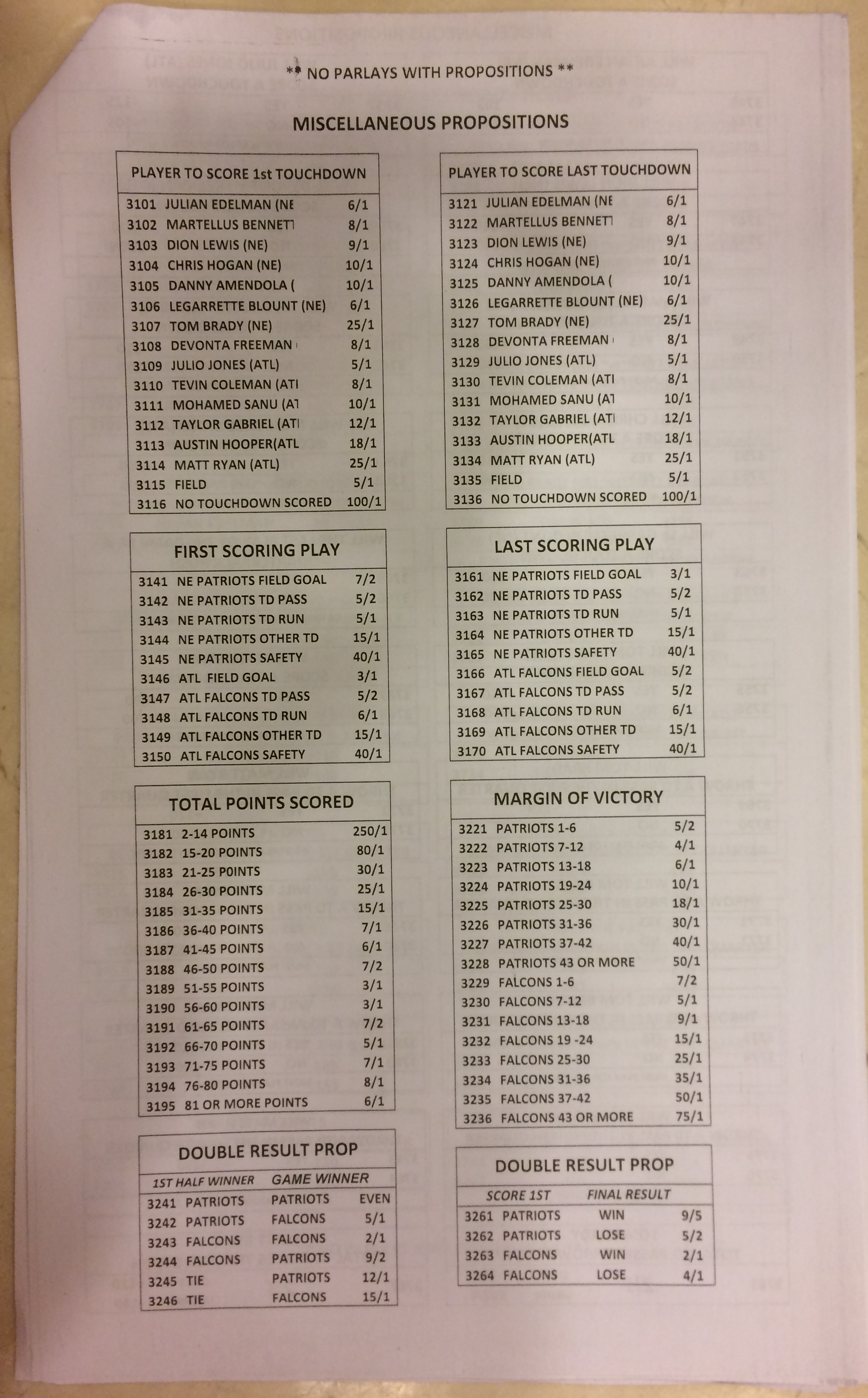 今年の予想はお伝えできませんが、少なくともどんなものがあるかは分かります。こちらは第51回スーパーボウルのプロップシートの写真です。試合開始まで数日中に、さらに追加される予定です。