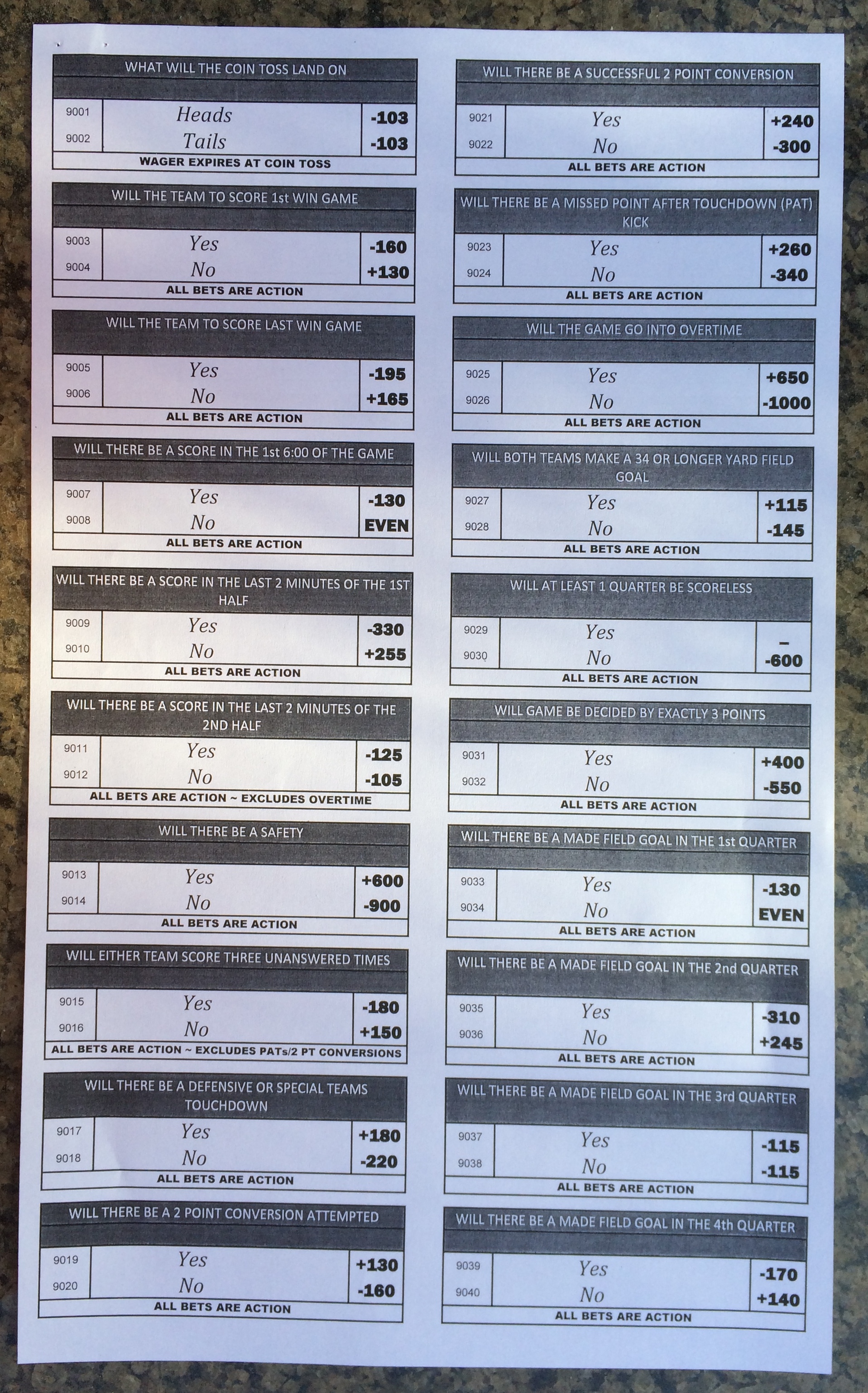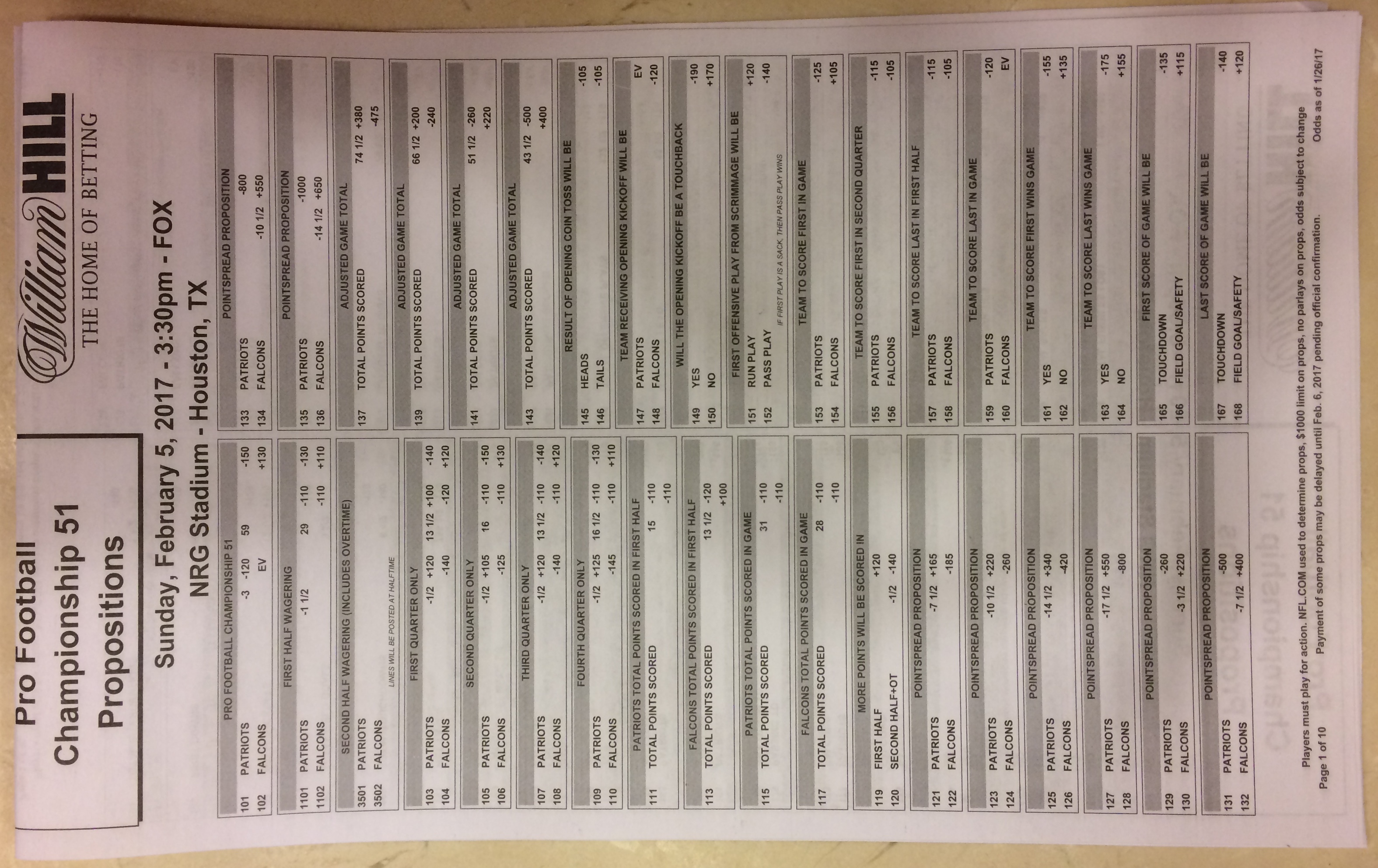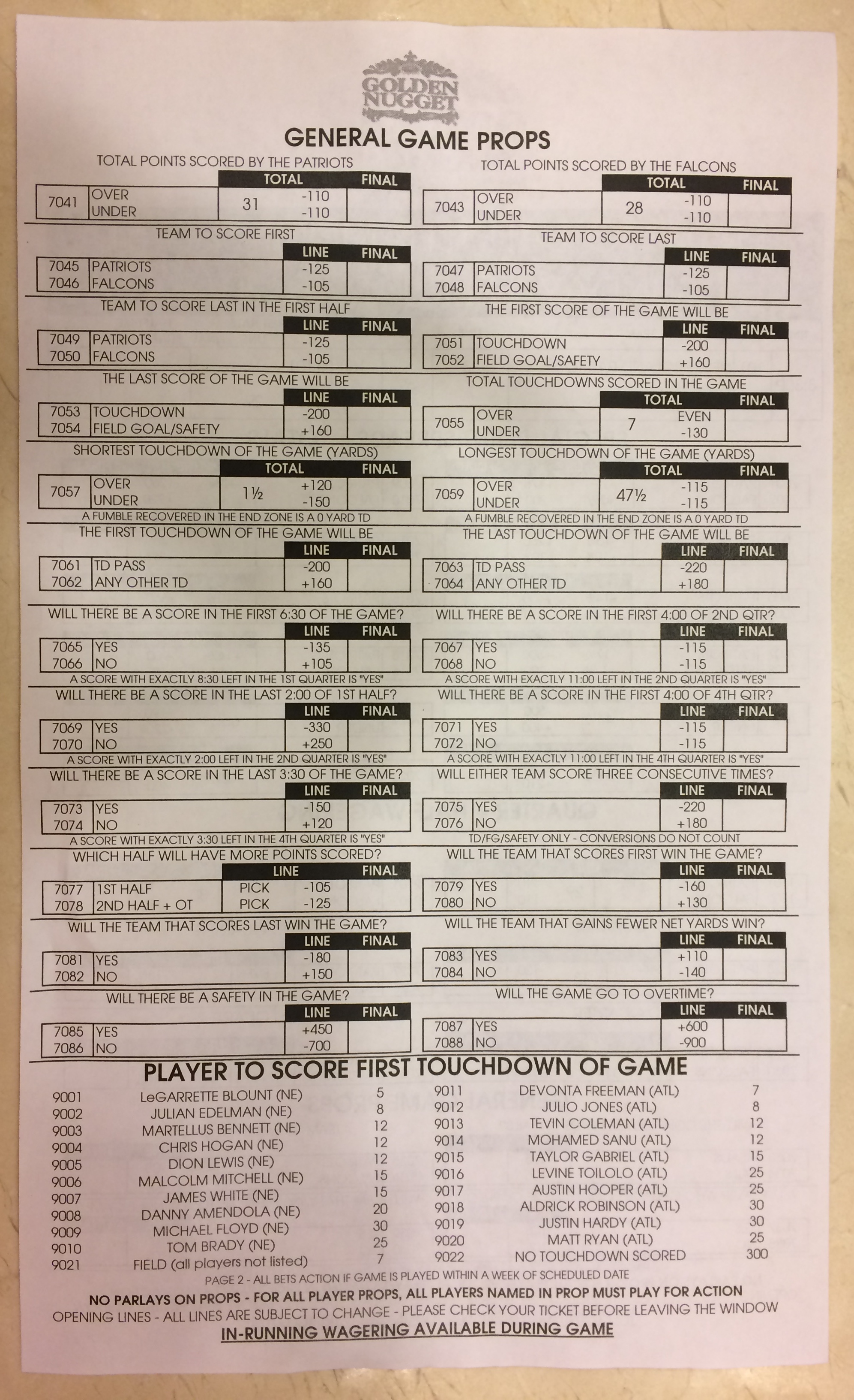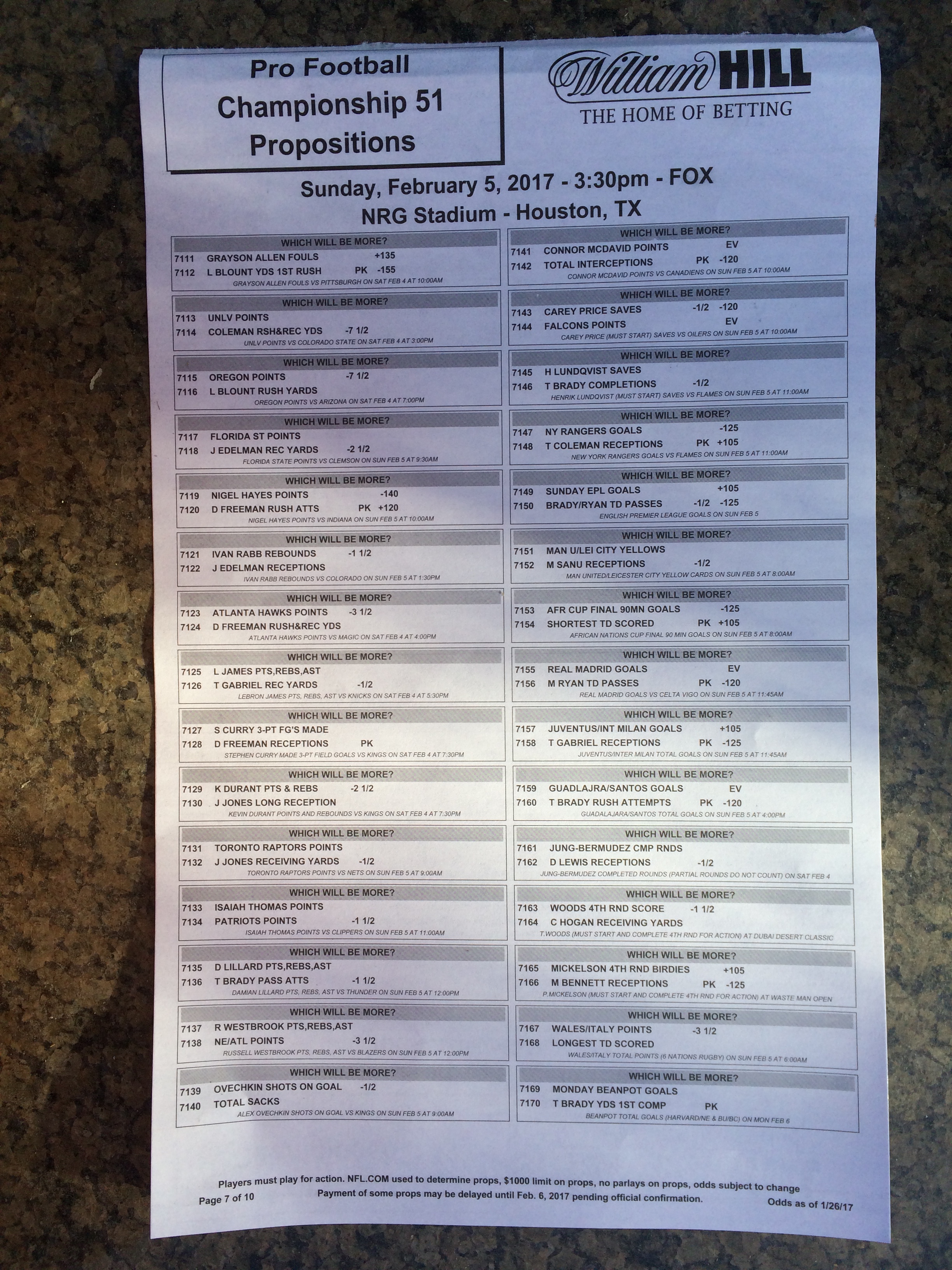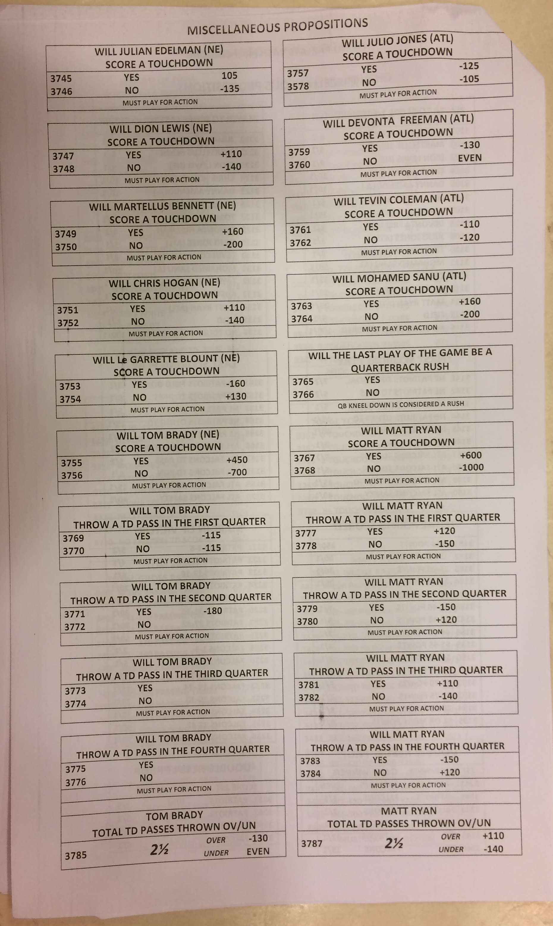 今年の予想はお伝えできませんが、少なくともどんなものがあるかは分かります。こちらは第51回スーパーボウルのプロップシートの写真です。試合開始まで数日中に、さらに追加される予定です。