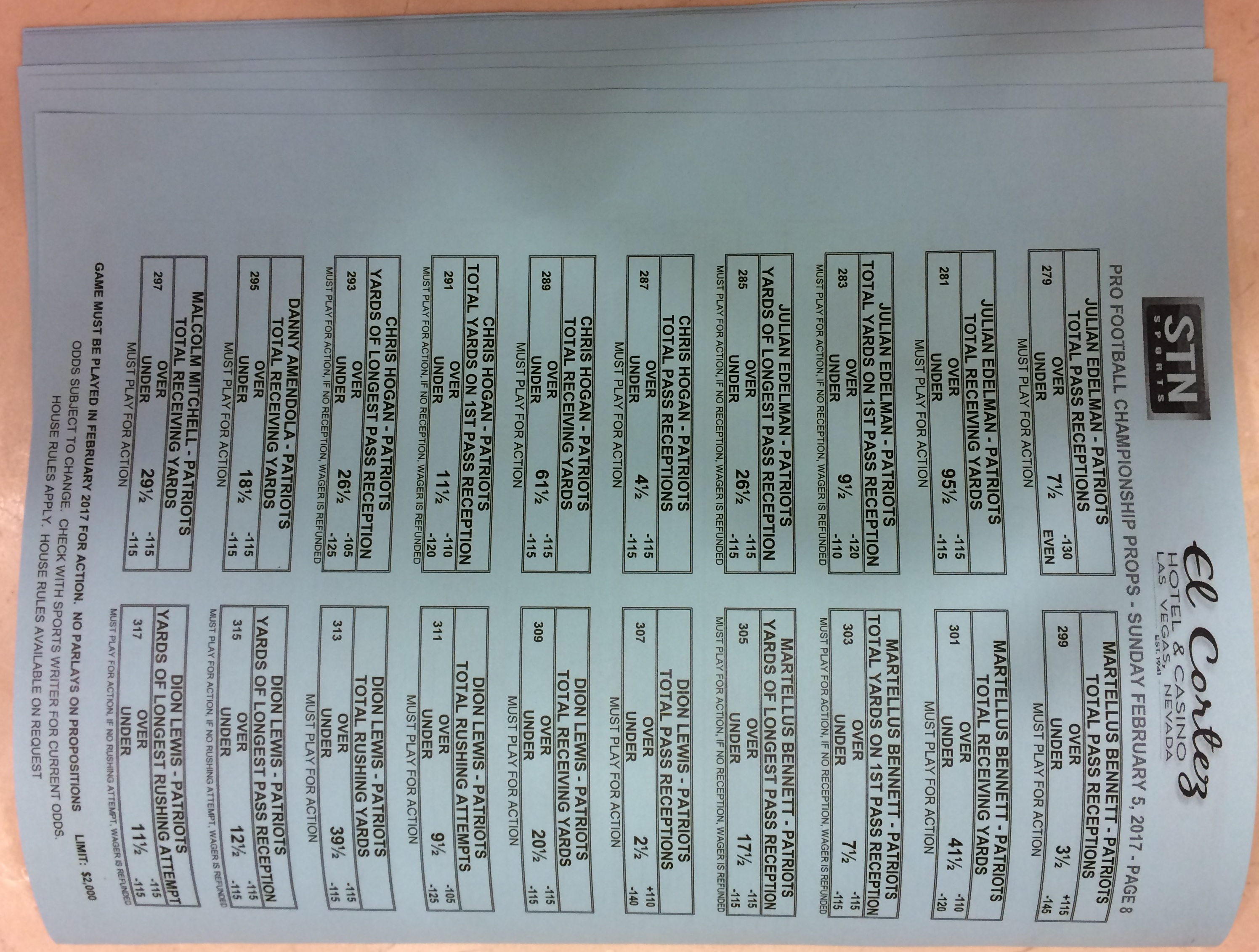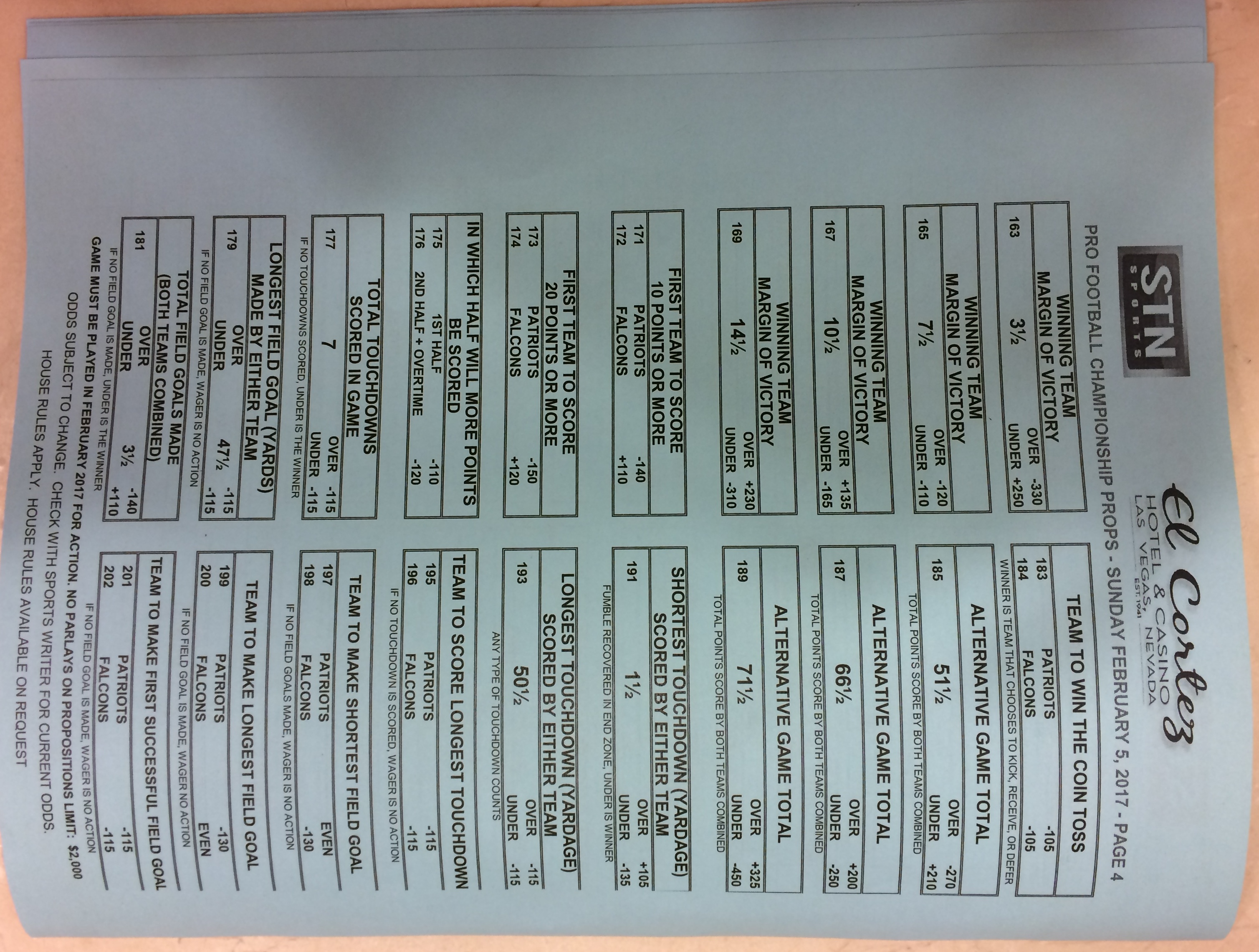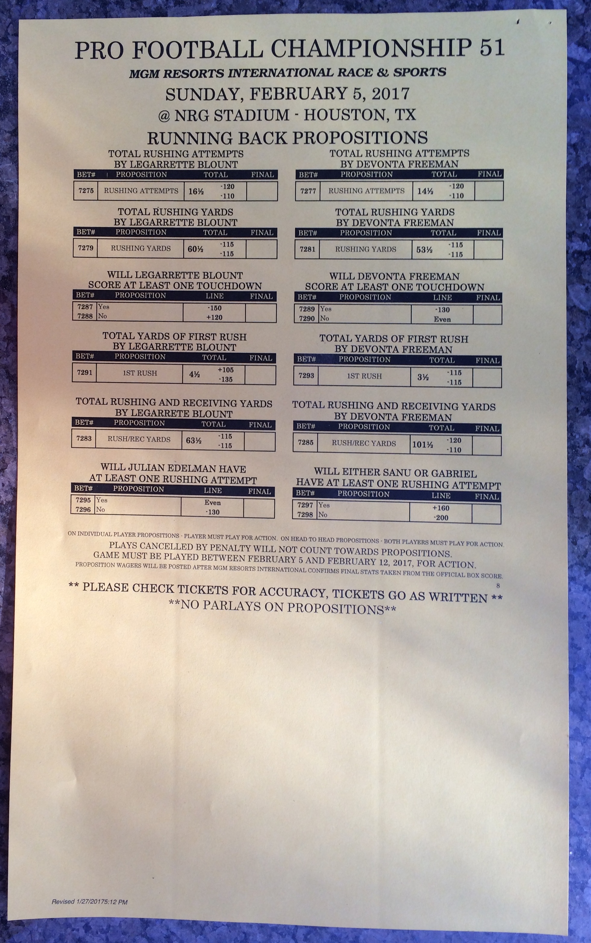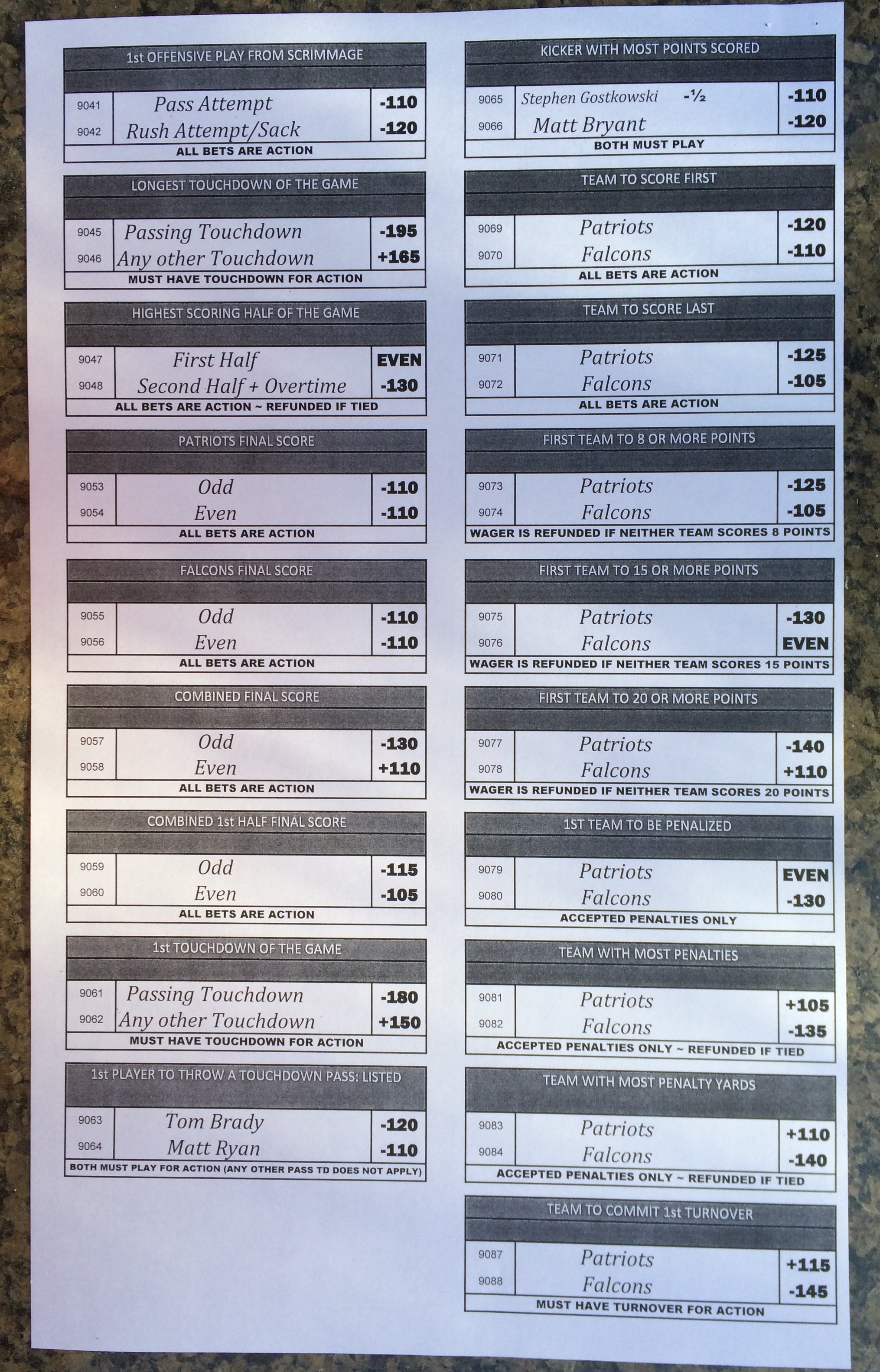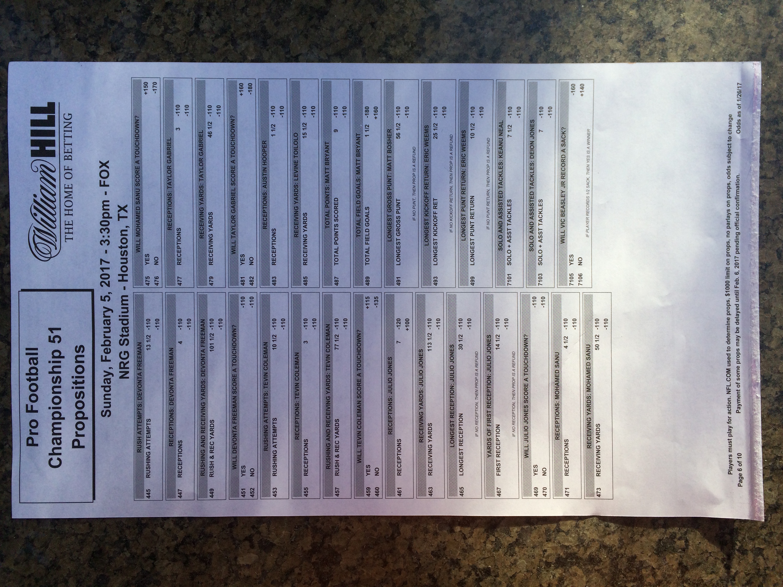 今年の予想はお伝えできませんが、少なくともどんなものがあるかは分かります。こちらは第51回スーパーボウルのプロップシートの写真です。試合開始まで数日中に、さらに追加される予定です。