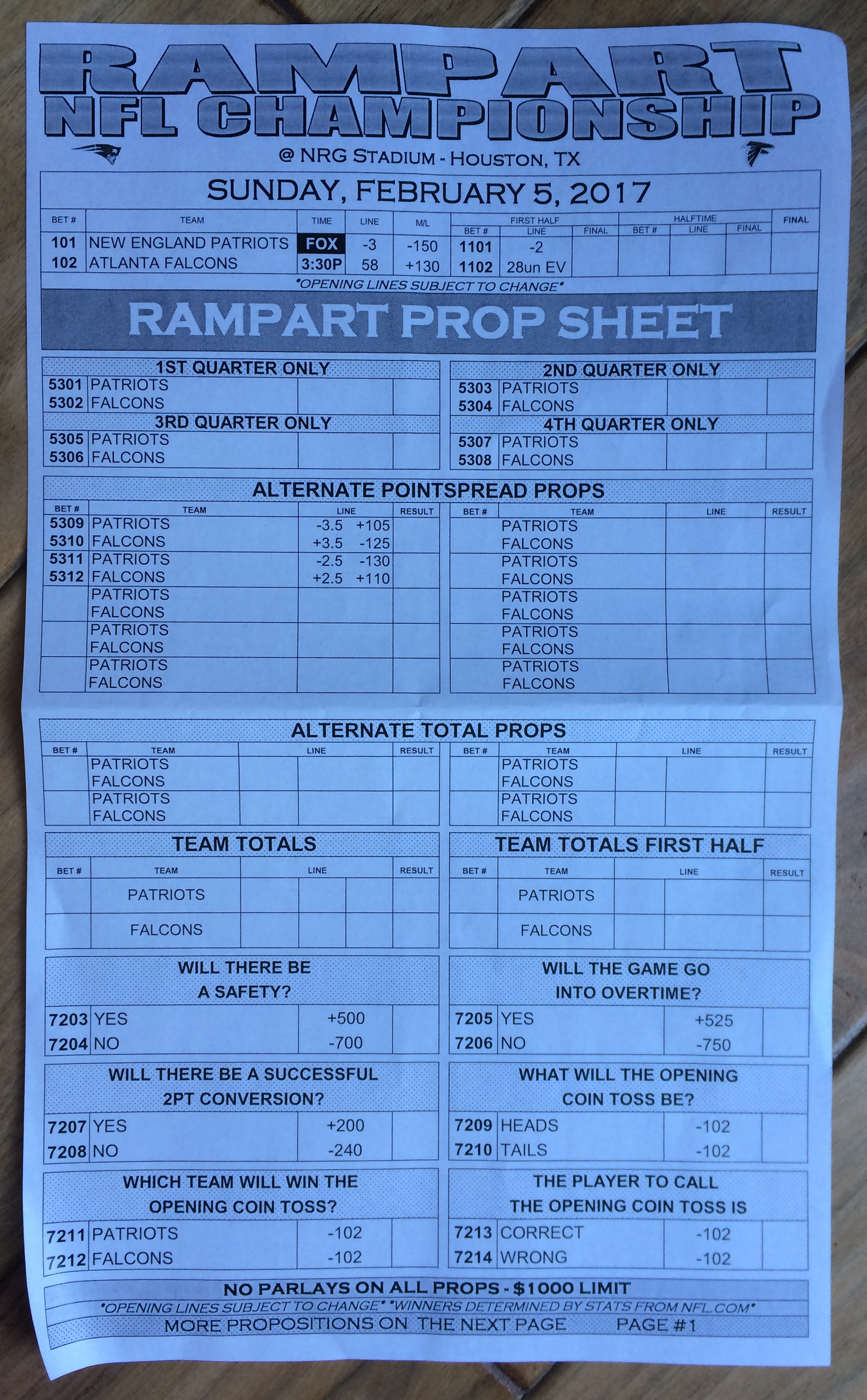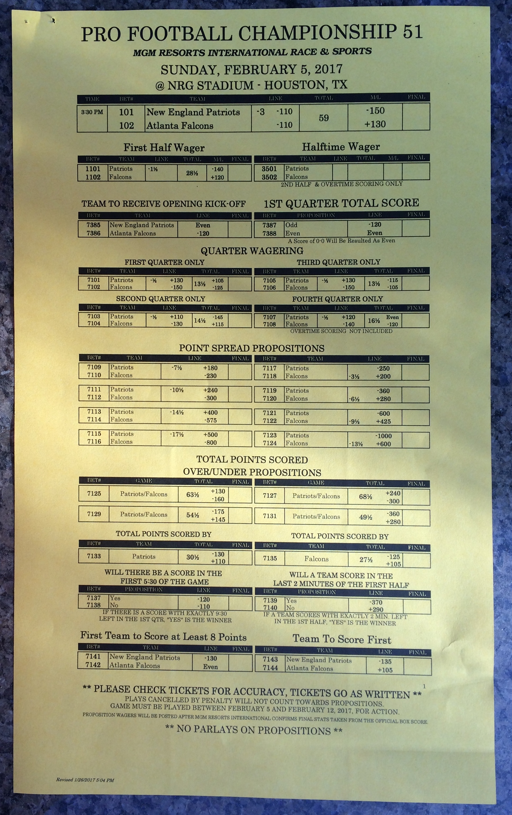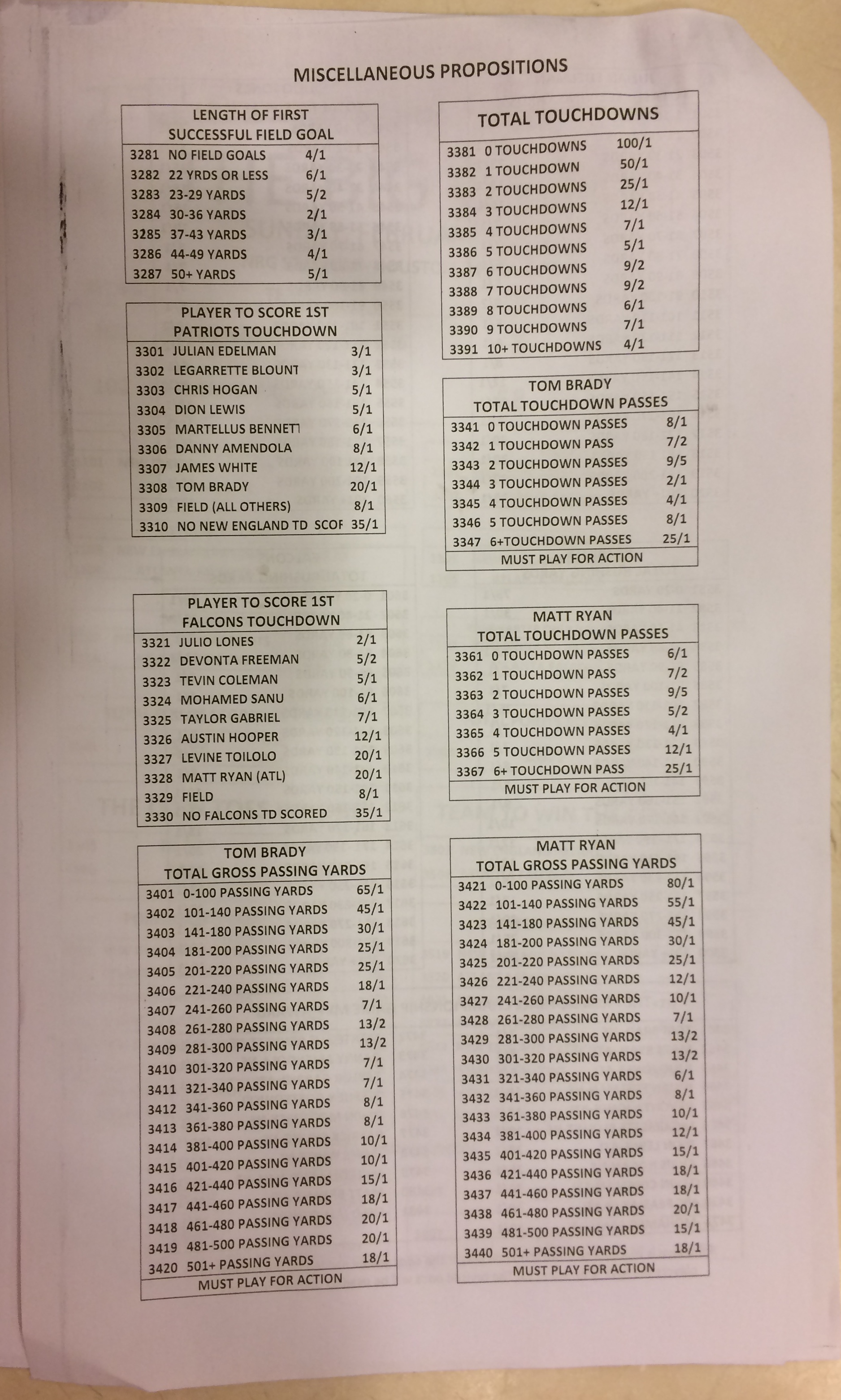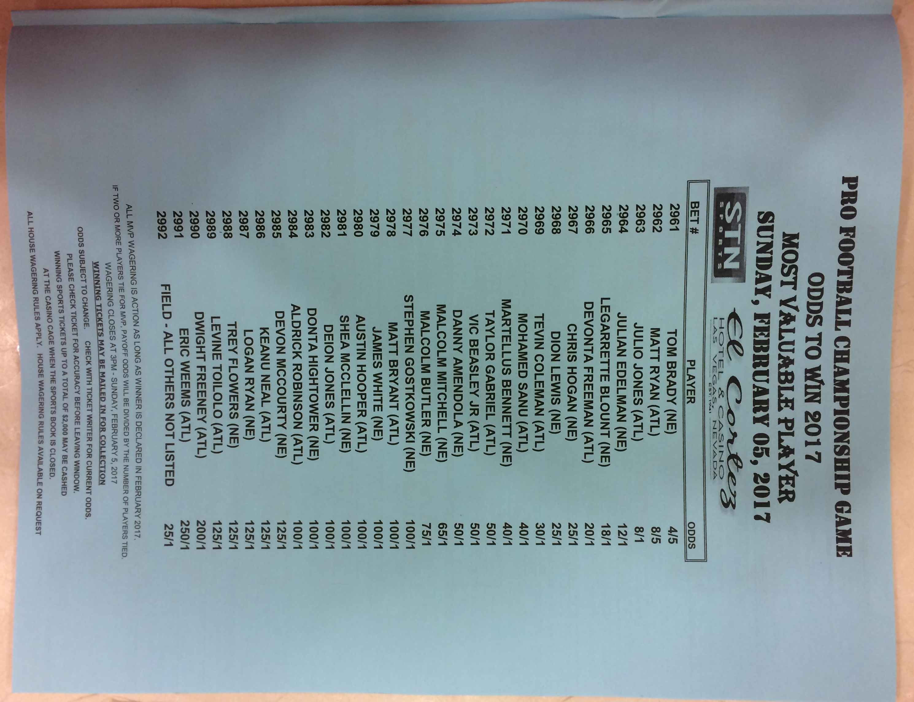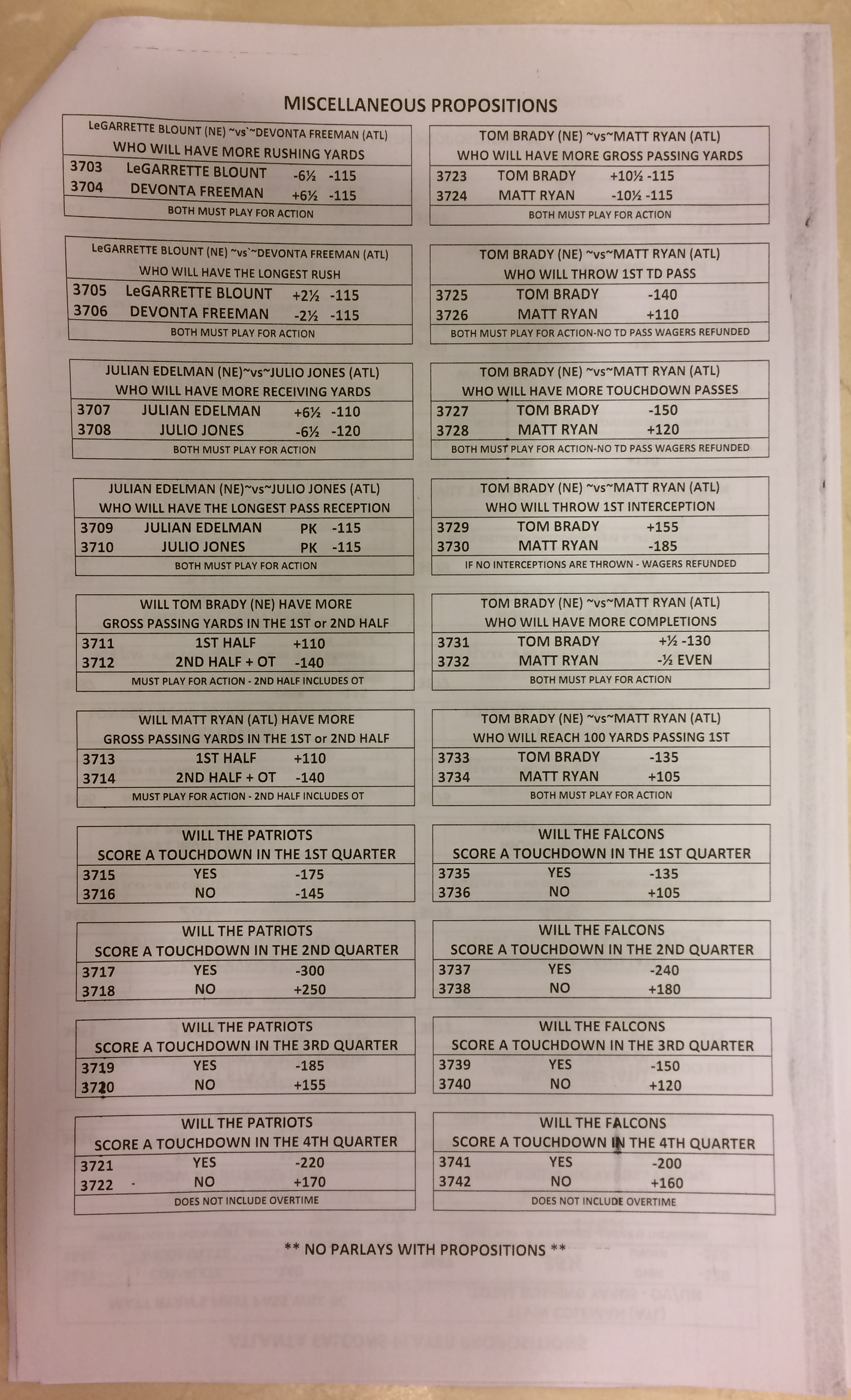今年の予想はお伝えできませんが、少なくともどんなものがあるかは分かります。こちらは第51回スーパーボウルのプロップシートの写真です。試合開始まで数日中に、さらに追加される予定です。