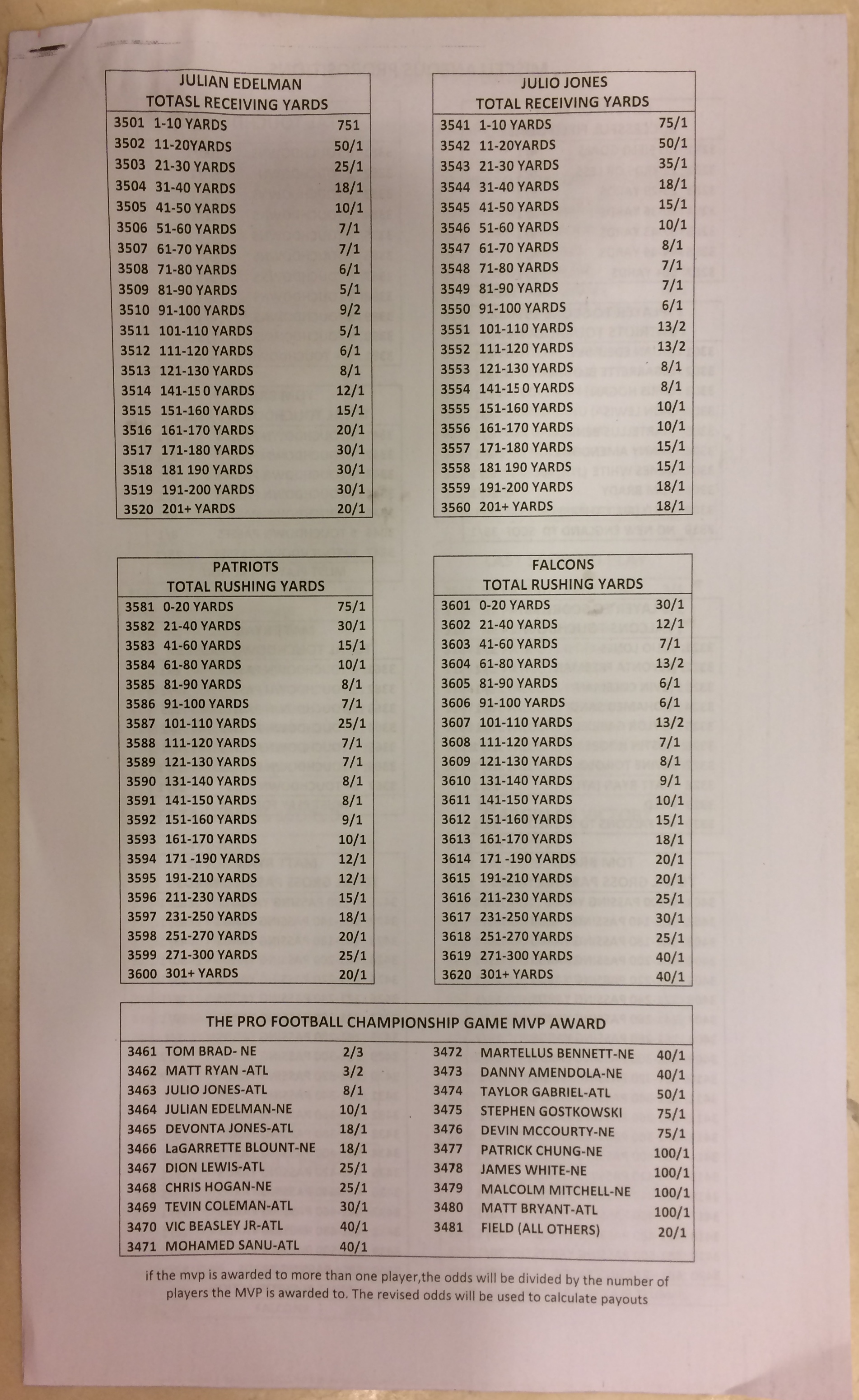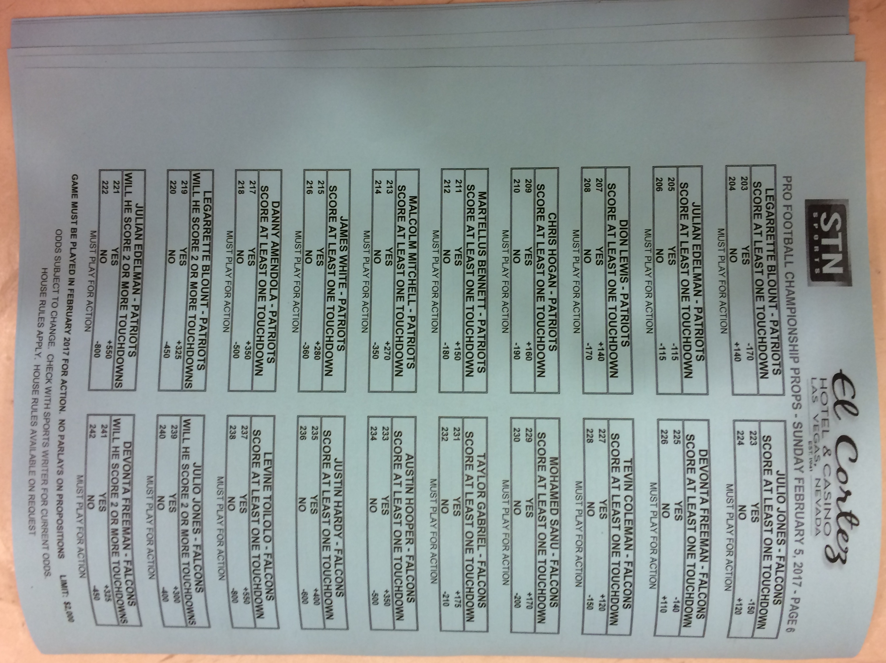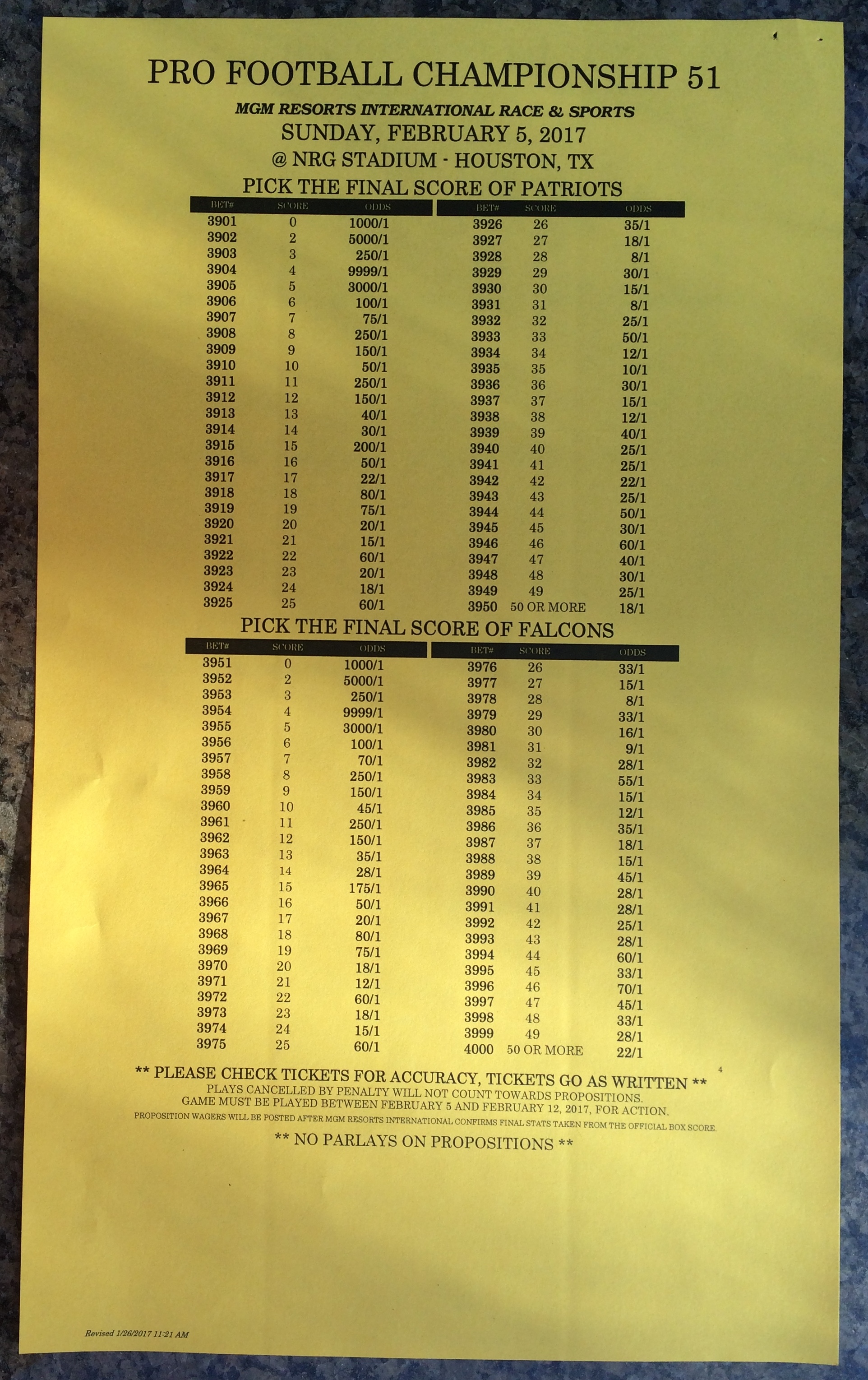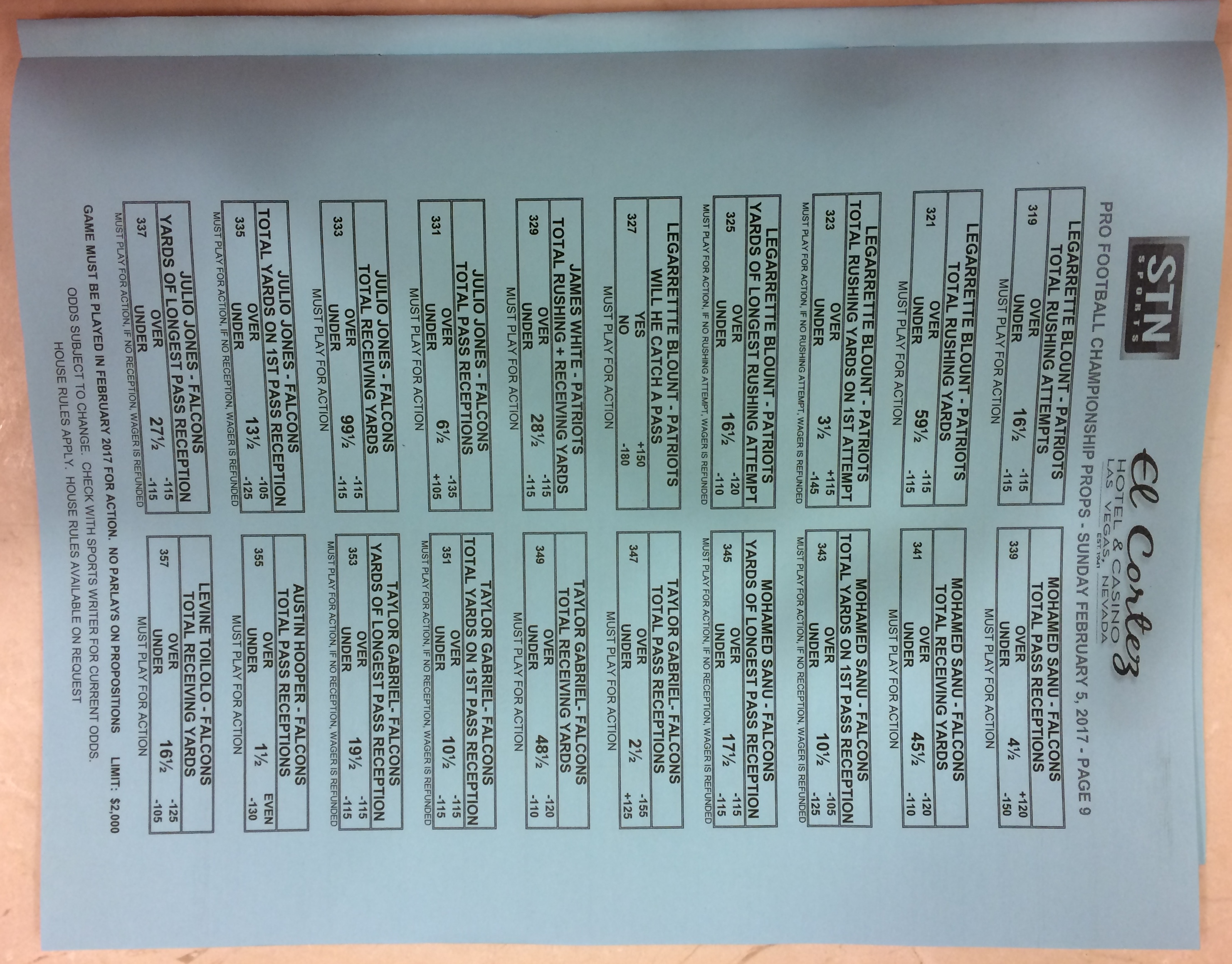 今年の予想はお伝えできませんが、少なくともどんなものがあるかは分かります。こちらは第51回スーパーボウルのプロップシートの写真です。試合開始まで数日中に、さらに追加される予定です。