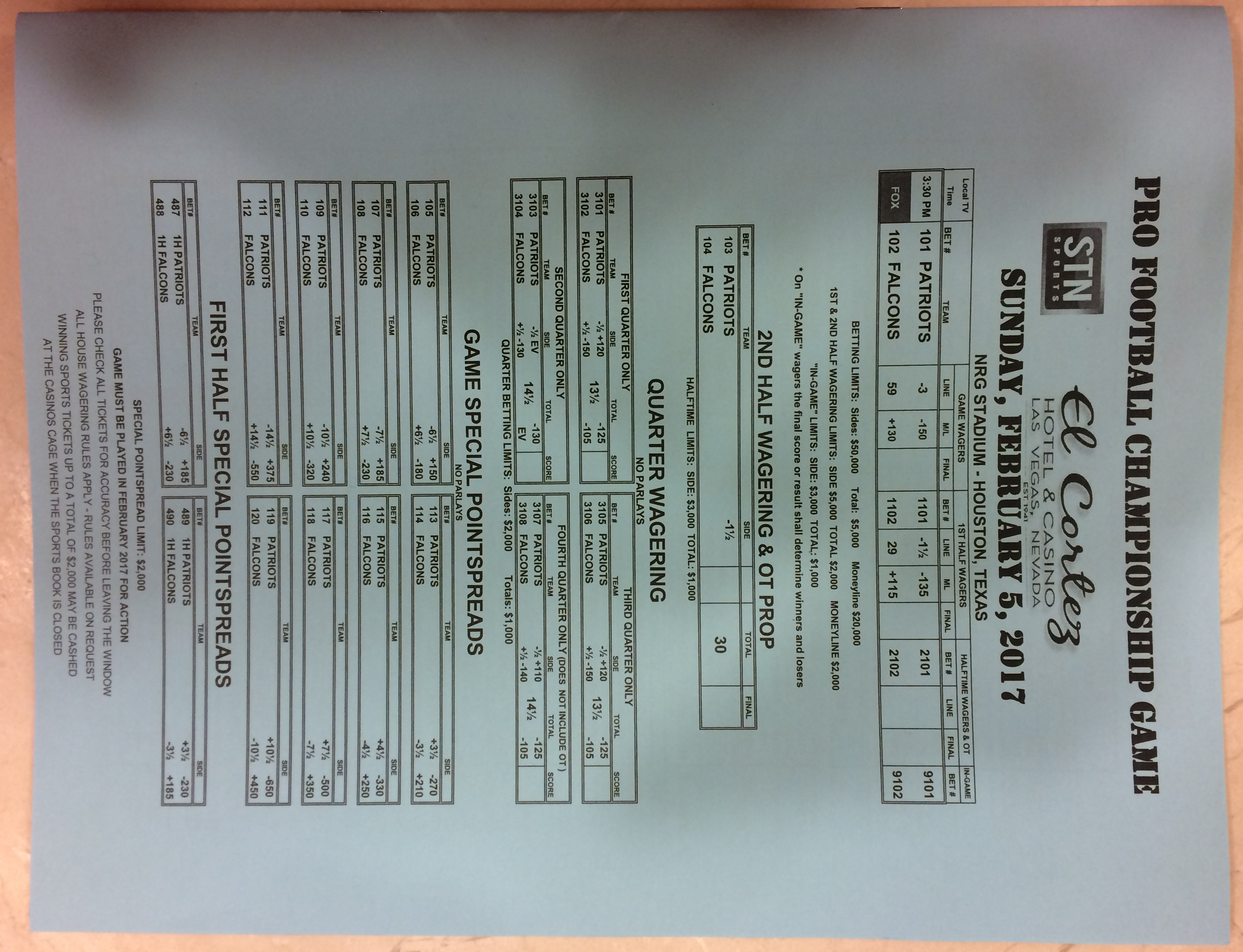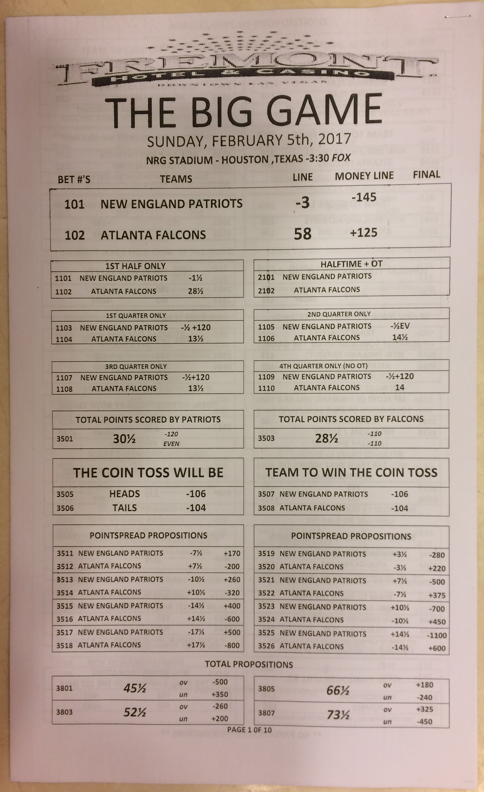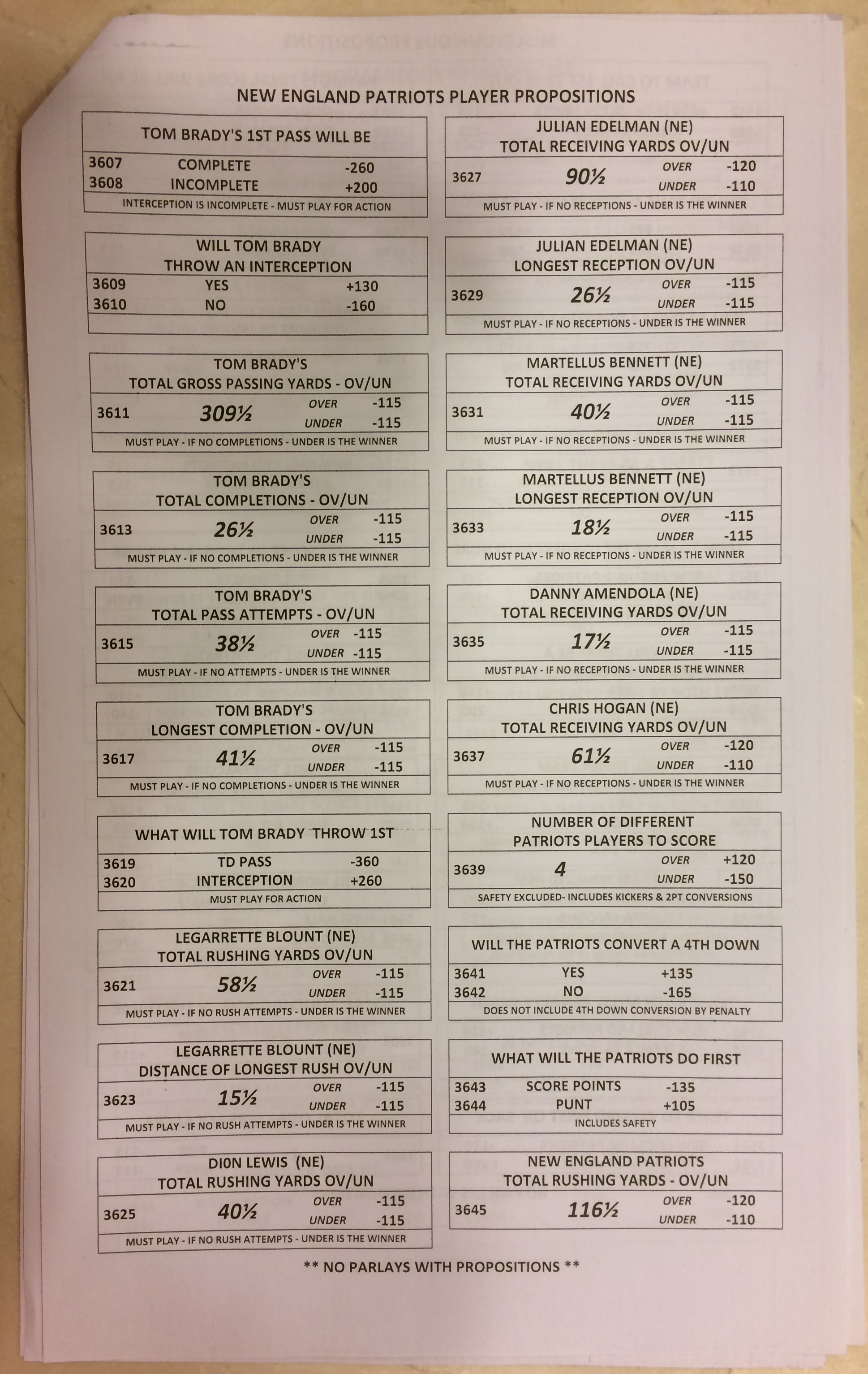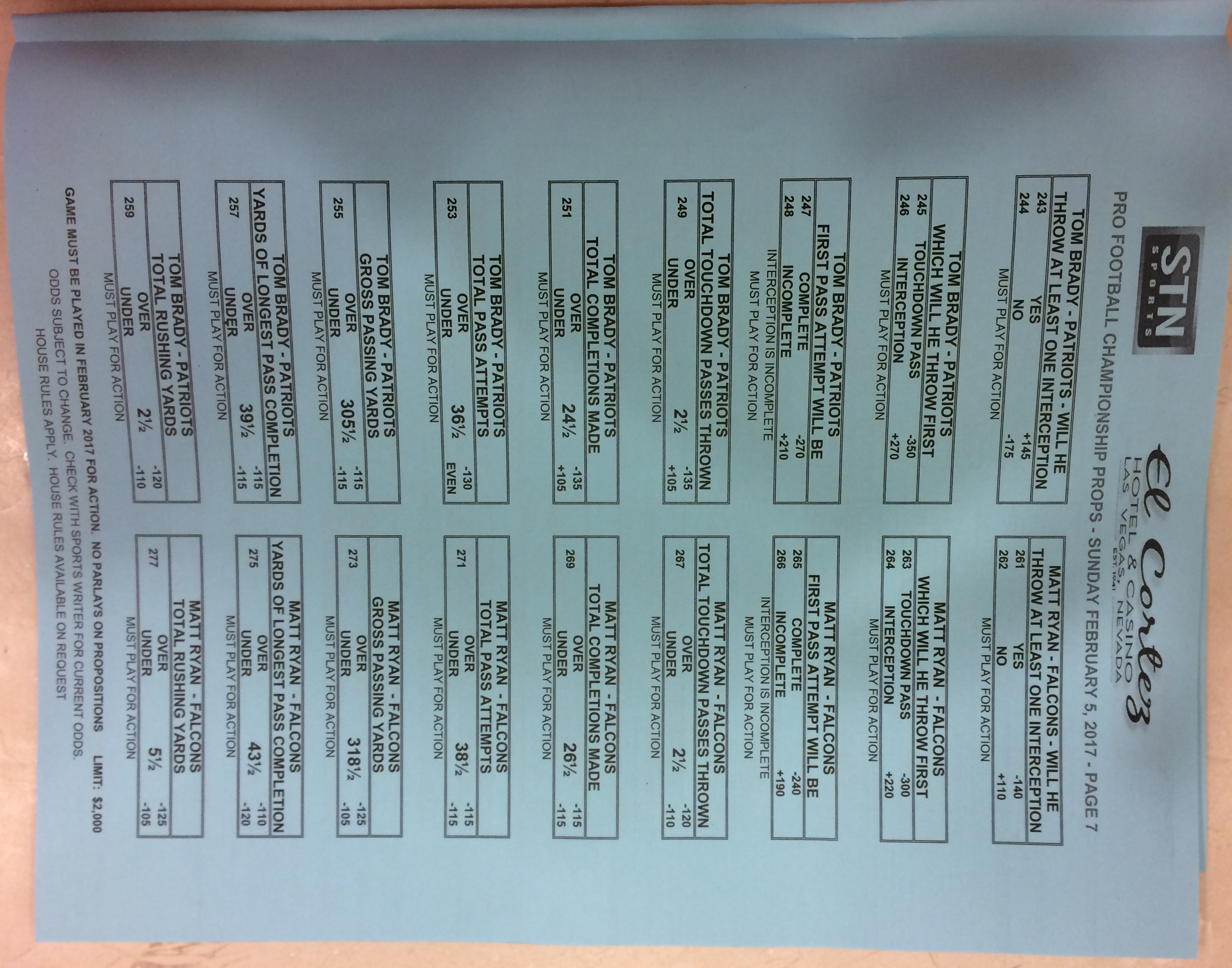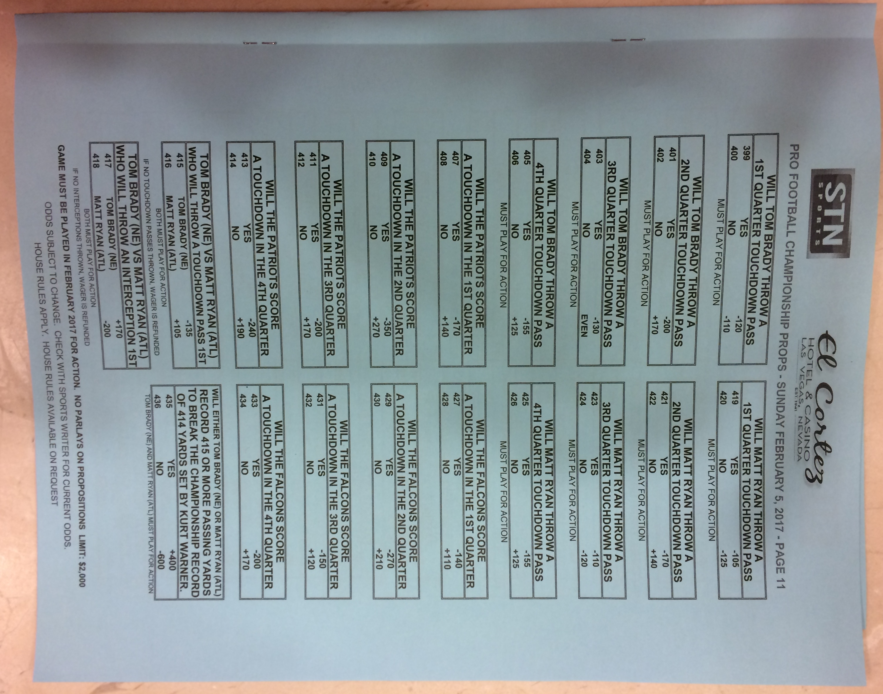 今年の予想はお伝えできませんが、少なくともどんなものがあるかは分かります。こちらは第51回スーパーボウルのプロップシートの写真です。試合開始まで数日中に、さらに追加される予定です。