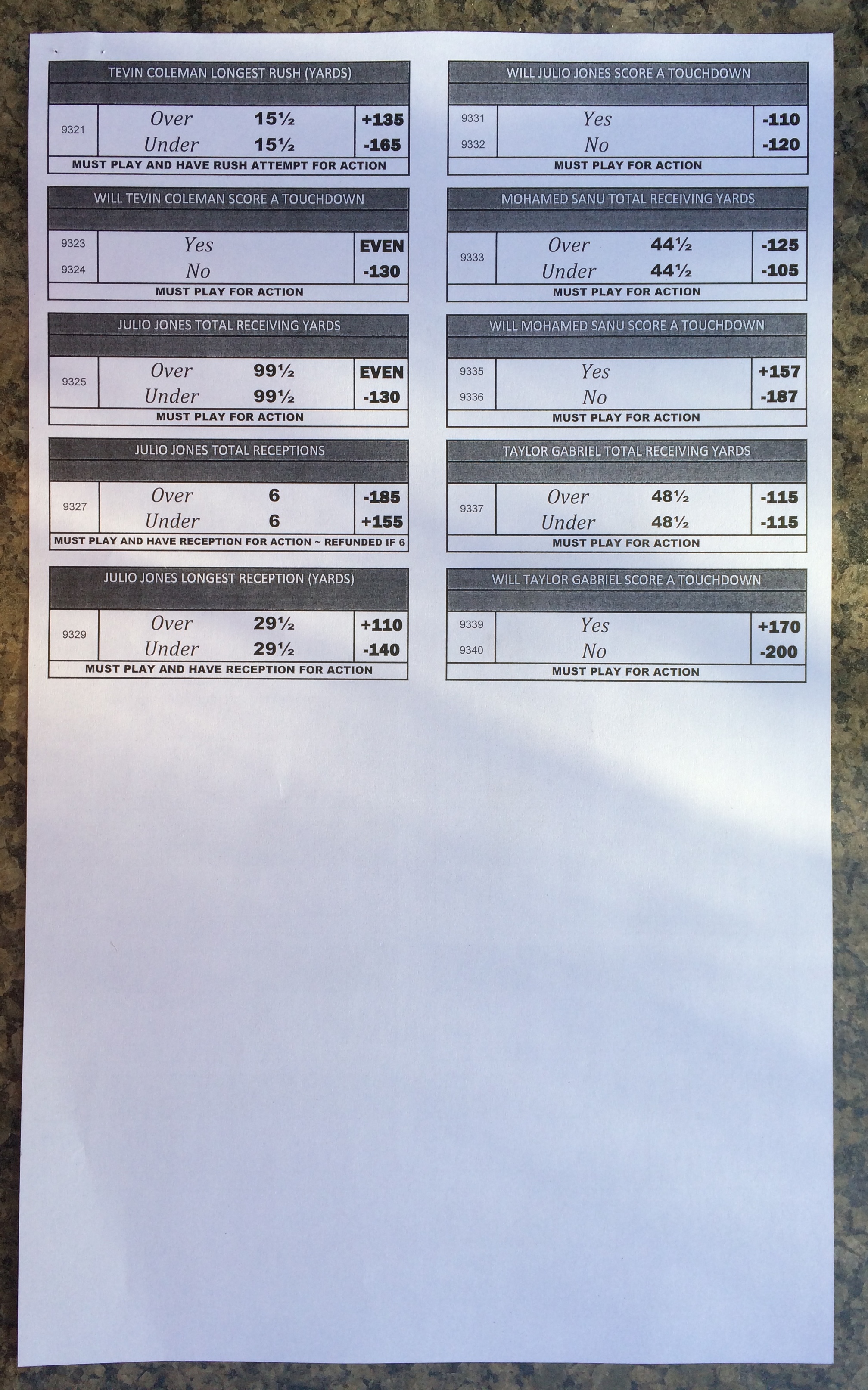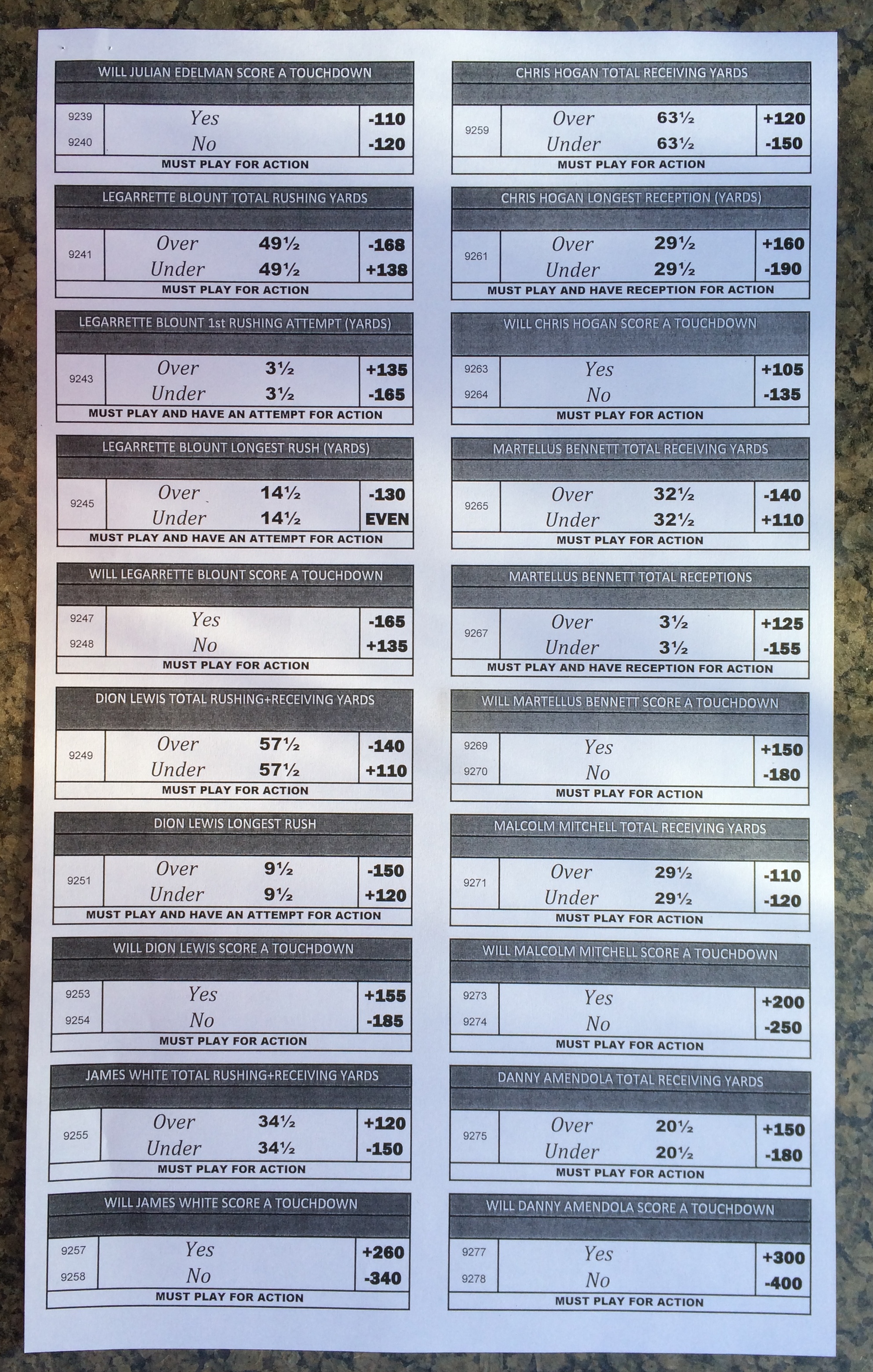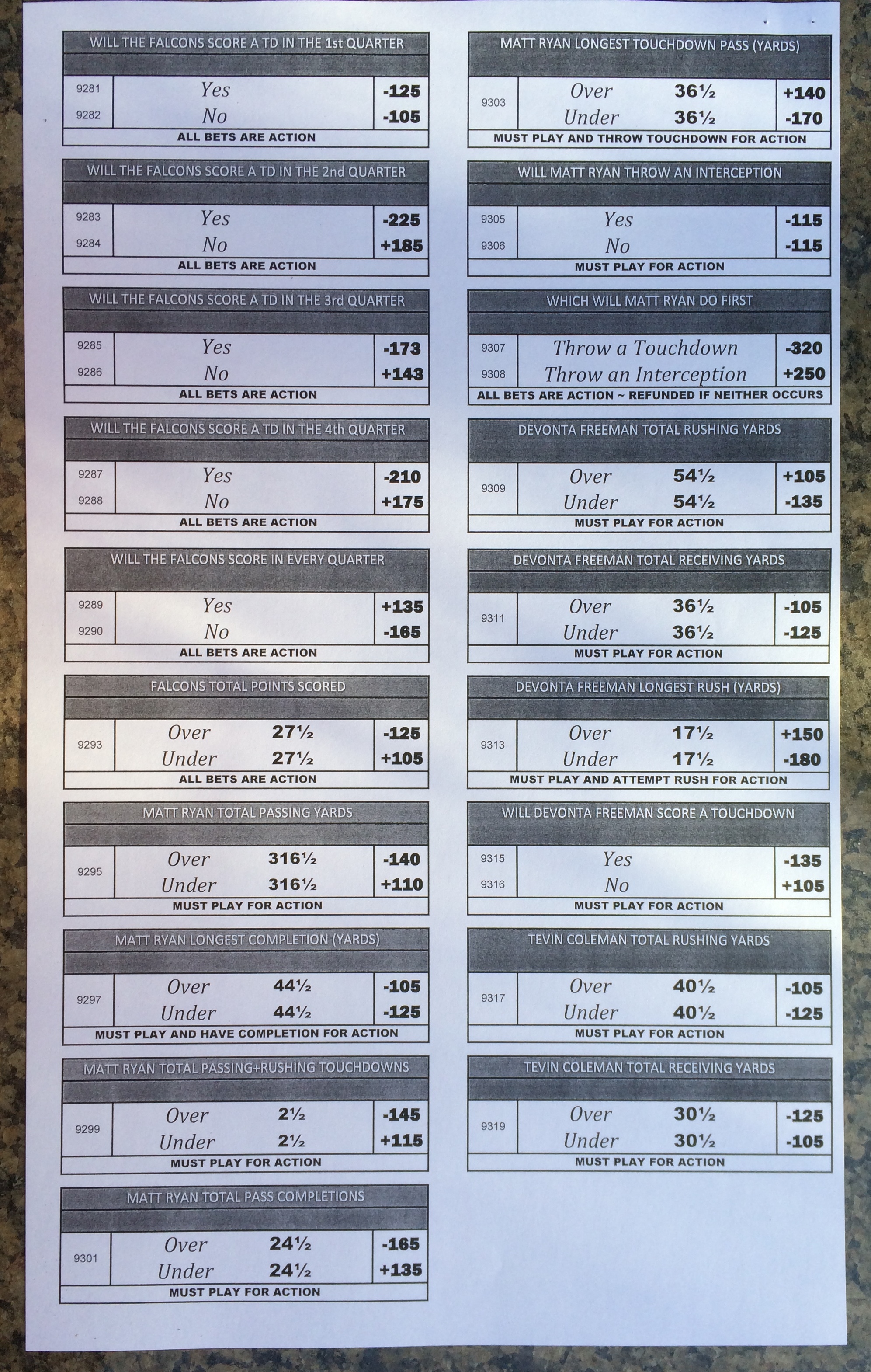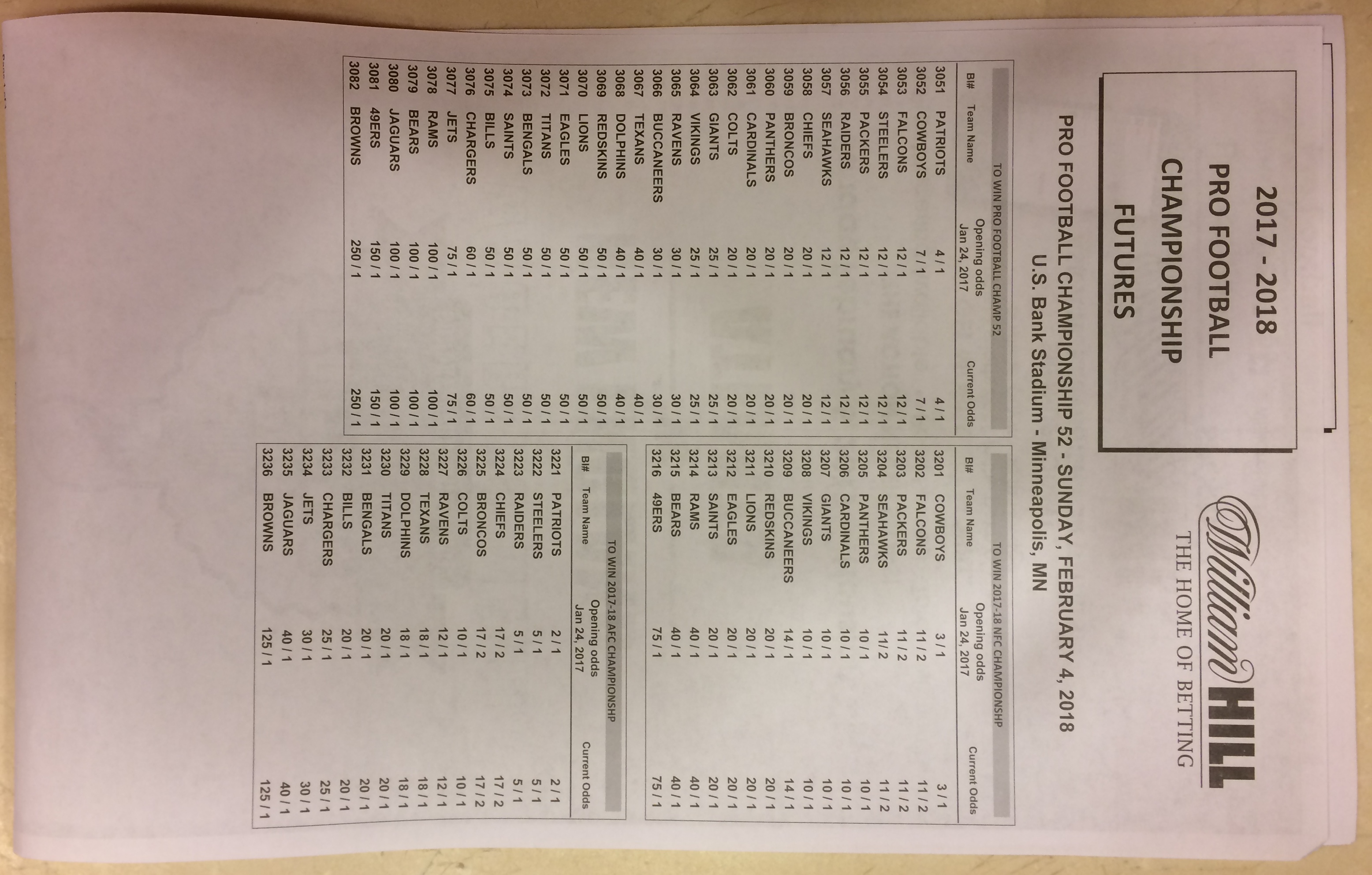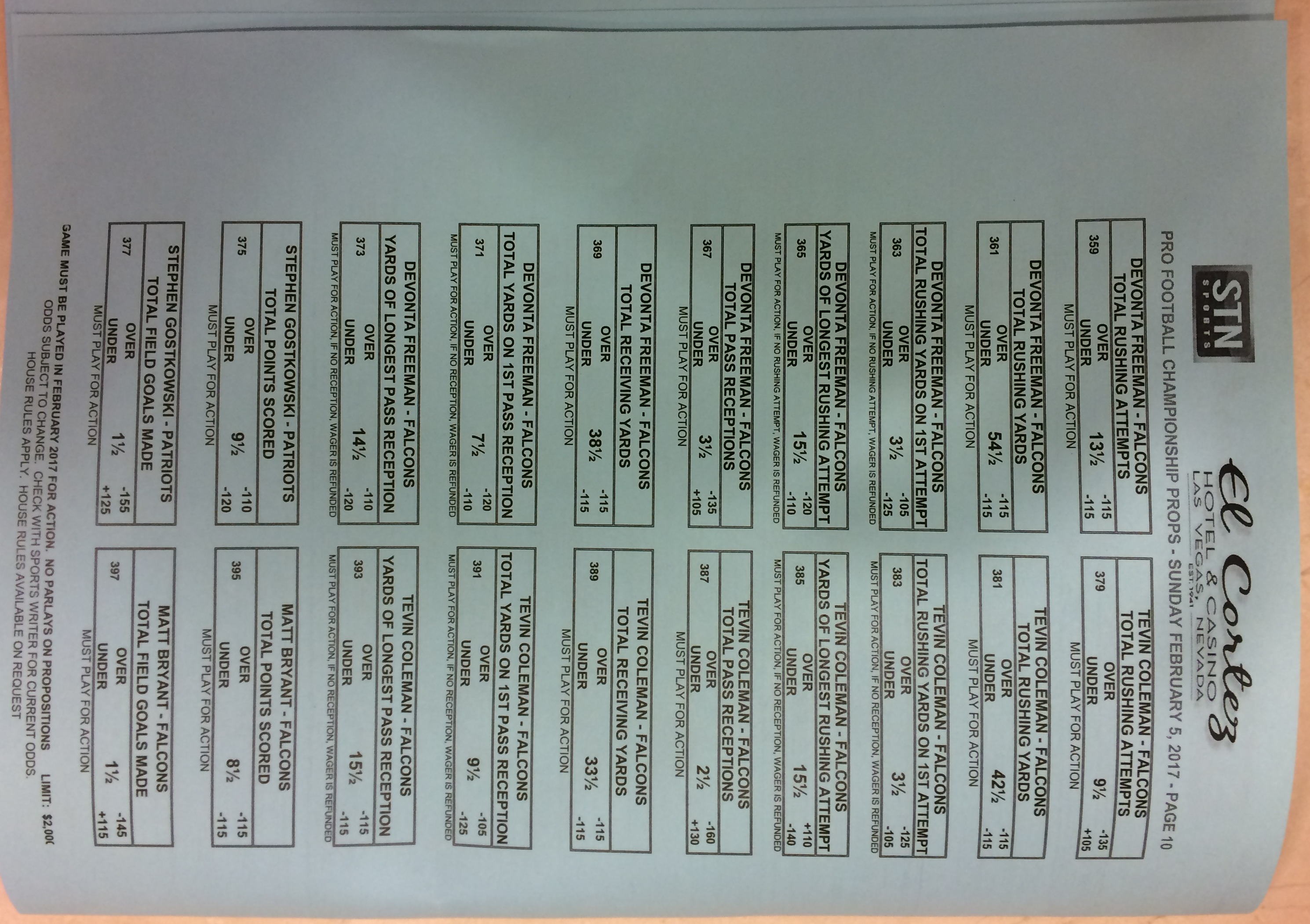 今年の予想はお伝えできませんが、少なくともどんなものがあるかは分かります。こちらは第51回スーパーボウルのプロップシートの写真です。試合開始まで数日中に、さらに追加される予定です。