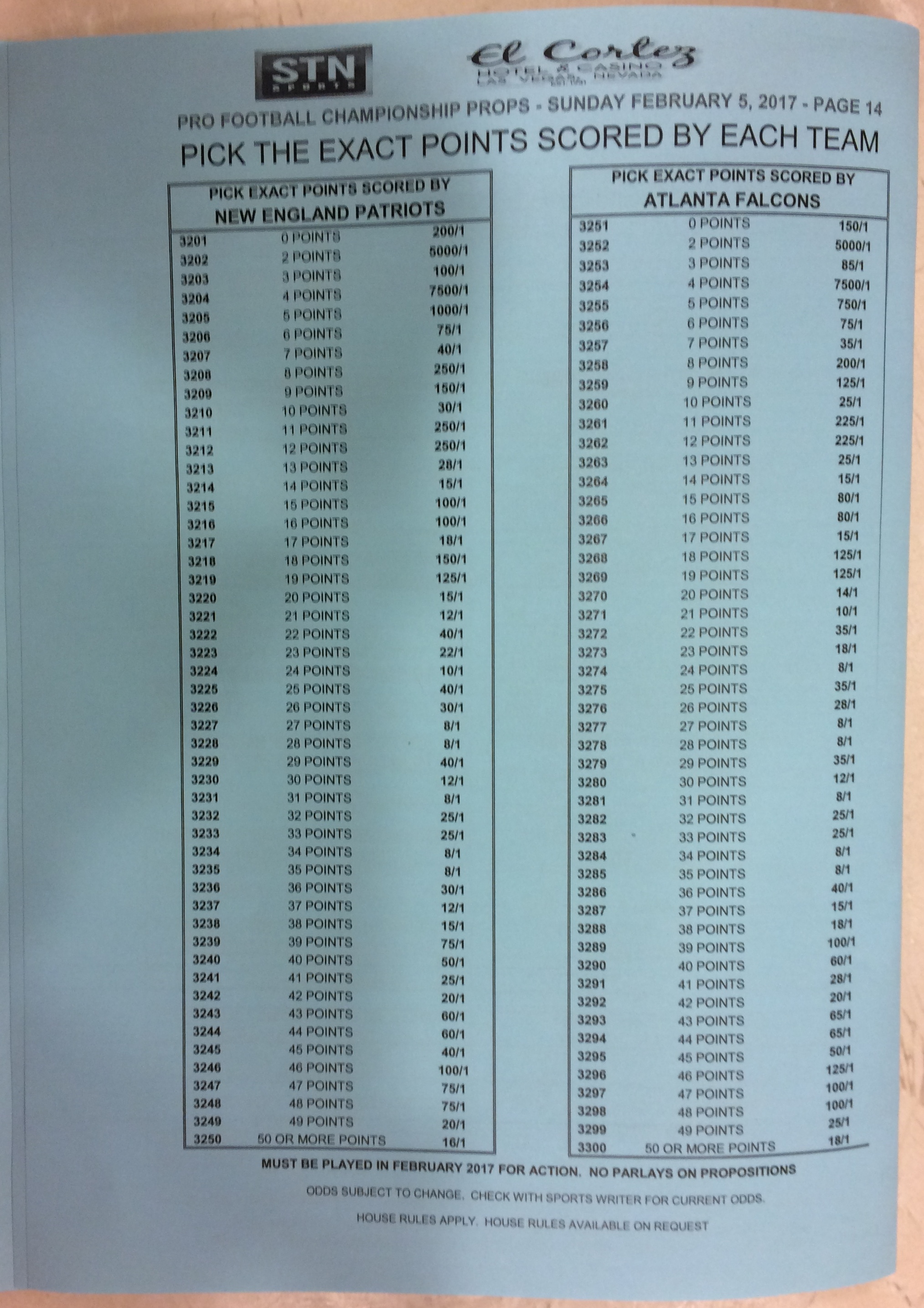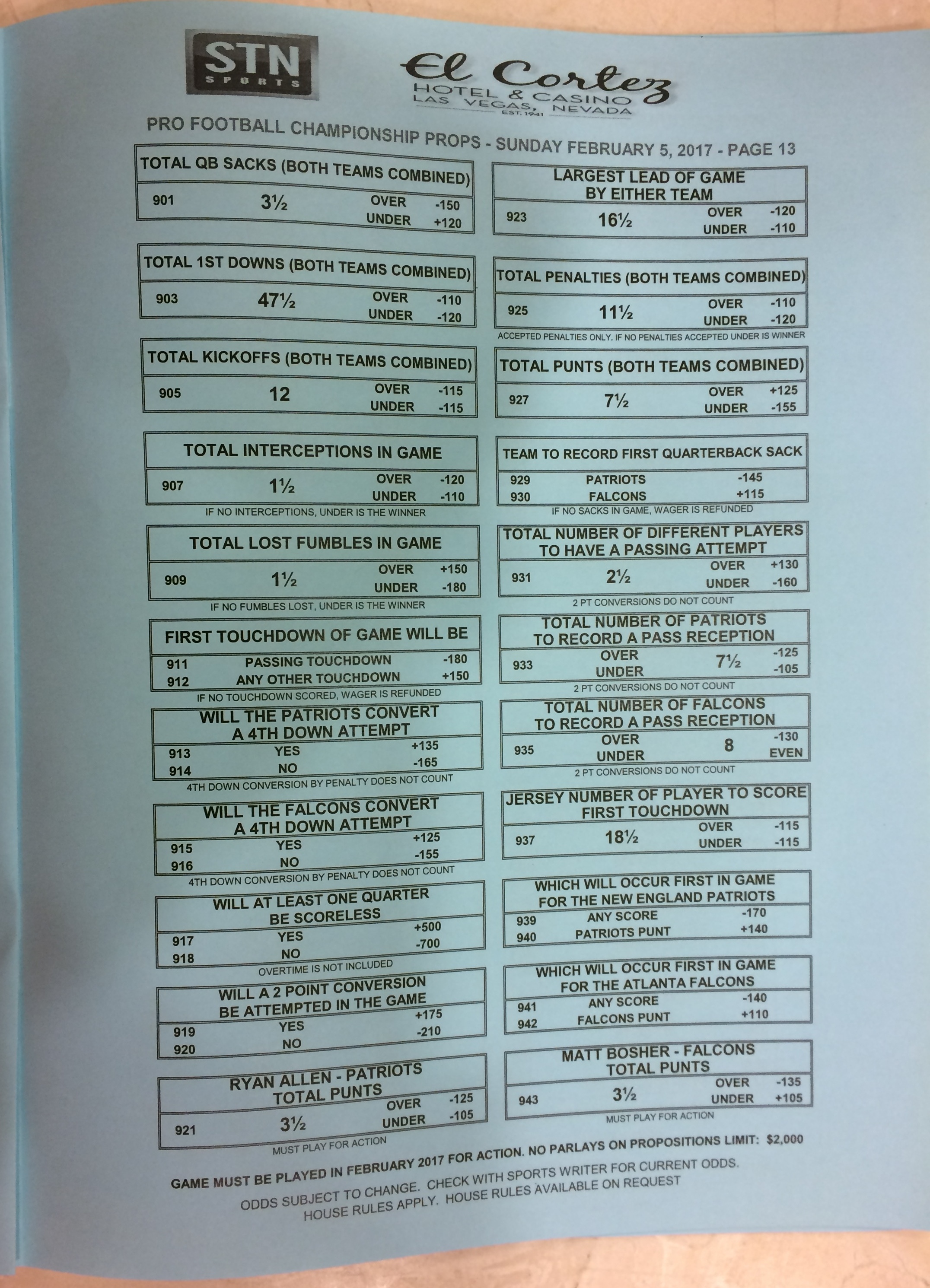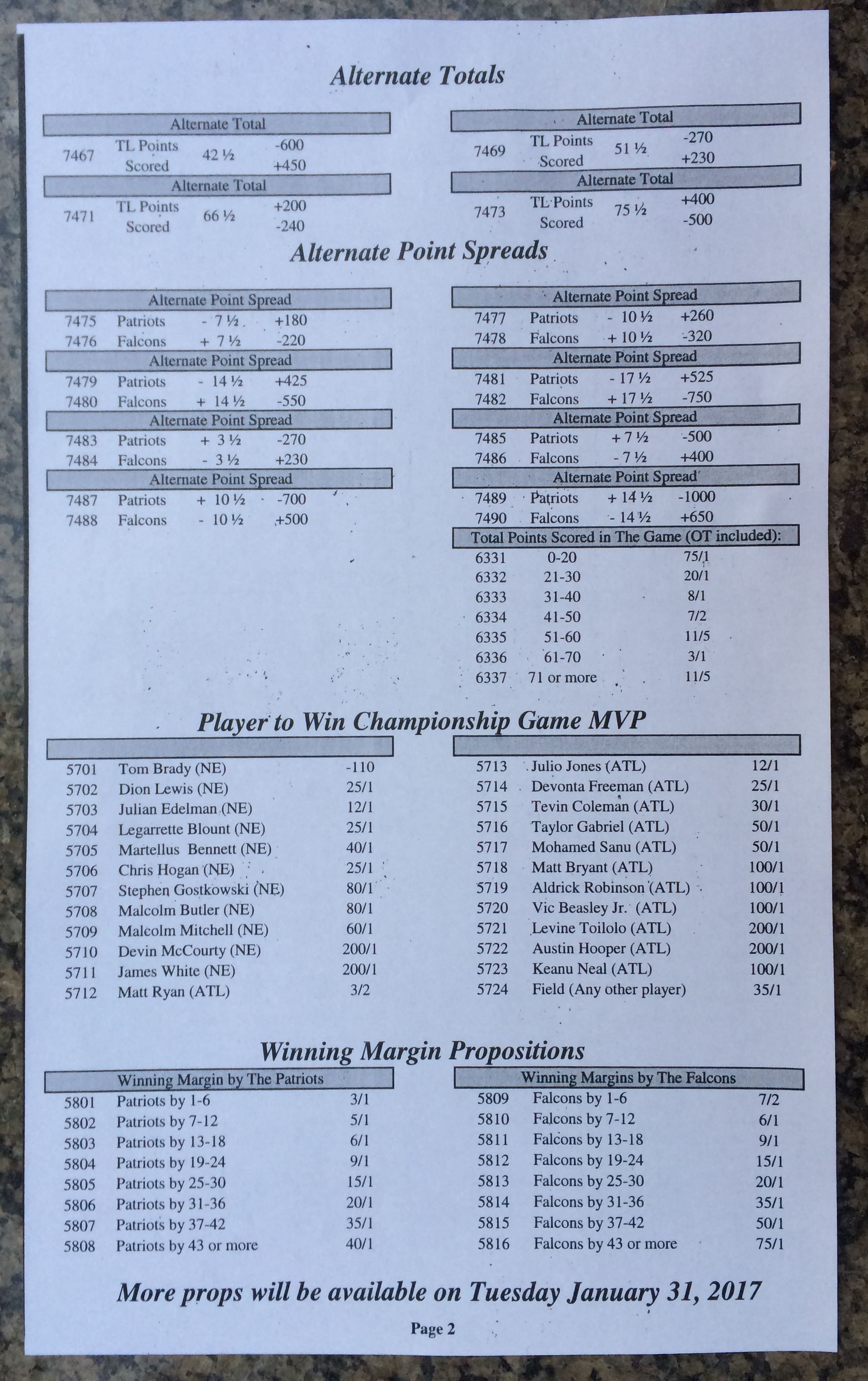 完全なリストは、Westgate Superbook の Super Bowl 51 プロップ ベットの完全なリストでもご覧いただけます。