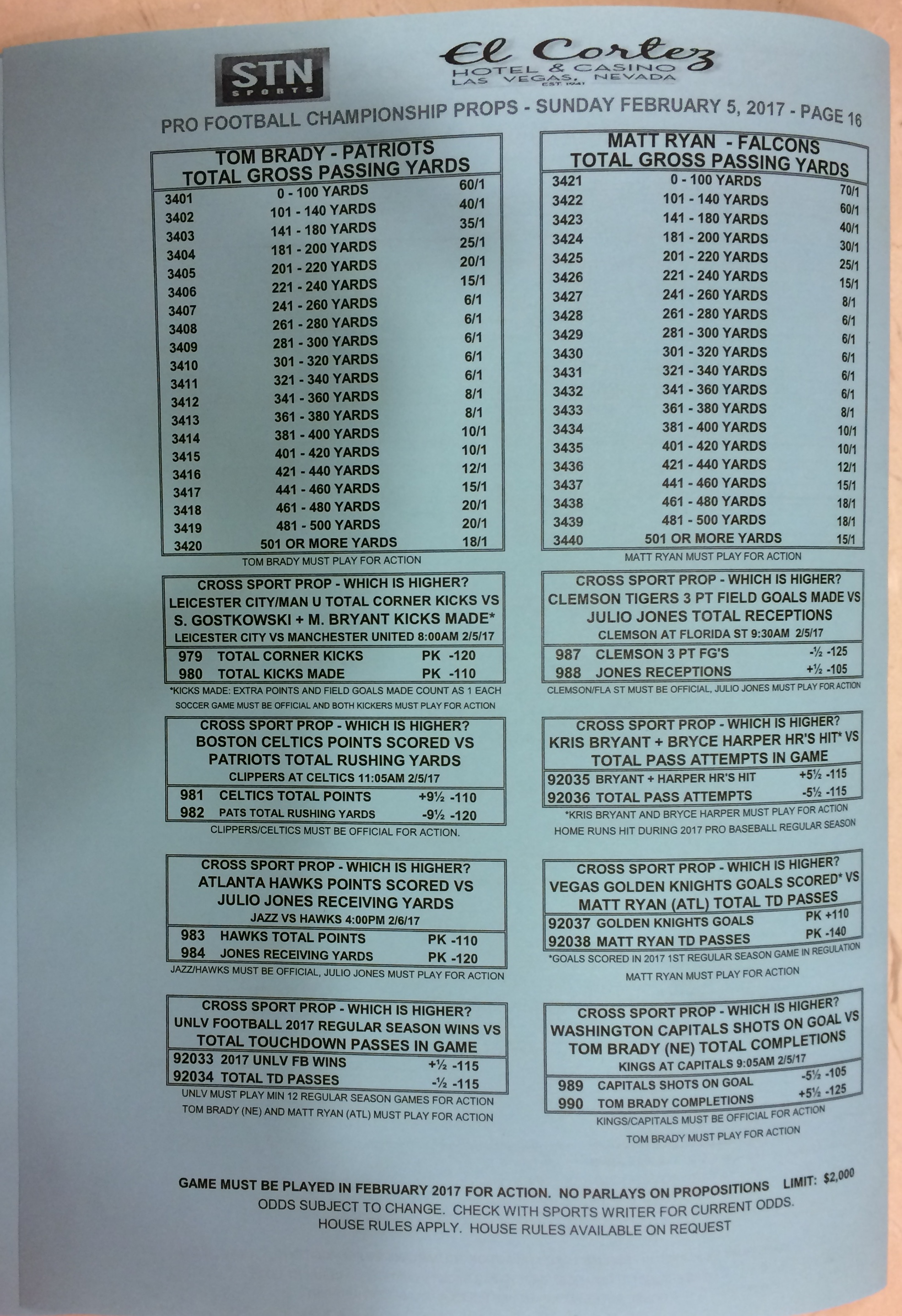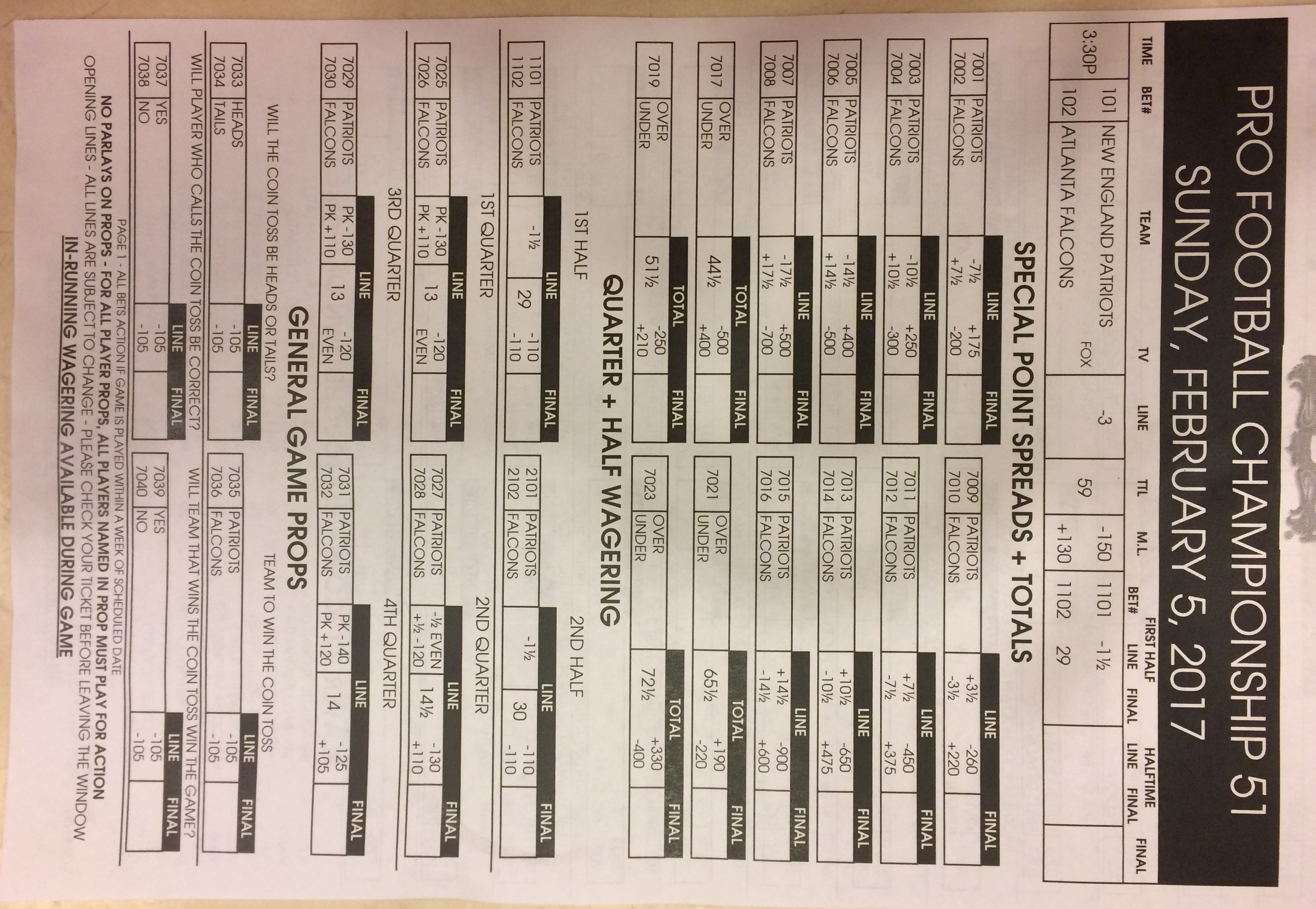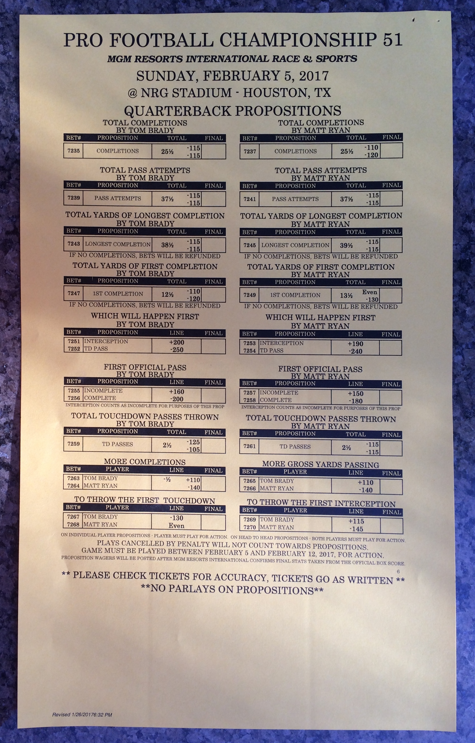 - a href="https://lasvegassun.com/blogs/talking-points/2017/jan/27/full-list-of-super-bowl-51-prop-bets-from-westgate/" target=_blank>LasVegasSun.com の Westgate Superbook によるスーパーボウル 51 プロップ ベットの完全なリスト。