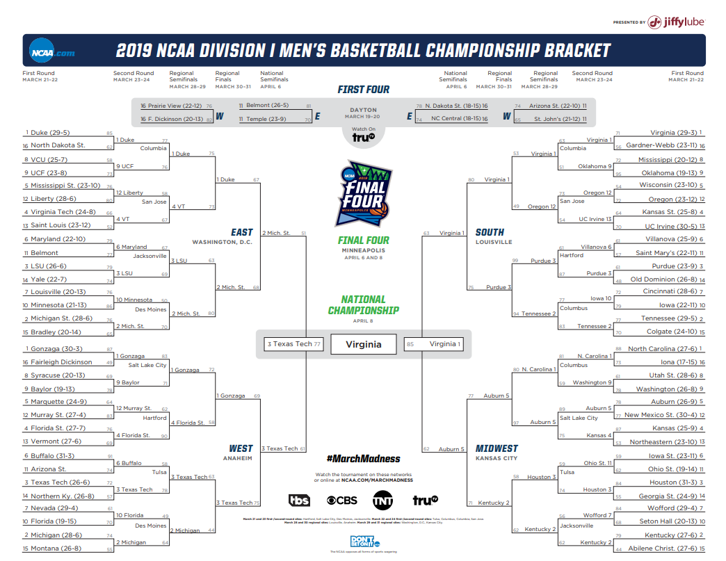 トーナメントは実質的にシングルエリミネーション方式で、64チームからスタートします。完璧主義の読者の皆様のために、実際には68チームが参加し、そのうち8チームが4試合で対戦します。この4試合の勝者と残りの60チームを合わせた合計64チームとなり、通常はそこからトーナメント表の作成が始まります。
