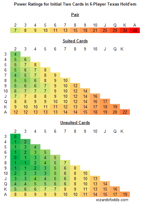 以下の表は、6人プレイにおける最初の2枚の手札ごとの私のパワーレーティングを示しています。数字は0から40のスケールです。ペアの場合は上の表、スーツが揃っている場合は真ん中の表、スーツが揃っていない場合は下の表を使用してください。ペアでない場合は、左側のハイカードと上部のローカードを確認してください。
