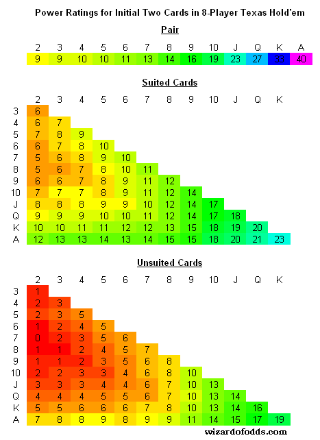 以下の表は、8人プレイにおける最初の2枚の手札ごとの私のパワー評価を示しています。数字は0から40のスケールです。基本的に、濃い緑、青、または紫の手札のみをプレイすべきです。もちろん、レイトポジションではよりリベラルに、アーリーポジションではよりピックにプレイすべきです。