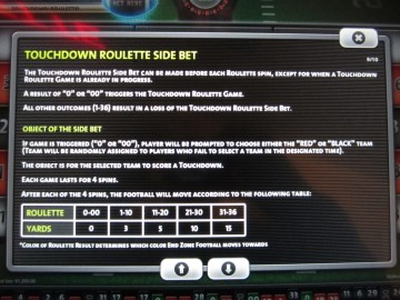 - 通常のベットに加え、タッチダウンルーレットとして、プレイヤーは$1から$5までのサイドベットに賭けることができます。それ以外の結果(1から36)が出た場合は、サイドベットは負けとなります。