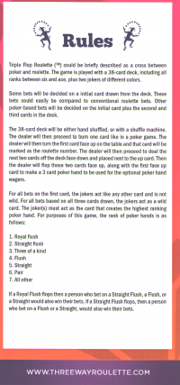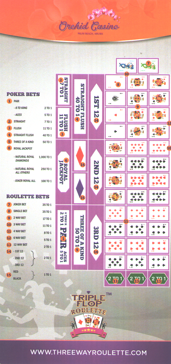 トリプルフロップルーレットは、ポーカーとルーレットを組み合わせたようなゲームです。カリフォルニアやオクラホマといった、ホイールを使ったルーレットが違法とされている地域向けに開発されました。しかし、アルバ島のオーキッドカジノで導入されました。