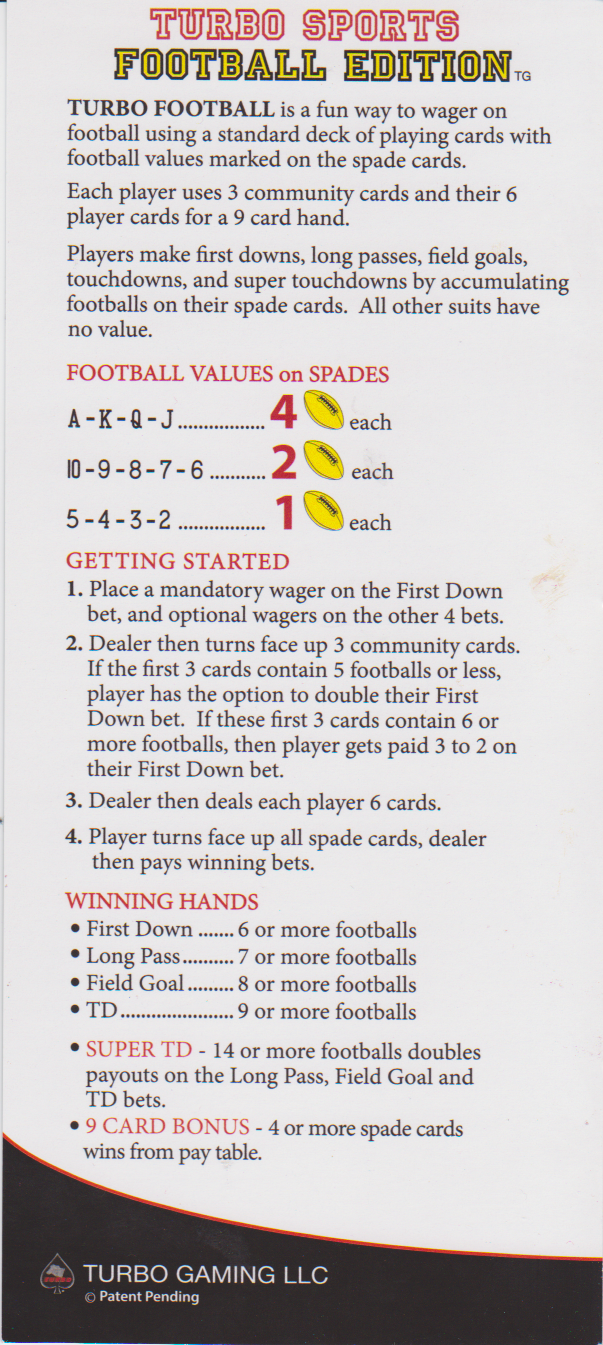 ターボフットボールは、2016年10月4日にラスベガスのストラトスフィアで見つけたカードゲームです。ルールは少し説明が難しいですが、数回プレイすればすぐに理解できます。新しいテーブルゲームとしては、ほとんどのベットでハウスアドバンテージが非常に低くなっています。