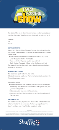 2016年8月11日、ラスベガスのエクスカリバーで初めて「Two for the Show」を観ました。名前からすると「One for the Money」の続編だと思う人もいるかもしれません。しかし、そのゲームとの共通点はあまり感じられません。むしろ、 Three Card Pokerの構造によく似ています。