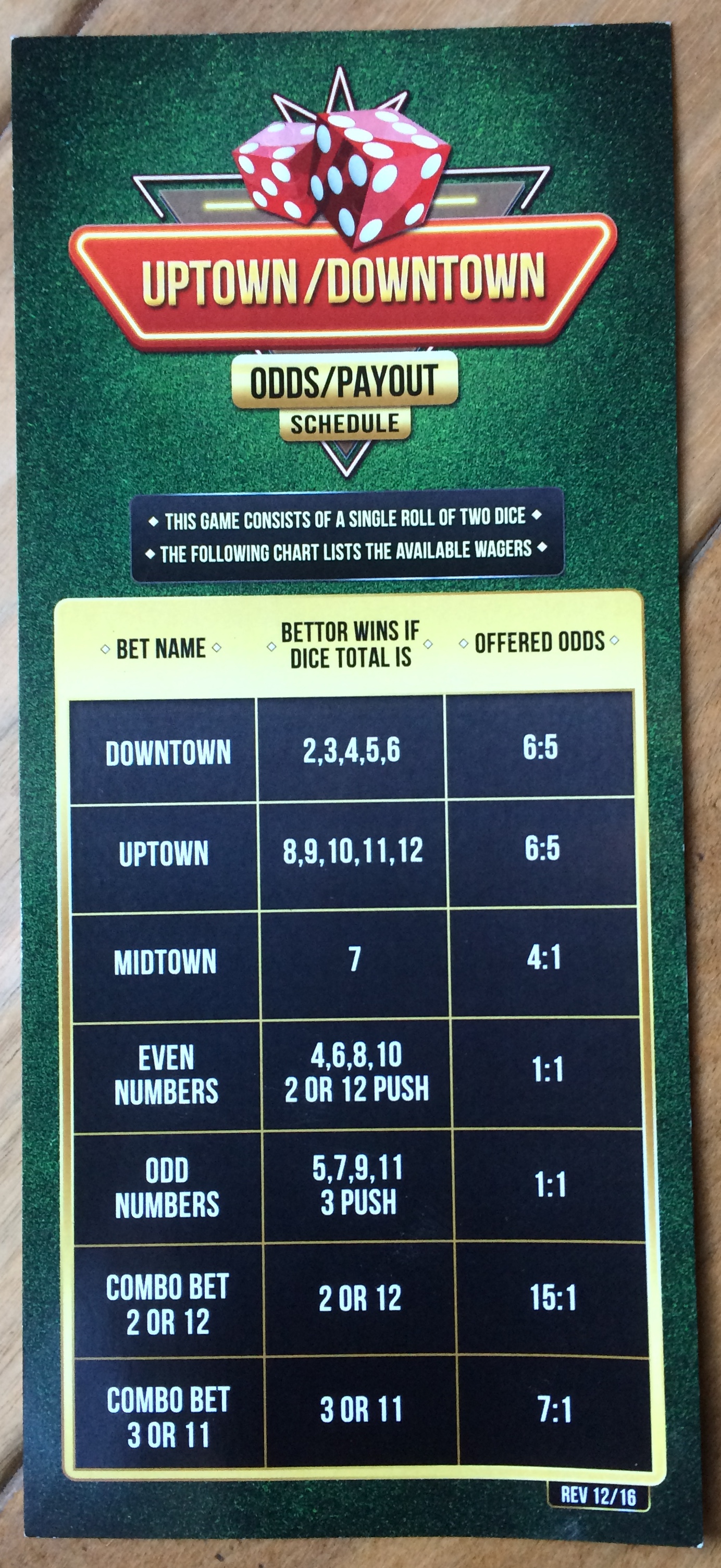 私が初めてアップタウン/ダウンタウンを観たのは、2017年1月19日、リノのシルバーレガシーでした。これは、すべての賭けが1回の投げで決まるシンプルなサイコロゲームです。