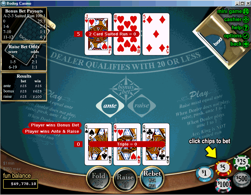 下の図では、アンティとボーナスベットにそれぞれ25ドル賭けています。その後、レイズベットにも25ドル賭けました。スリーカードで私のスコアは0でした。ディーラーのスーツ付き10ジャックは0ポイント、シングルトン5は5ポイントで、合計5ポイントです。私の0がディーラーの5に勝ったので、アンティで1対1、つまり25ドル、レイズで4対1、つまり100ドル、ボーナスベットで25対1、つまり625ドル、合計750ドルの勝利となりました。