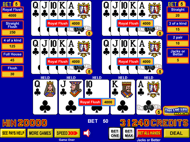 以下のスクリーンショット( VideoPoker.com より)では、プレイヤーは最初の 4 枚のカードで 4 対 1 のロイヤルを獲得し、ロイヤル フラッシュが完成してドリーム カードが有効になったのは幸運でした。