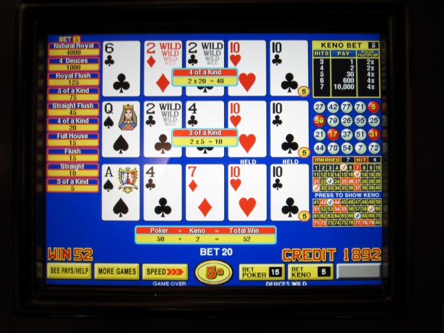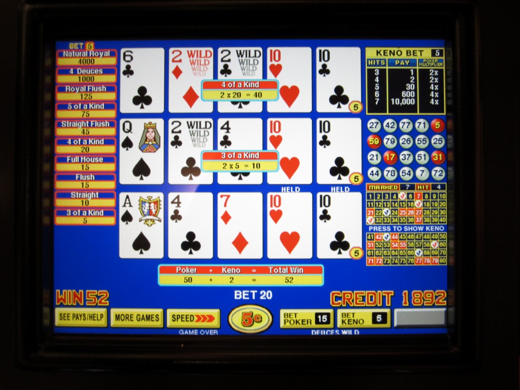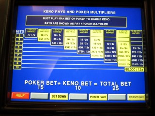 上記のゲームでは、合計20クレジットを賭けました。ビデオポーカーに15クレジット、キノに5クレジットです。キノでは7つの数字を選びました。そのうち4つが当たり、即座に2クレジットとビデオポーカーの2倍のマルチプライヤーが支払われました。