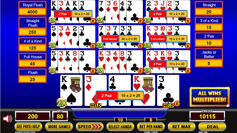 上の画像では、ディール直後に2倍のマルチプライヤーが付与されました。ドロー後、私はツーペアを4つ、スリーオブアカインドを1つ、フルハウスを1つ持っていました。マルチプライヤーが付与される前は、これらのハンドの配当はそれぞれ10、15、45でした。したがって、このハンドでの私の合計配当は2*(4*10 + 15 + 45) = 200です。