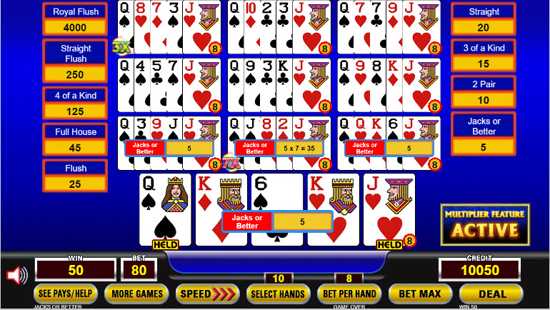 上の画像では、ドロー後に2つのマルチプライヤーを獲得しました。1つは左上のプレイで3倍でしたが、これは負けハンドだったので役に立ちませんでした。もう1つは上から3段目の中央列で7倍のマルチプライヤーを獲得しました。このハンドはジャック以上で、通常は5倍の配当となります。他にジャック以上のハンドが3つありましたが、マルチプライヤーは獲得できませんでした。つまり、合計獲得額は7×5 + 3×5 = 35 + 15 = 50クレジットでした。