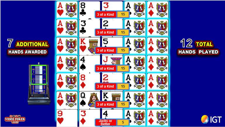 - フィーチャーを発動するには、プレイヤーは1ラインあたり10クレジットをプレイする必要があります。勝利は5クレジットのみに基づいて決定されます。プレイヤーに2枚または3枚のエースが配られた場合、ボーナスハンドが付与されます。ボーナスハンドの数には、プレイヤーが既に支払ったハンドも含まれます。