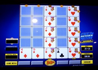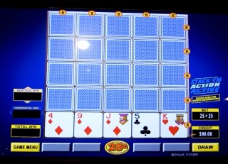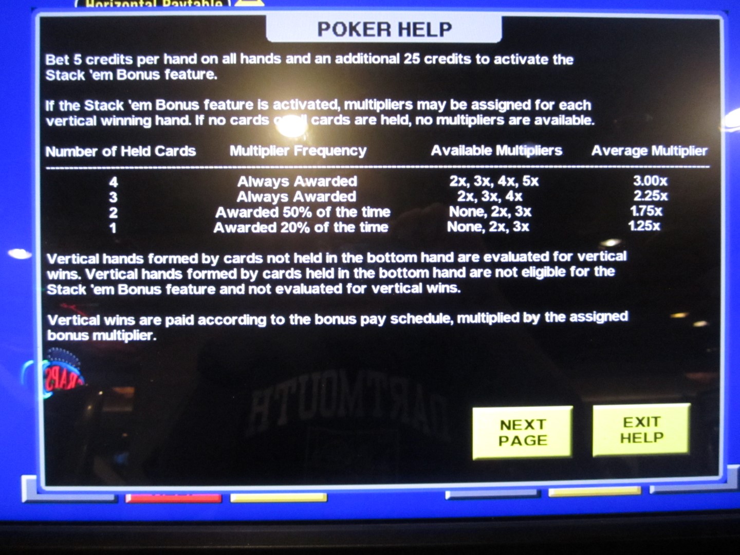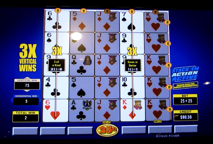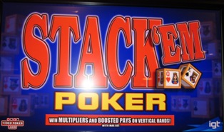 スタック・エム・ポーカーは、2014年9月17日にハラーズ・ラスベガスで見かけたビデオポーカーの一種です。5人プレイのビデオポーカーのように、縦に5つのハンドが積み重なっています。プレイヤーが追加のベットをすると、縦と横の両方のハンドで成立した勝利の資格が得られます。