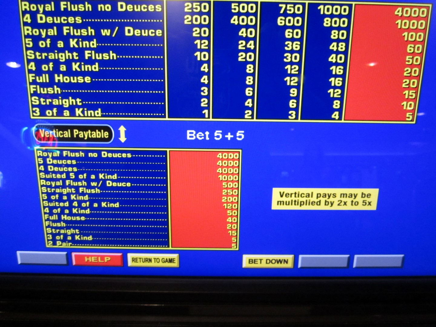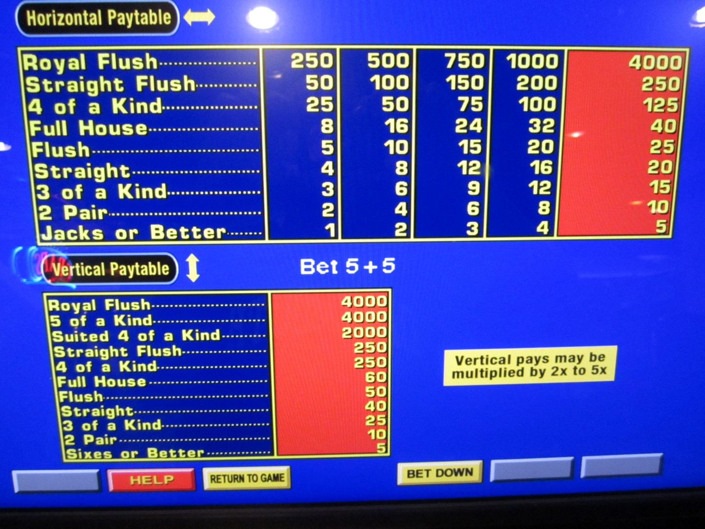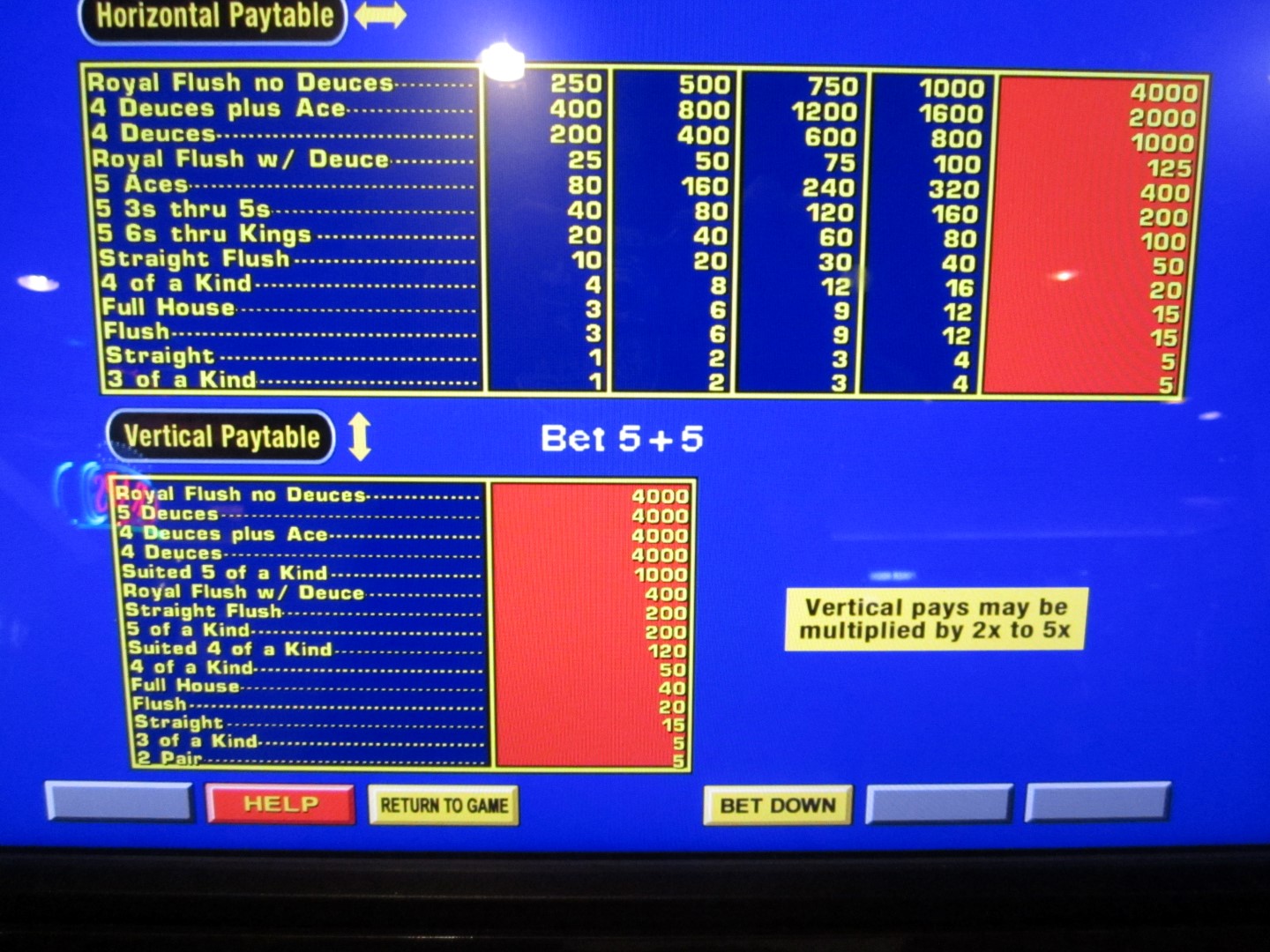 複数5 0% なし 1.00 4 100% 2倍、3倍、4倍、5倍 3.00 3 100% 2倍、3倍、4倍 2.25 2 50% 2倍、3倍 1.75 1 20% 2倍、3倍 1.25 0 0% なし 1.00 - いくつかの既知の支払い表を以下に示します。