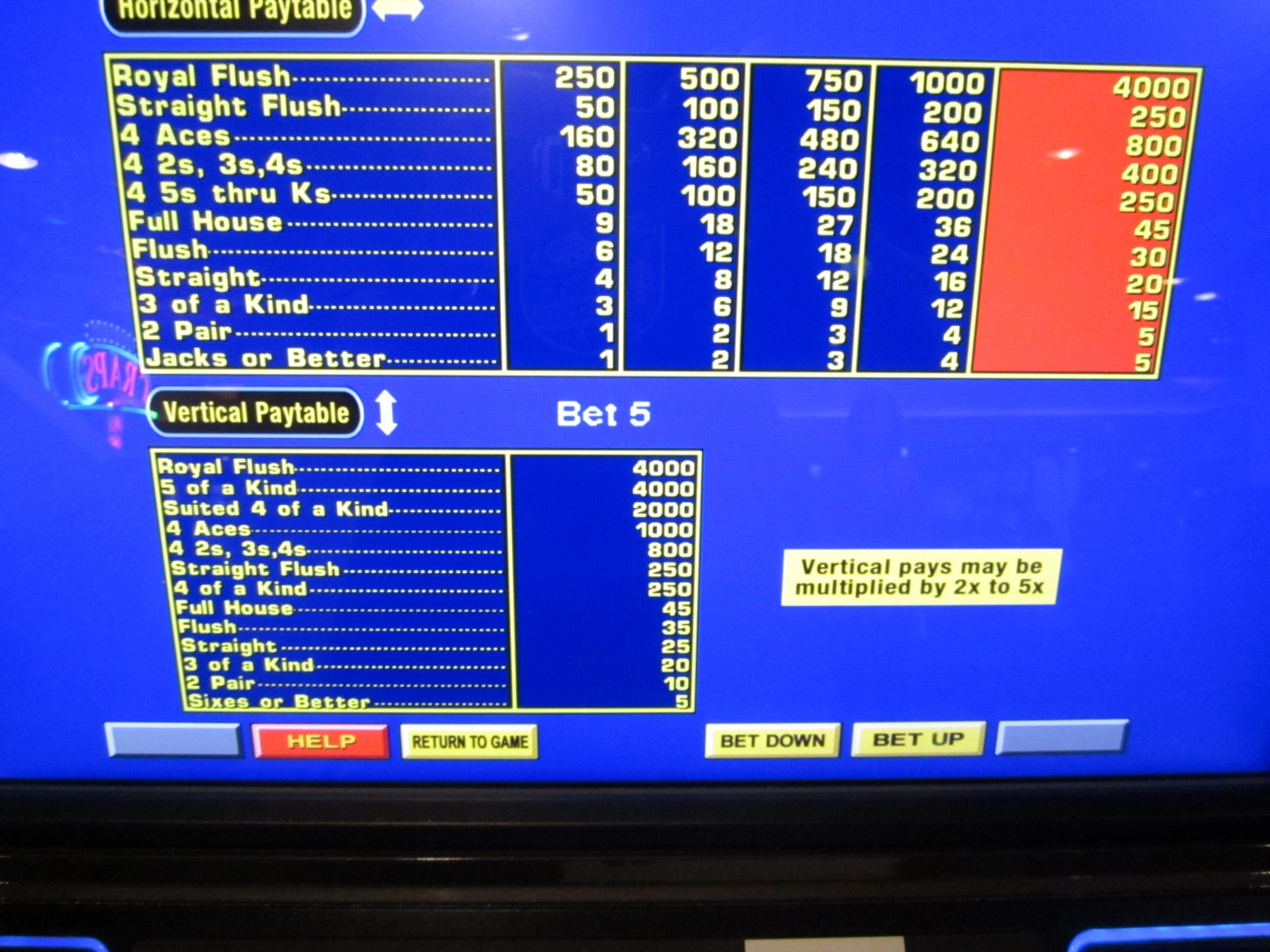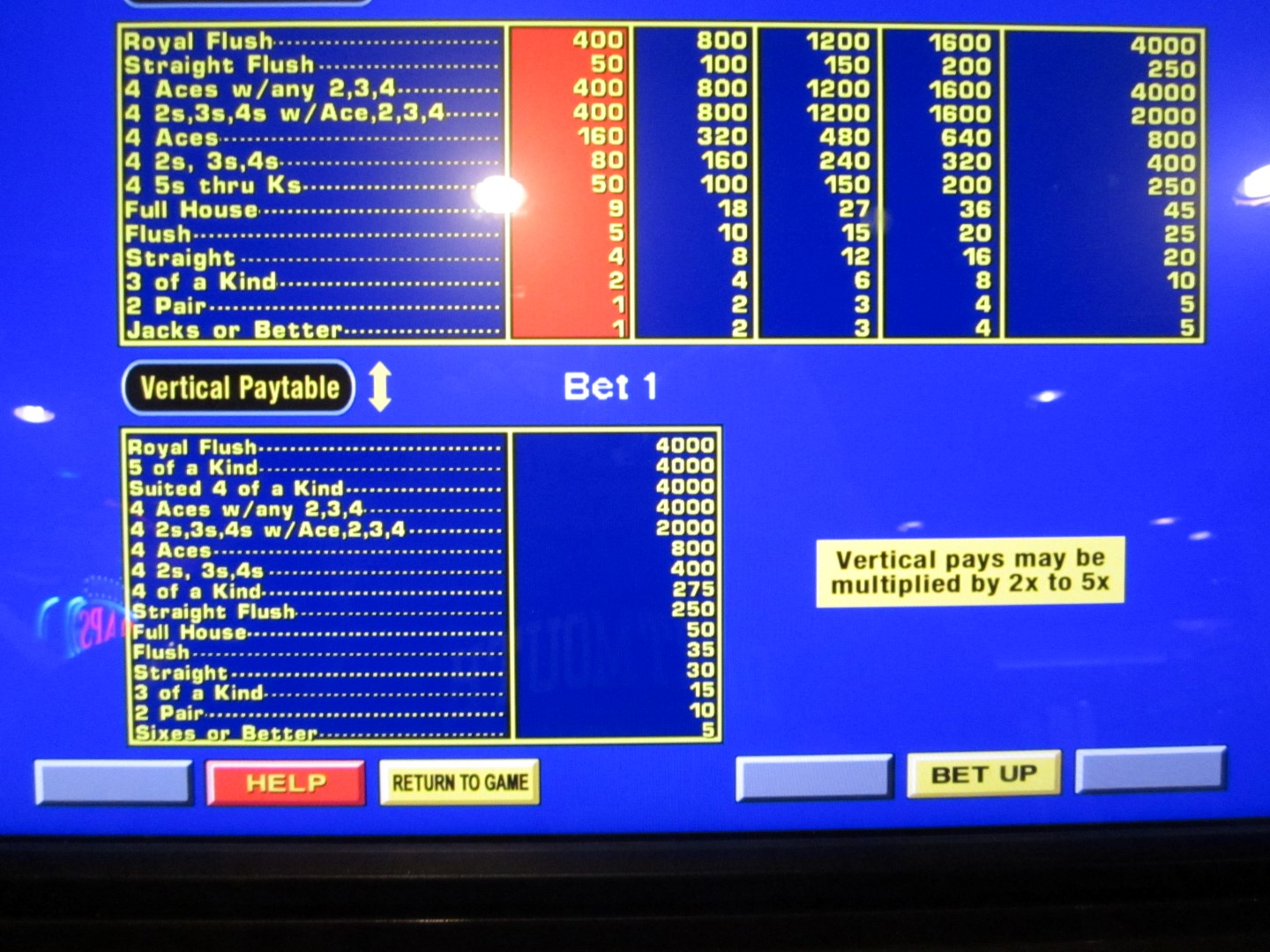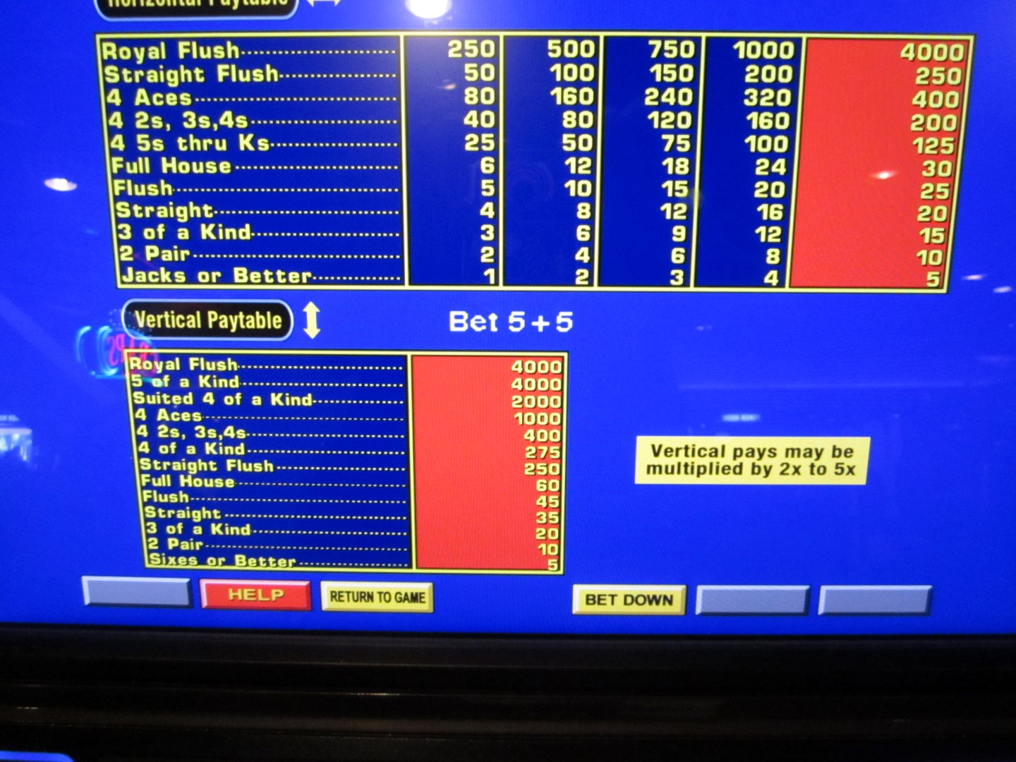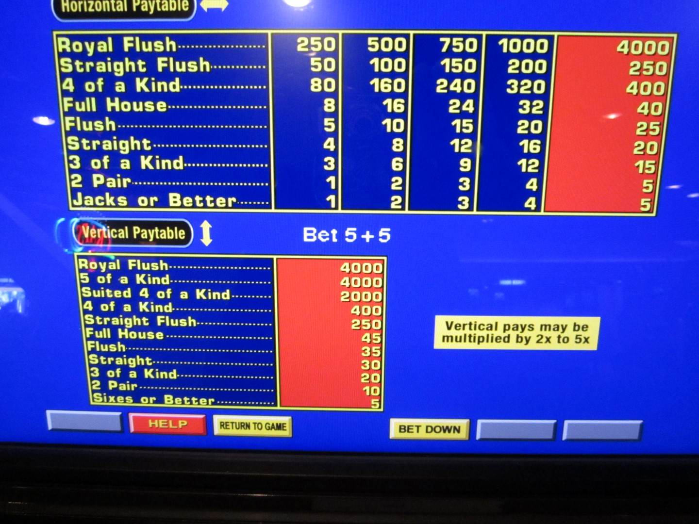 複数5 0% なし 1.00 4 100% 2倍、3倍、4倍、5倍 3.00 3 100% 2倍、3倍、4倍 2.25 2 50% 2倍、3倍 1.75 1 20% 2倍、3倍 1.25 0 0% なし 1.00 - いくつかの既知の支払い表を以下に示します。