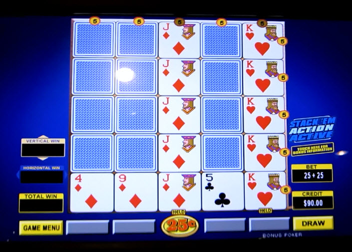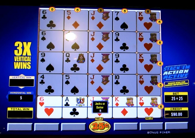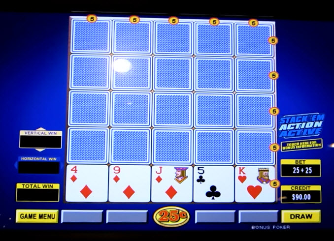 - Stack 'Em Pokerは、従来の5人用ビデオポーカーと同じようにプレイできます。ベースゲームは、5×5のカードマトリックスに5つのハンドを横並びで配置する形式で進行します。