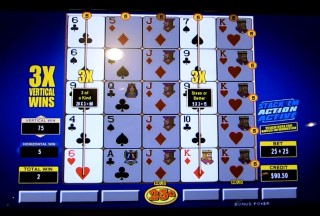 左の写真のように、3倍のマルチプライヤーで勝ちました。縦に2つのペイアウトハンドがありました。左から1つ目のハンドはスリーカードで、ラインごとに賭け金の4倍の配当となります。1ハンドあたり5クレジットの賭け金と3倍のマルチプライヤーを考慮すると、このハンドの勝利金は5×4×3=60となります。