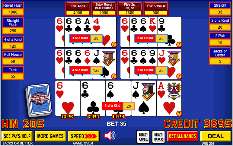 - 1 ラインあたり 1 ~ 5 枚のコインを賭けるゲームは、従来のマルチプレイ ビデオ ポーカーと同じようにプレイできます。
