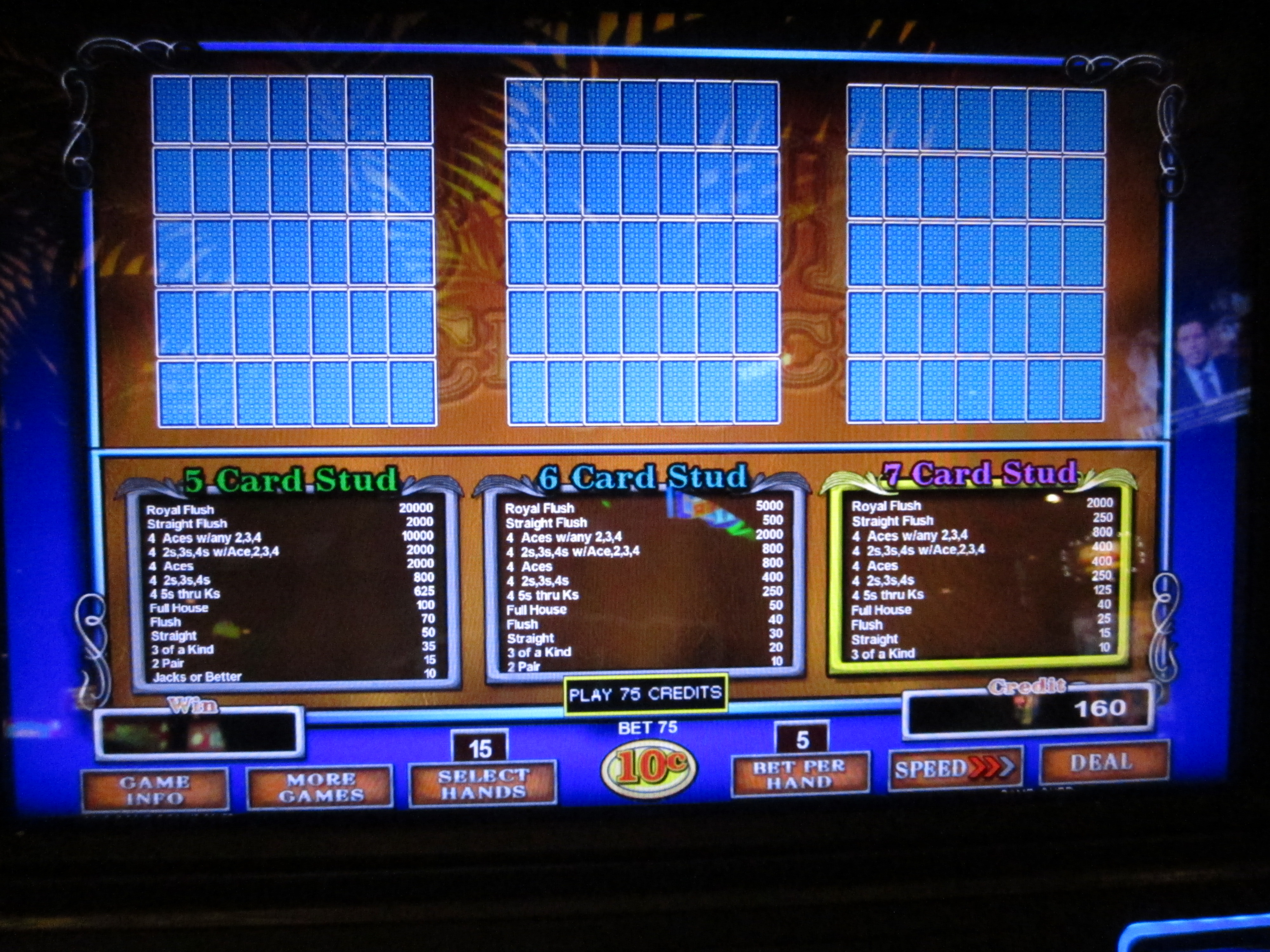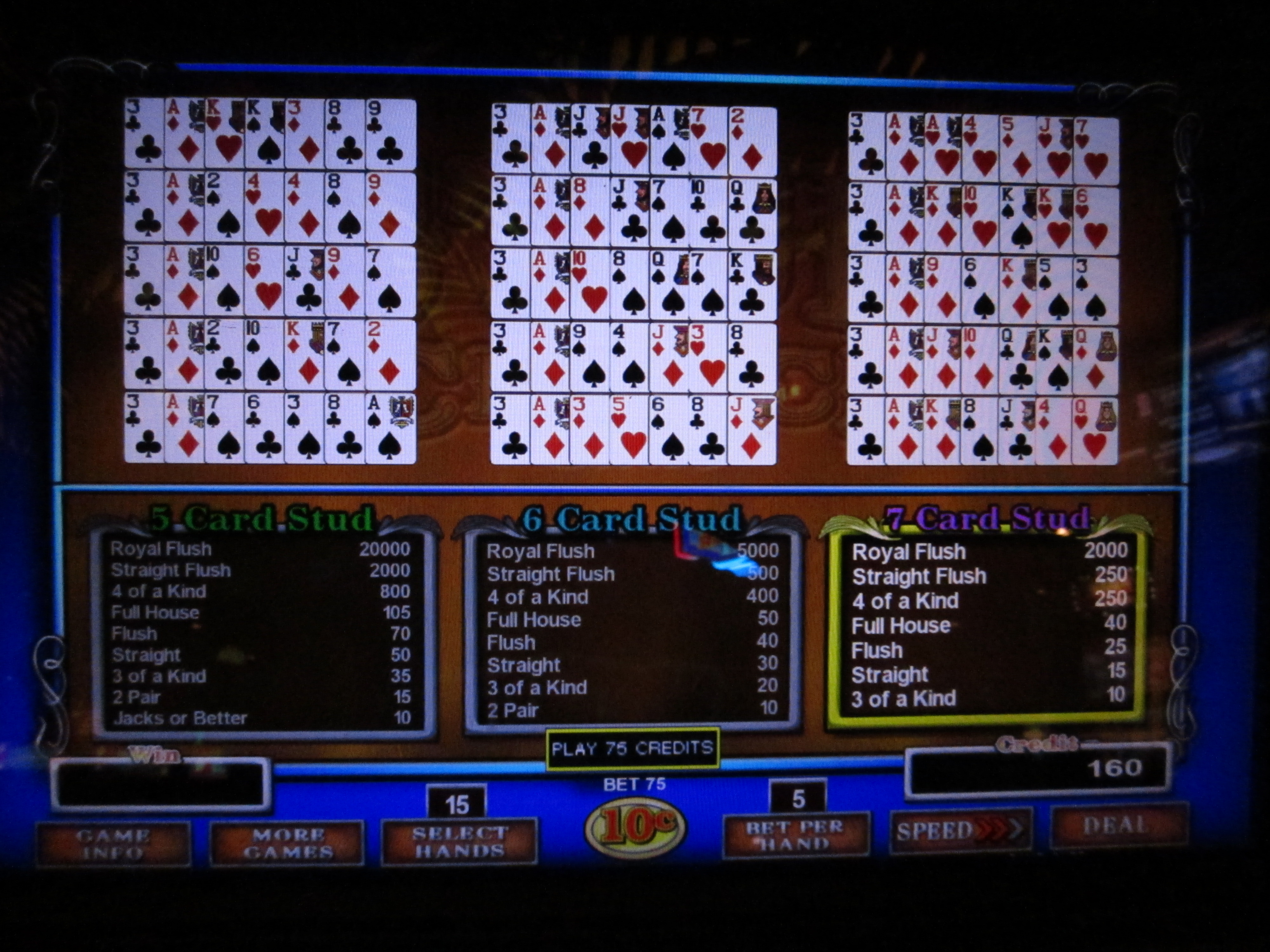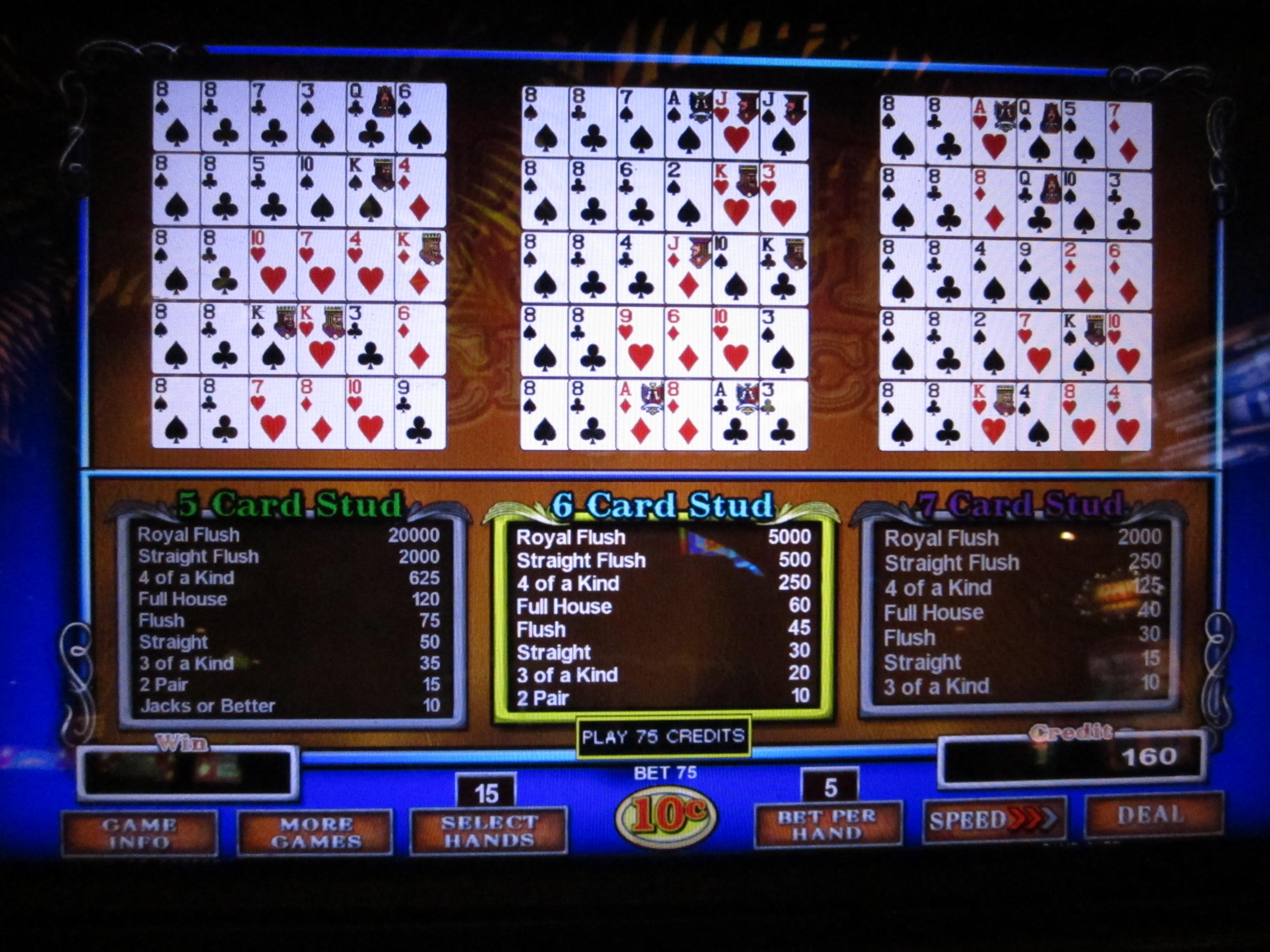 - ゲームは、選択されなかったハンドの2枚を含む残りの50枚のカードを、プレイヤーがベットしたハンドの数と同じ数のデッキに複製します。その後、プレイヤーが5カード、6カード、または7カードスタッドのいずれかを選択したかどうかに応じて、ランダムにカードを配り、各ハンドを完成させます。