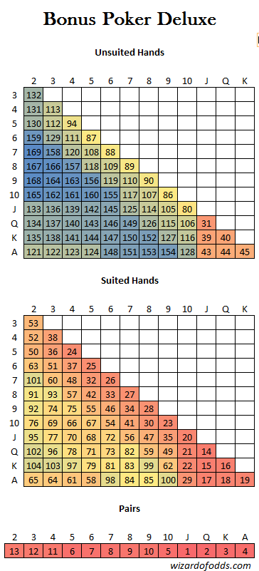 以下の戦略は、以下のペイテーブルを持つBonus Poker Deluxeゲームに適しています。勝利金は、1ハンドあたり5コインを賭けた場合のコイン1枚あたりの金額で表されます。