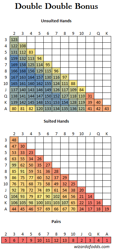 以下の戦略は、以下のペイテーブルを持つダブルダブルボーナスゲームに適しています。勝利金は、1ハンドあたり5コインを賭けた場合のコイン1枚あたりの金額で表されます。