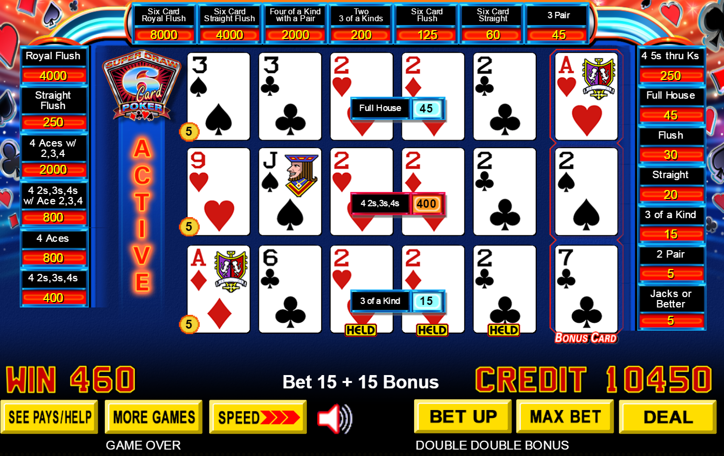 ドローではトップハンドがフルハウスに進化し、45コインを獲得しました。ミドルハンドでは6枚目のカードのおかげで4デュースに進化し、400コインを獲得しました。ボトムハンドはスリーカードのままで、15コインでした。合計で45+400+15=460コインを獲得しました。