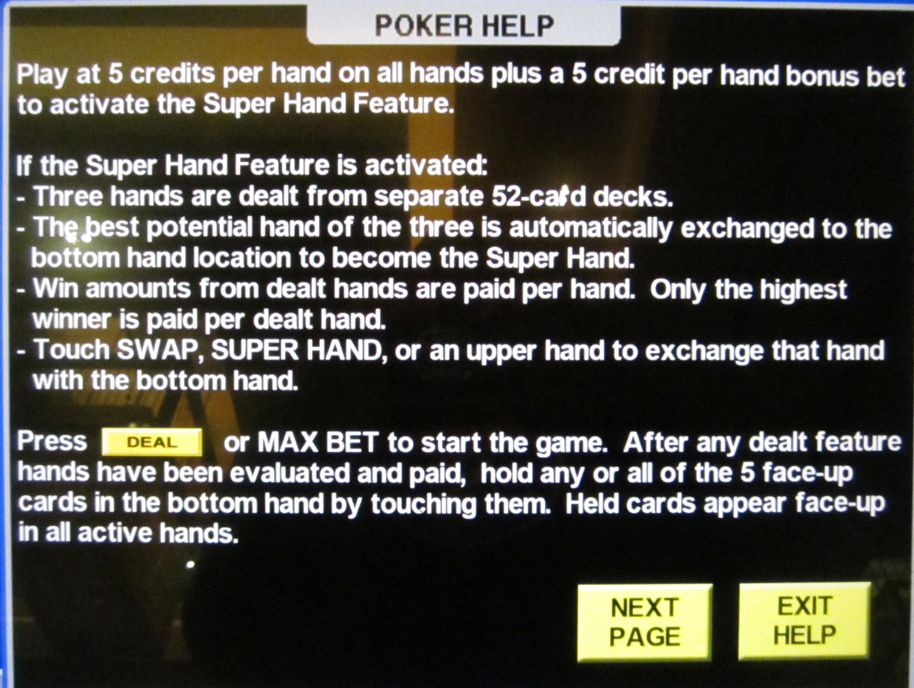 スーパーハンドポーカーを初めて見たのは、2015年のグローバル・ゲーミング・エキスポでした。2回目は、2016年1月23日にラスベガスのレッドロック・カジノで見ました。このゲームは、プレイヤーが3つのスターティングハンドから1つを選んでプレイする点を除けば、トリプルプレイ・ビデオポーカーと似ています。