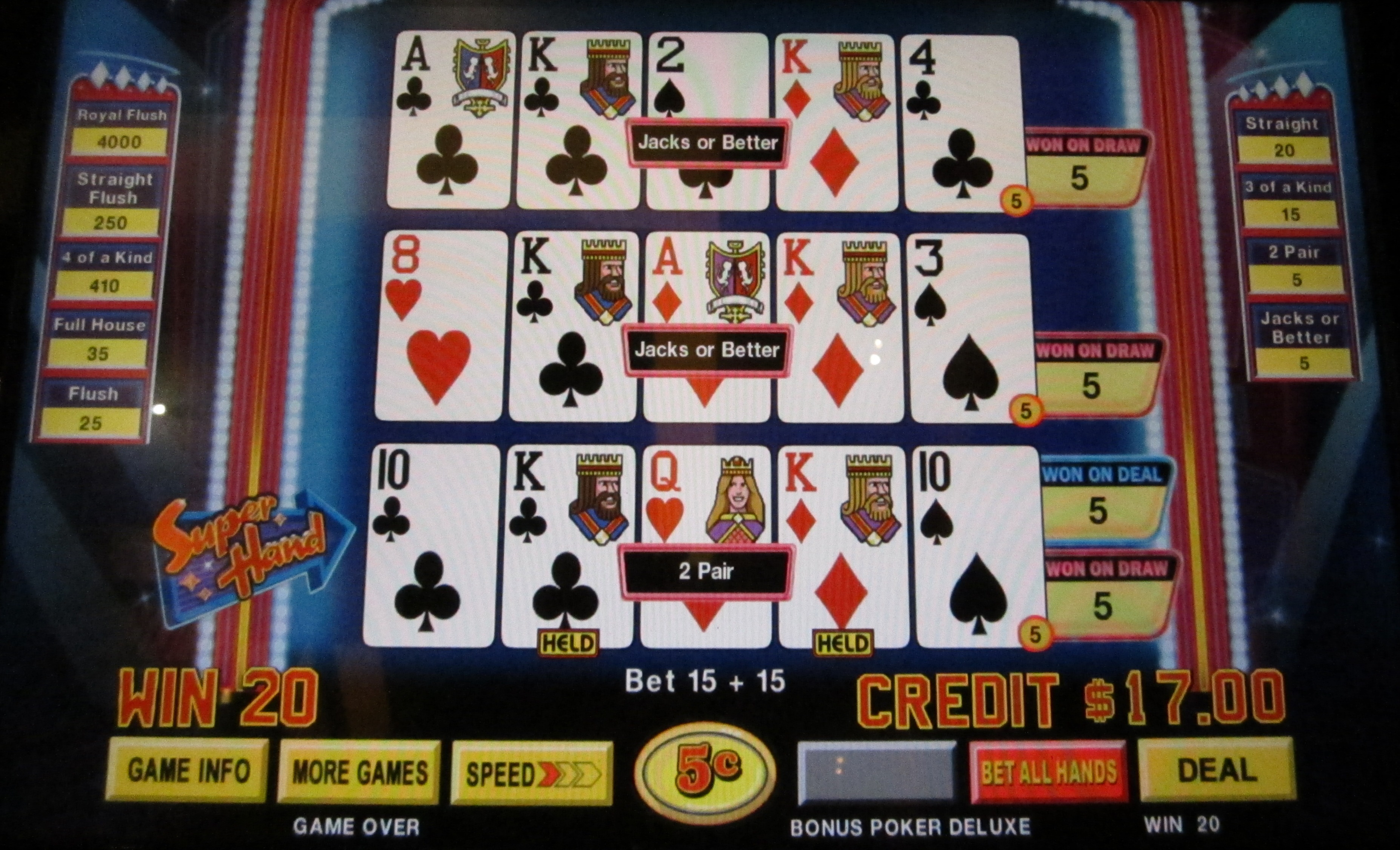 私はキングのペアを持っていましたが、ボトムハンドではツーペアに改善し、他の2つはハイペアのままでした。ドローはそれぞれ5クレジットで、合計15クレジットでした。ディールとドローの両方を数えると、私の「勝ち」は5+15=20クレジットでした。ベットに30クレジットかかったことを考えると、実際には10クレジットの損失でした。