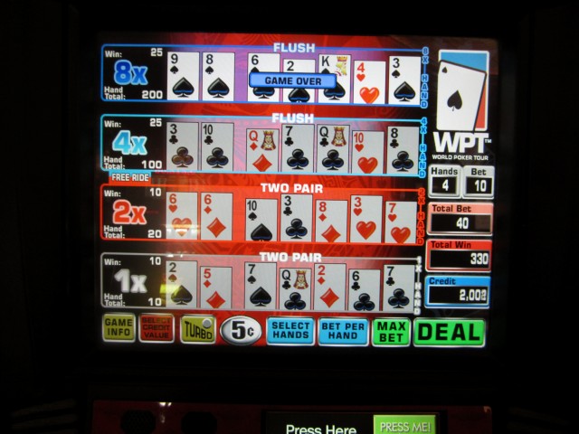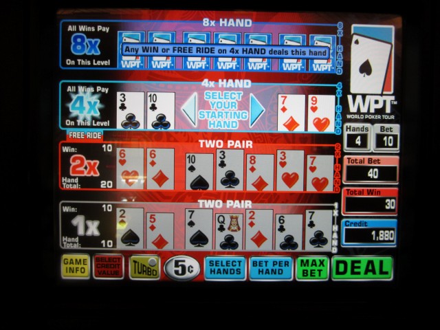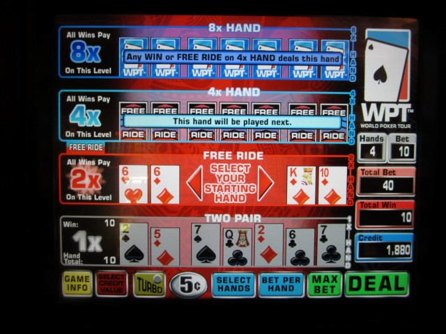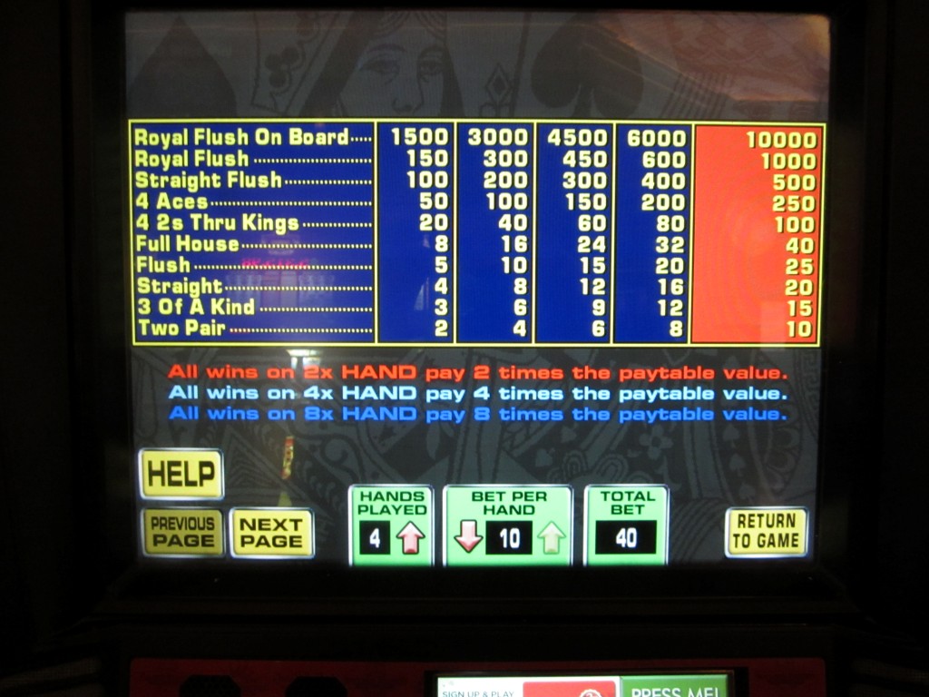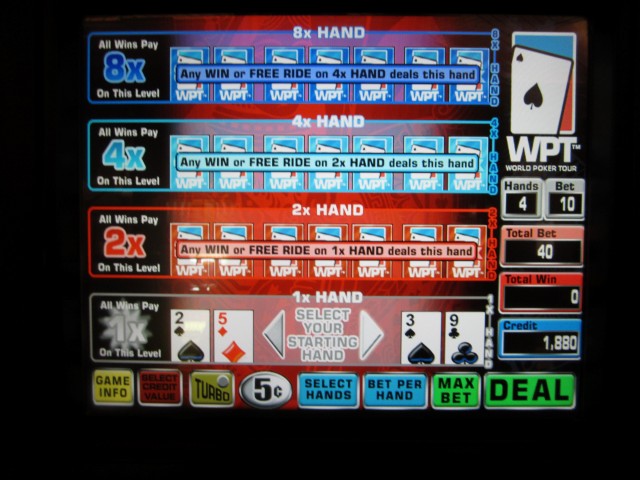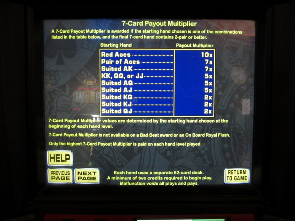 このゲームは、カジノゲームの最長タイトル記録を更新したと思います。「ワールドポーカーツアー マルチストライク スーパービデオホールデム」です。ちょっと長すぎるので、「スーパービデオホールデム マルチストライク」と呼ぶことにします。2011年後半に発売されたと思います。このゲームを見つけるのは簡単ではありませんが、2012年10月時点で、レッドロックカジノのカフェの近くに2台設置されていたことは知っています。このゲームは、テキサスホールデム、スーパービデオホールデム、そしてマルチストライクポーカーを組み合わせたものです。もしそれでもわからない場合は、完全なルールはこちらです。