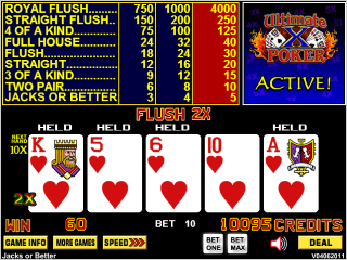 Ultimate Xは人気のビデオポーカーのバリエーションです。プレイヤーが賭け金を2倍にすると、ペイテーブルに基づいて配当が支払われるだけでなく、次のハンドにマルチプライヤーが加算されます。このページでは、Five StarマシンでプレイできるUltimate-Xポーカーのシングルラインバージョンについて解説します。マルチラインバージョンについては、別のページをご覧ください。