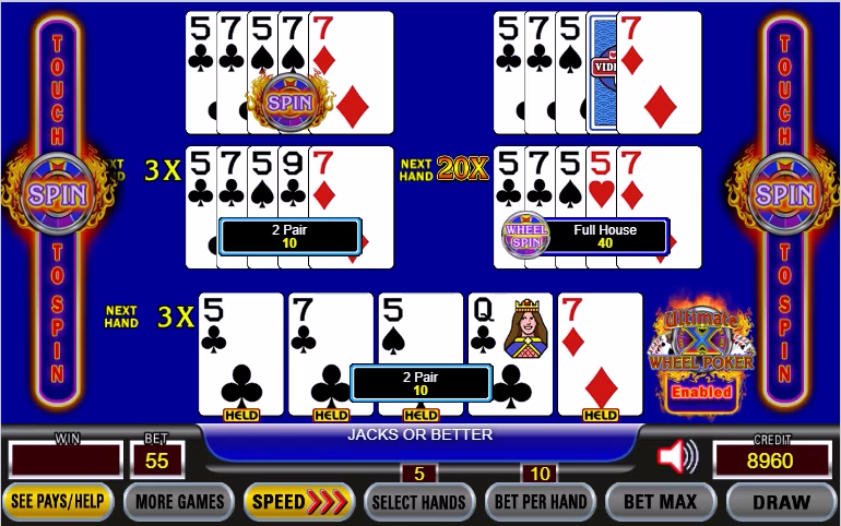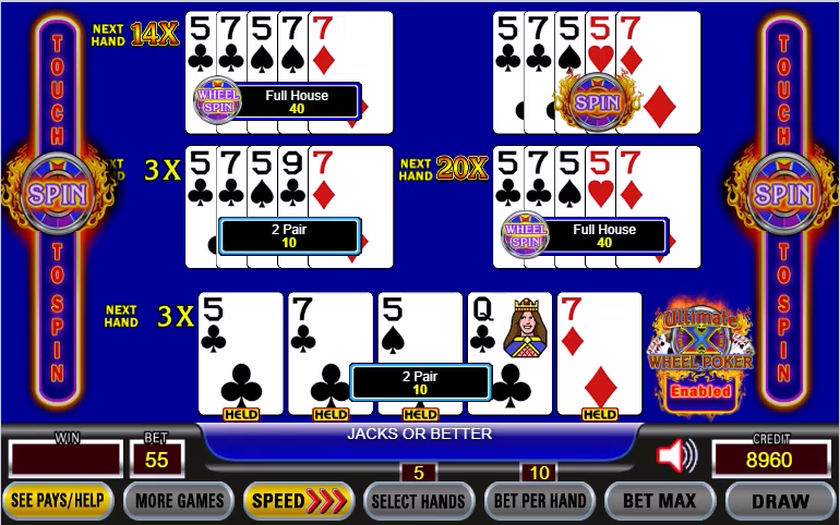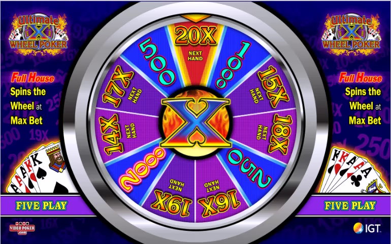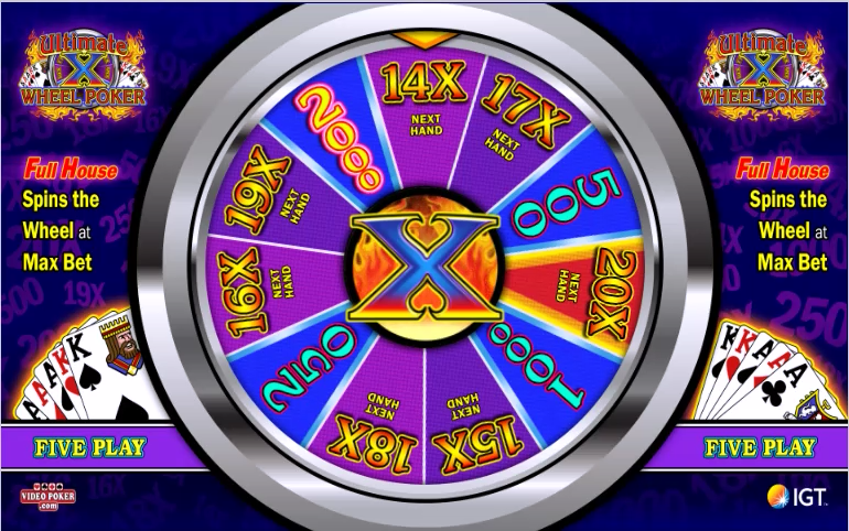 アルティメットXホイールポーカーはマルチラインアルティメットXと同じゲームですが、ワイルドカードのないゲームでは、ドローでフルハウスが揃うと獲得できるマルチプライヤーをプライズホイールに置き換えるために、プレイヤーが追加で5クレジット(合計、プレイごとではありません)を賭けることができます。デュースワイルドゲームでは、ストレートフラッシュでプライズホイールを獲得できます。このプライズホイールは、大きなマルチプライヤーとインスタントウィンを提供します。