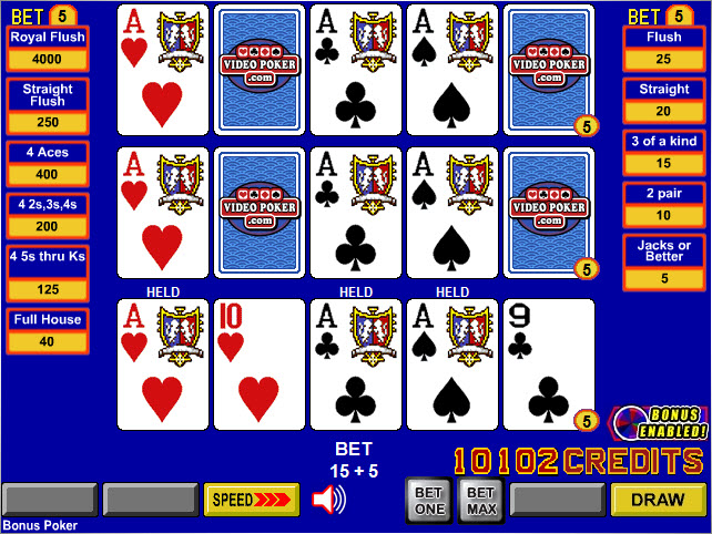 このゲームは、従来の3プレイまたは5プレイのビデオポーカーと同じようにプレイできます。ただし、各ハンドに5コインを賭けるという条件に加え、さらに5コインを賭けることで、ボーナス機能が利用可能になります。具体的には、5コインを賭けた配りで、スリーカード(フルハウスとフォーカードを含む)を含むハンドが成立した場合、プレイヤーはボーナスをプレイできます。