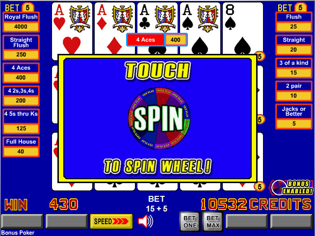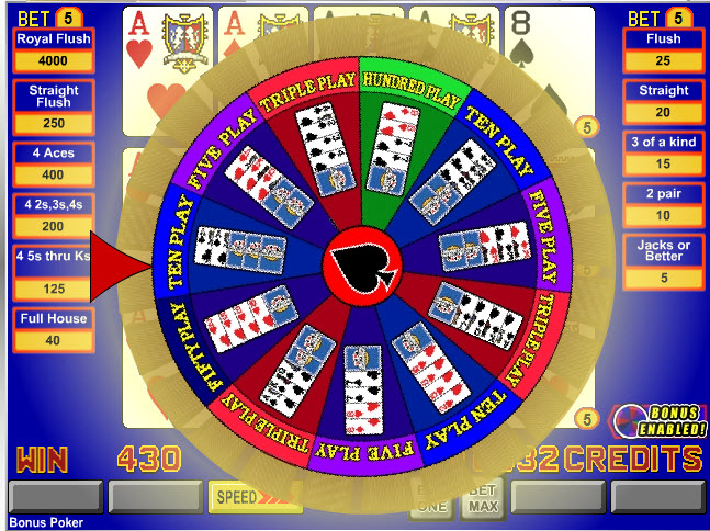 このボーナスでは、ビデオポーカーの11種類のスターティングハンドのうち1つに止まるスピンホイールが使用されます。プレイヤーはそのハンドをプレイし、結果と特別なボーナスペイテーブルに基づいて賞金を獲得します。