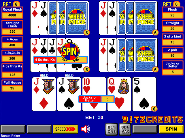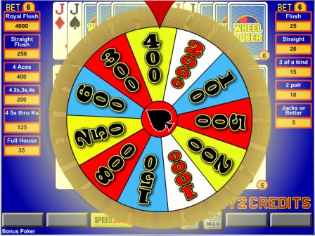 ホイールポーカーは、分かりやすいビデオポーカーのバリエーションです。プレイヤーは通常通り、3人プレイまたは5人プレイでプレイできます。ただし、1ハンドにつき6枚のコインをベットすると、ドローでフォーオブカインドが揃った場合に賞金ホイールを回す権利が得られます。