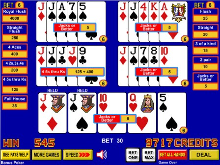 ルールを説明するために、 VideoPoker.comのスクリーンショットをいくつか見てみましょう。ここでは、5プレイボーナスポーカーをプレイしています。1ハンドにつき6コイン、合計30コインを賭けています。