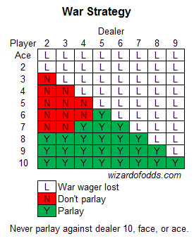 以下の表は、ブラックジャックの賭け金の期待値を、プレイヤーの最初のカードとディーラーの表向きのカードに基づいて、ウォーベットが勝った場合のみ示しています。この表は、ディーラーがソフト17をヒットし、スプリット後のダブルとサレンダーが許可されている、無限デッキに基づいています。表中の「負け」は、プレイヤーが賭け金に負けたため、パーレーの判断ができないことを意味します。プレイヤーは、期待値がプラスの場合、ウォーベットが勝った場合は必ずパーレーを行うべきです。