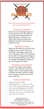 - プレイヤーがウォーベットで勝った場合、(1) 元の賭け金と賞金を受け取るか、(2) 元の賭け金のみを受け取り、その勝利金をブラックジャックの賭け金に加えてパーレーするかを選択できます。