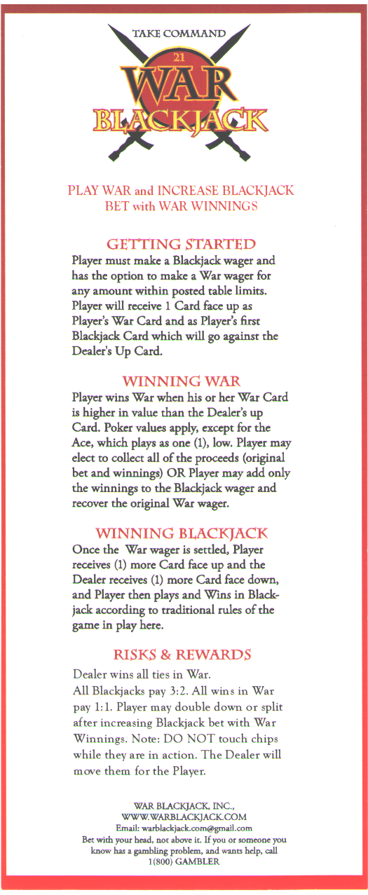 初めてウォー・ブラックジャックを見たのは、2014年5月9日、ラスベガスのダウンタウン・グランドでした。その頃には、カーソンシティ・ナゲットとメスキートのユーレカ・カジノでも開催されていたそうです。このゲームはウォーとブラックジャックを組み合わせたものです。すごいのは、プレイヤーがウォーに勝った場合、自分の最初のカードとディーラーのアップカードを既に知っているため、その勝利金をブラックジャックの賭け金にパーレーできるという点です。