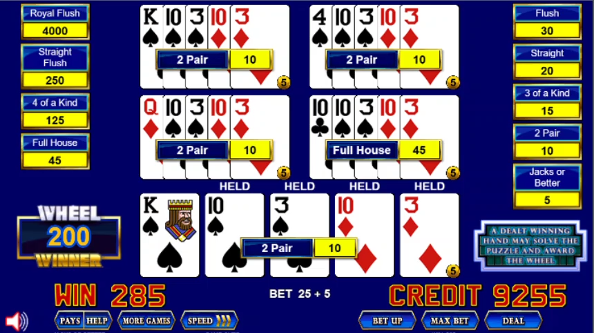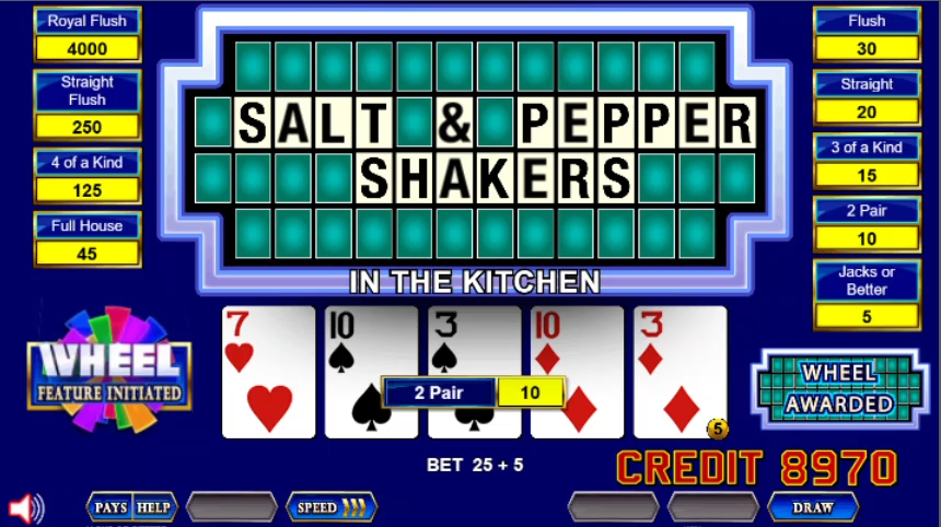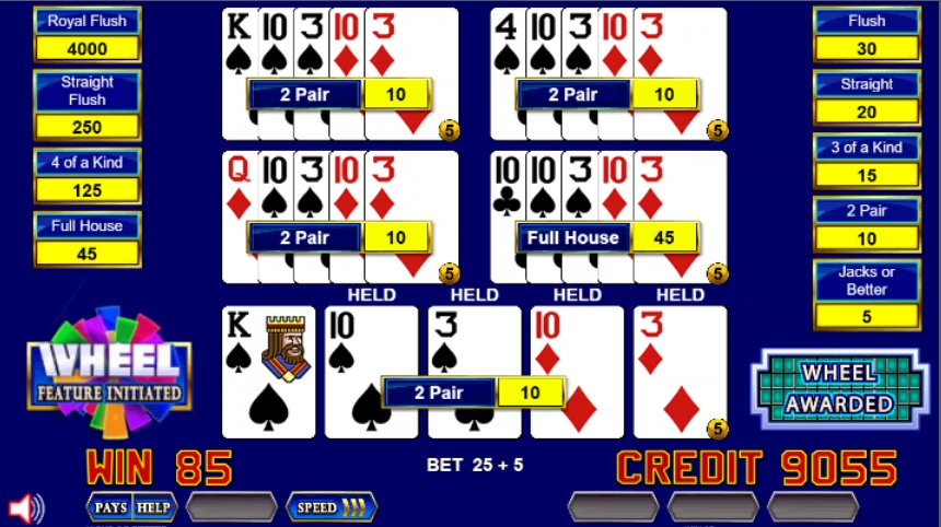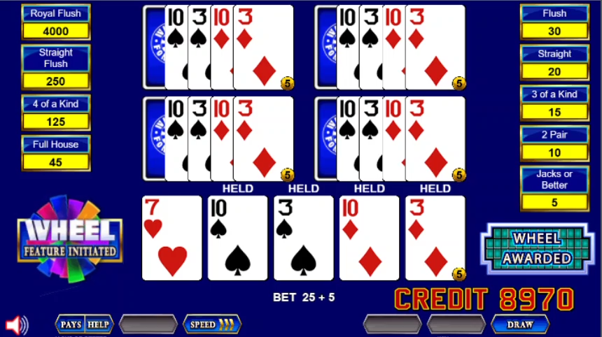 Wheel of Fortune Pokerは、マルチプレイマシンをベースにしたビデオポーカーの一種です。通常、1プレイあたり1~5クレジットを賭けてプレイします。追加で5クレジット(1プレイあたりではなく、合計5クレジット)を賭けると、ホイールスピンで勝利するチャンスがあります。
