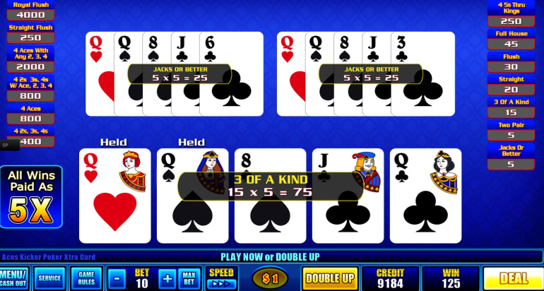 上の画像では、プレイヤーは1プレイに賭けました。クイーンのペアを保有した後、ゲームはプレイヤーに2つの追加ハンドと5倍のマルチプライヤーを与えました。3つのハンドのうち1つはスリー・オブ・ア・カインドに進化し、残りの2つはハイペアのままでした。合計賞金は5×(5 + 5 + 15) = 75でした。